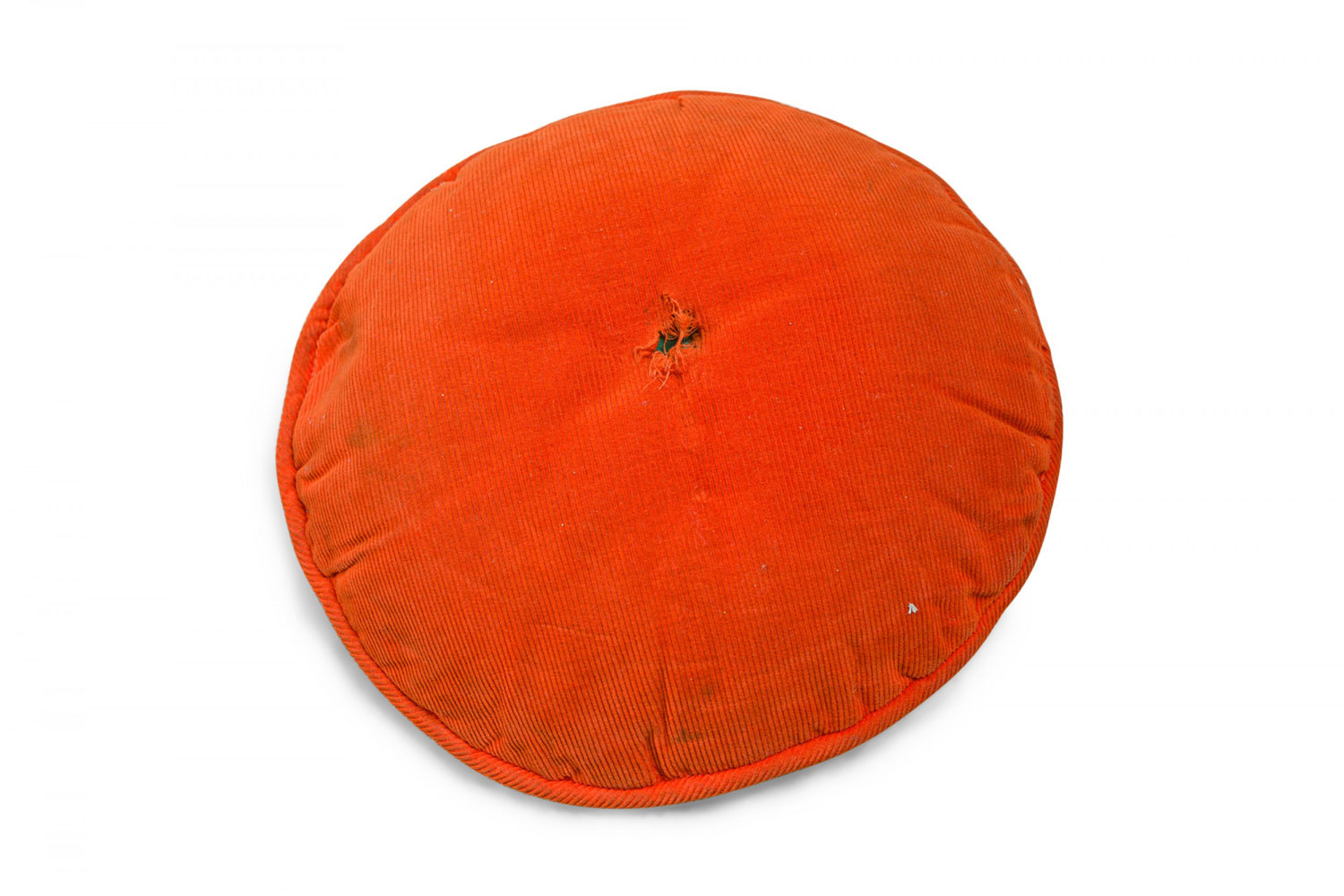 Italian Mid-Century basket chair with a conical form, supported by three iron legs with a small orange cushion..