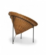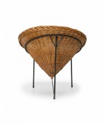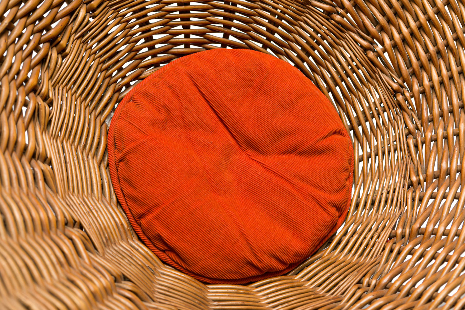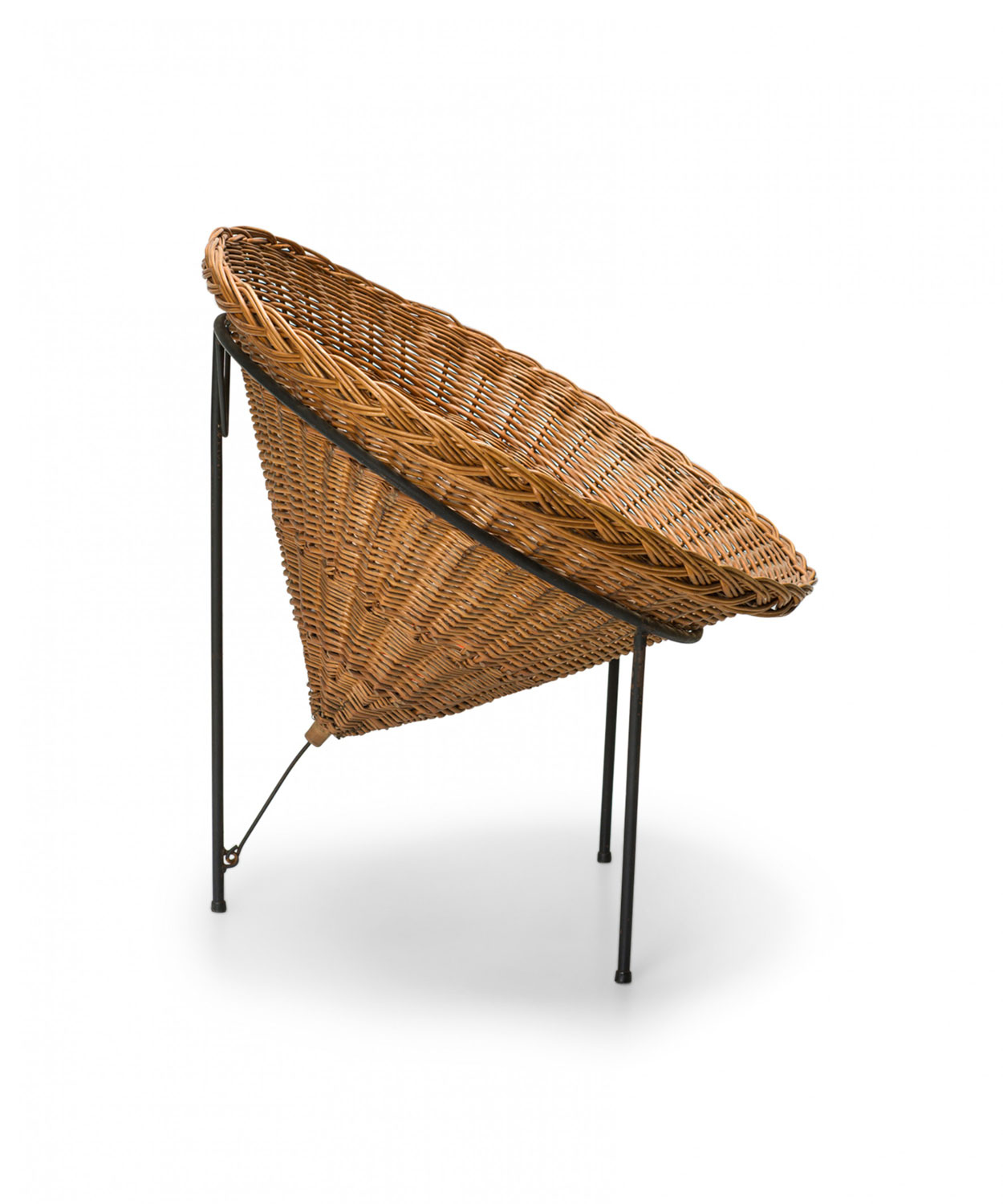 Italian Mid-Century basket chair with a conical form, supported by three iron legs with a small orange cushion.