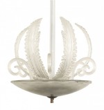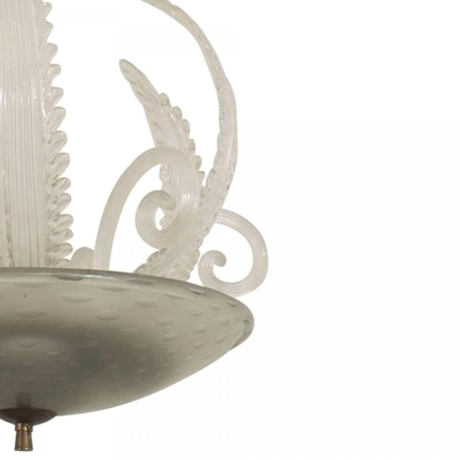 Italian Murano (1940s) frosted glass bowl form shade and canopy with dot design and protruding scrolls & feathers and suspended by a fluted center post. (BAROVIER ET TOSO)