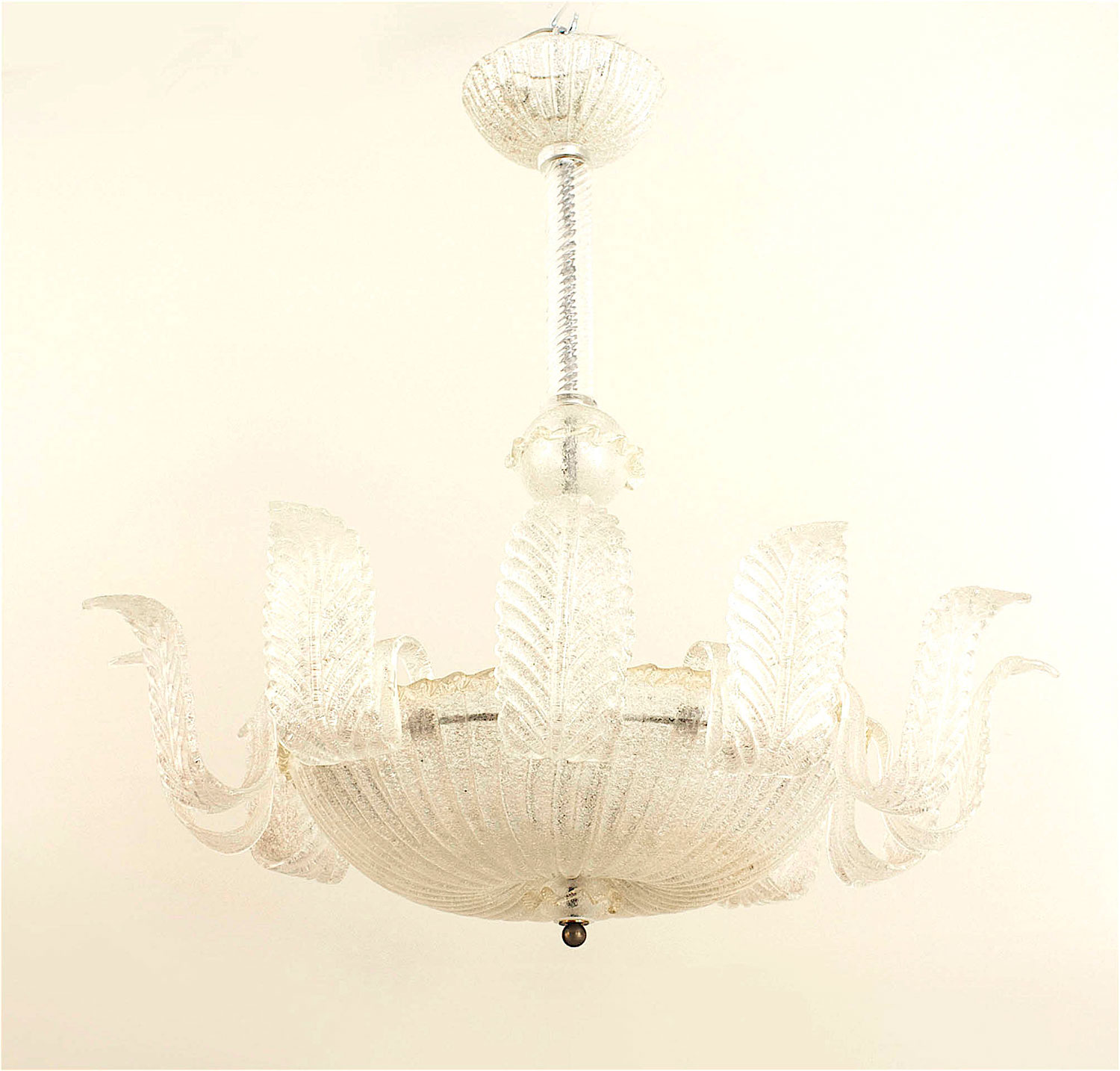 Italian Mid-Century (1940s) Murano gold dusted and textured glass chandelier with 12 large feather form arm emanating from a large internal light bowl base suspended by a 2-tier swirl centerpost. (BAROVIER ET TOSO).