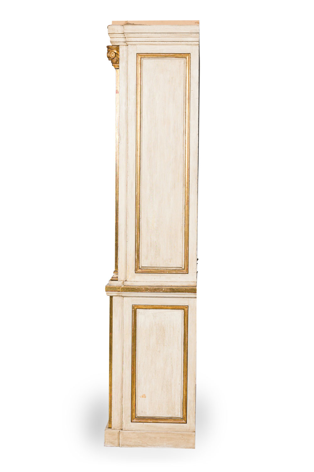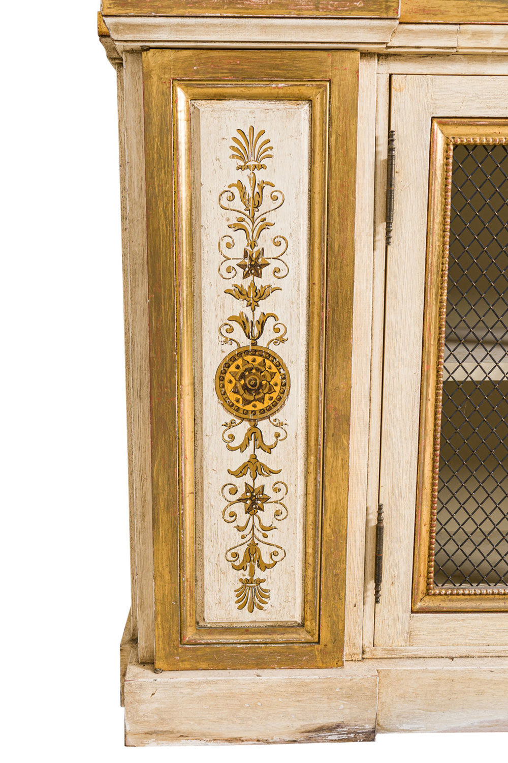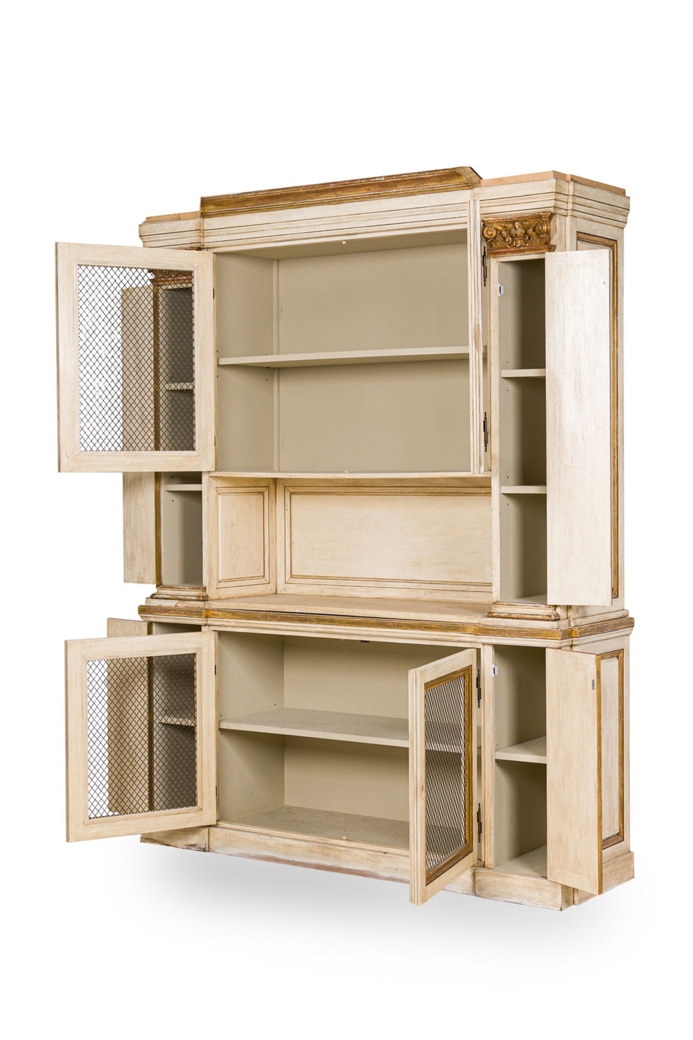 Italian Neo-Classic monumental off-white painted and gilt trimmed breakfront / bookcase having 2 upper and 2 lower doors with a wire mesh centering a recessed platform with column form decorated sides and carved capitals