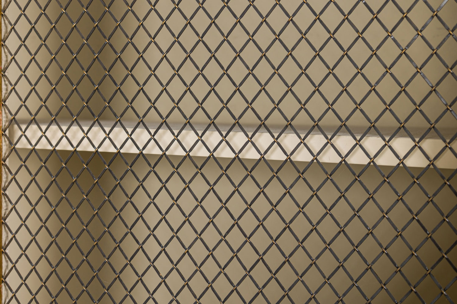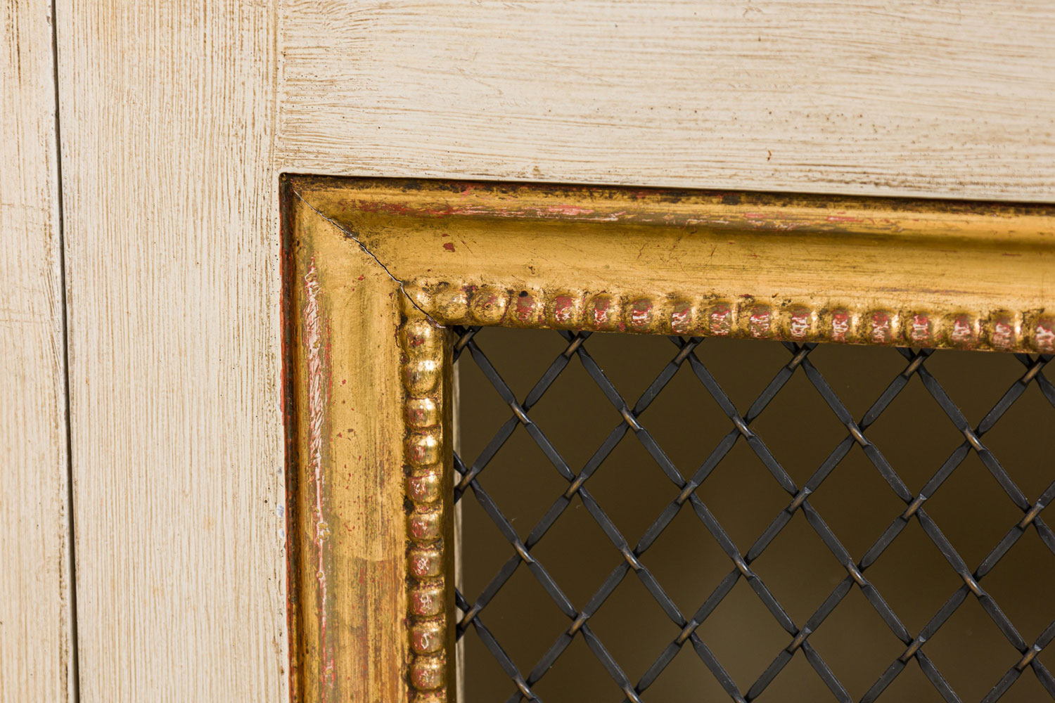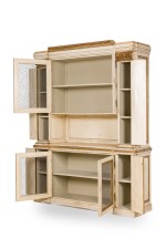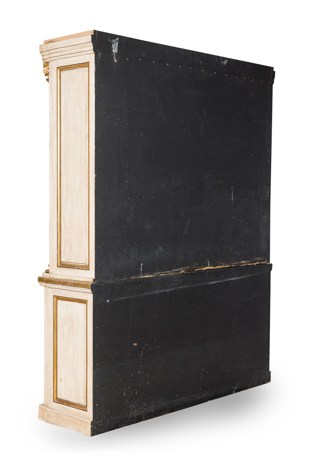 Italian Neo-Classic monumental off-white painted and gilt trimmed breakfront / bookcase having 2 upper and 2 lower doors with a wire mesh centering a recessed platform with column form decorated sides and carved capitals