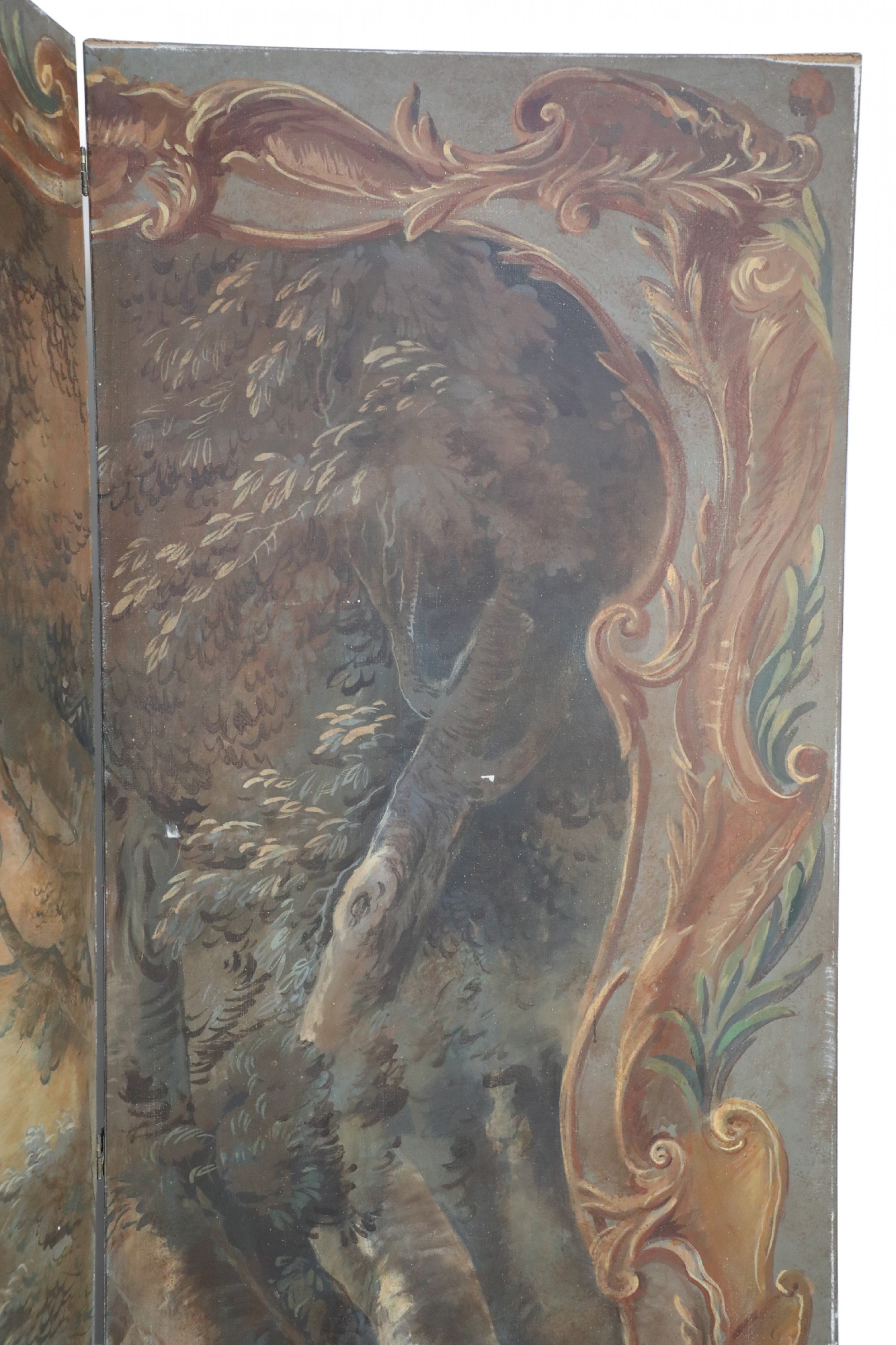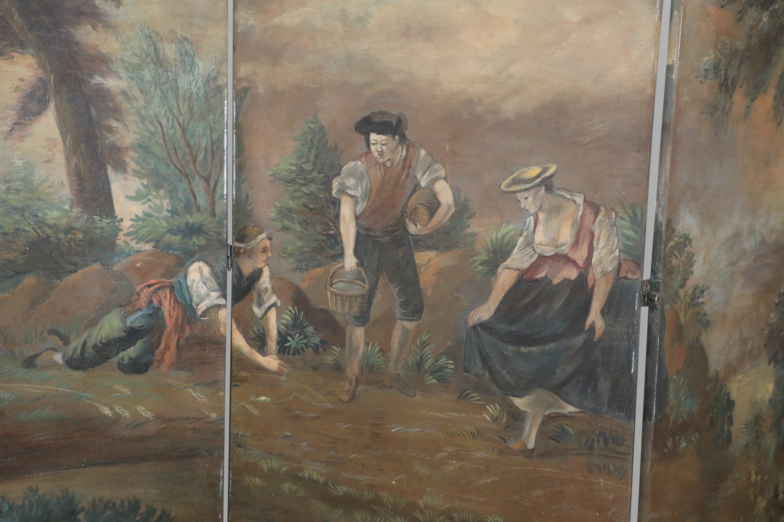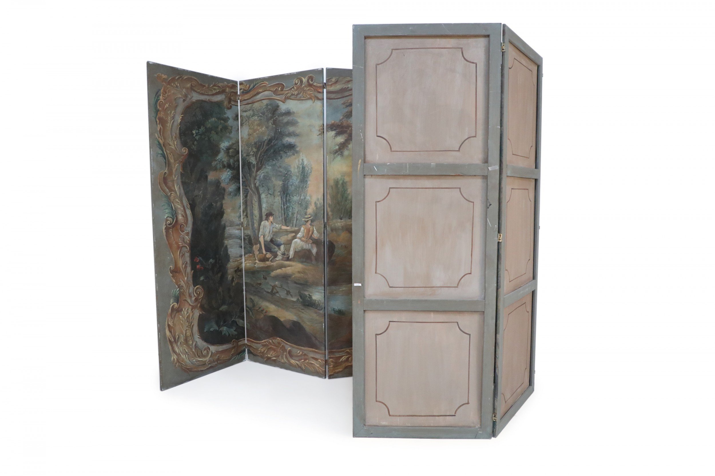 Antique Italian Neo-Classical-style six-paneled canvas folding screen connected with brass hinges and painted with a vignette of figures at a river's edge surrounded by a painted, ornately-carved golden frame (Similar piece: NWL2462)..