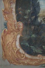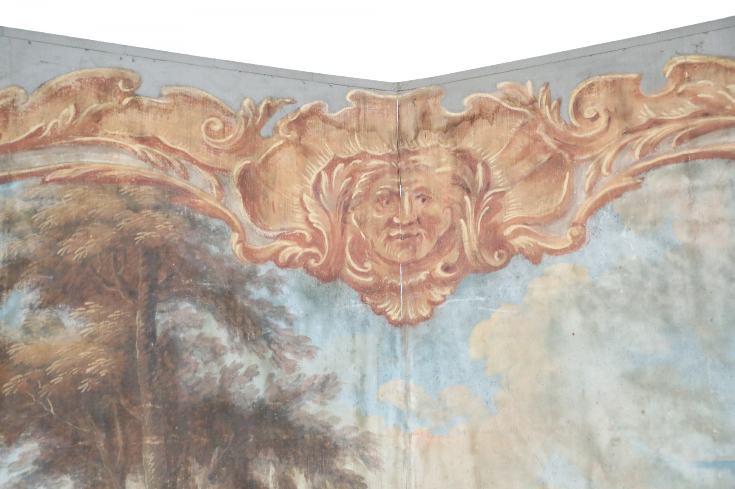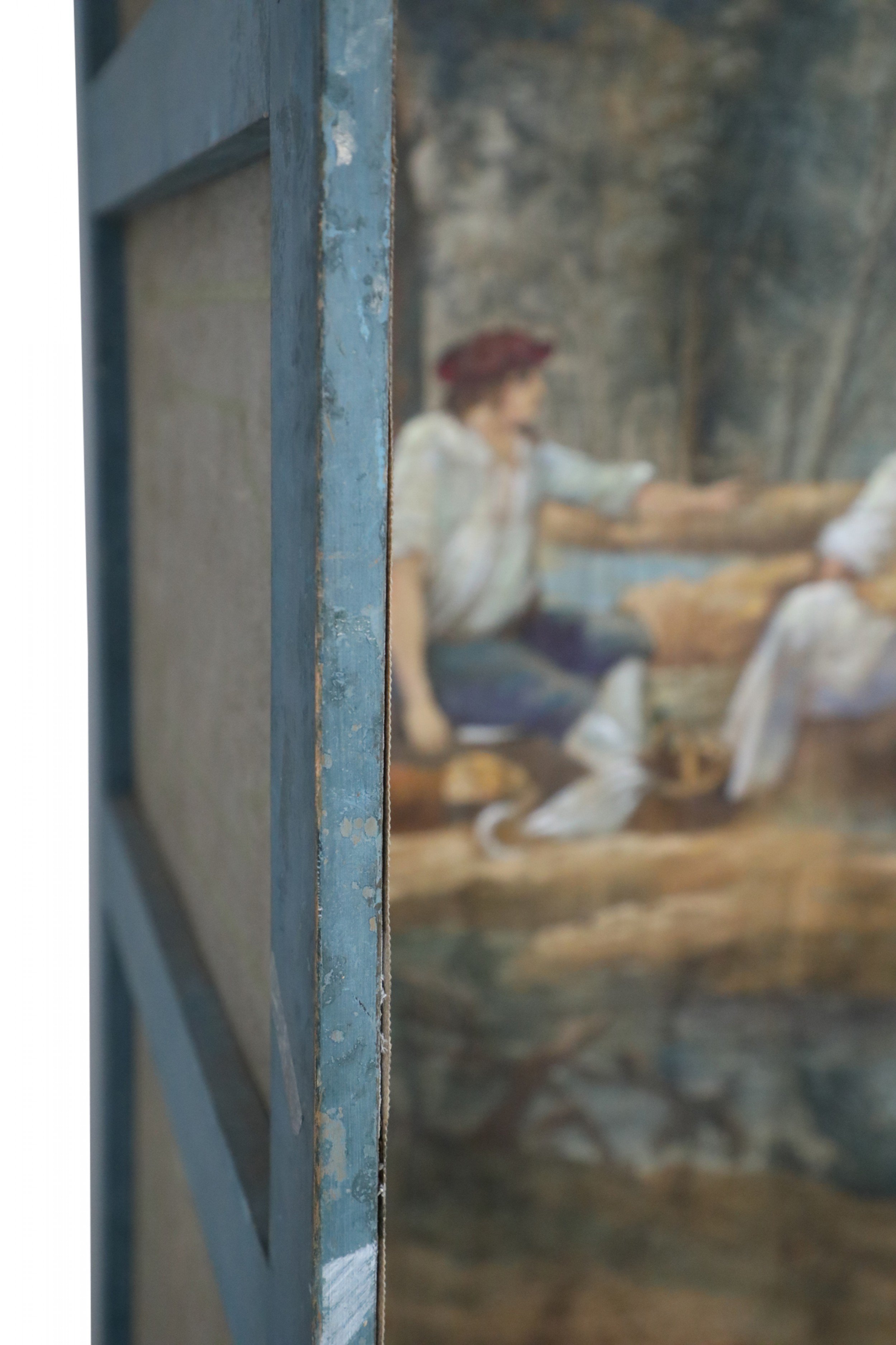 Antique Italian Neo-classical-style six-paneled canvas folding screen connected with brass hinges and painted with a vignette of figures at a river's edge surrounded by a painted, ornately-carved golden frame (Similar piece: NWL2464).