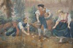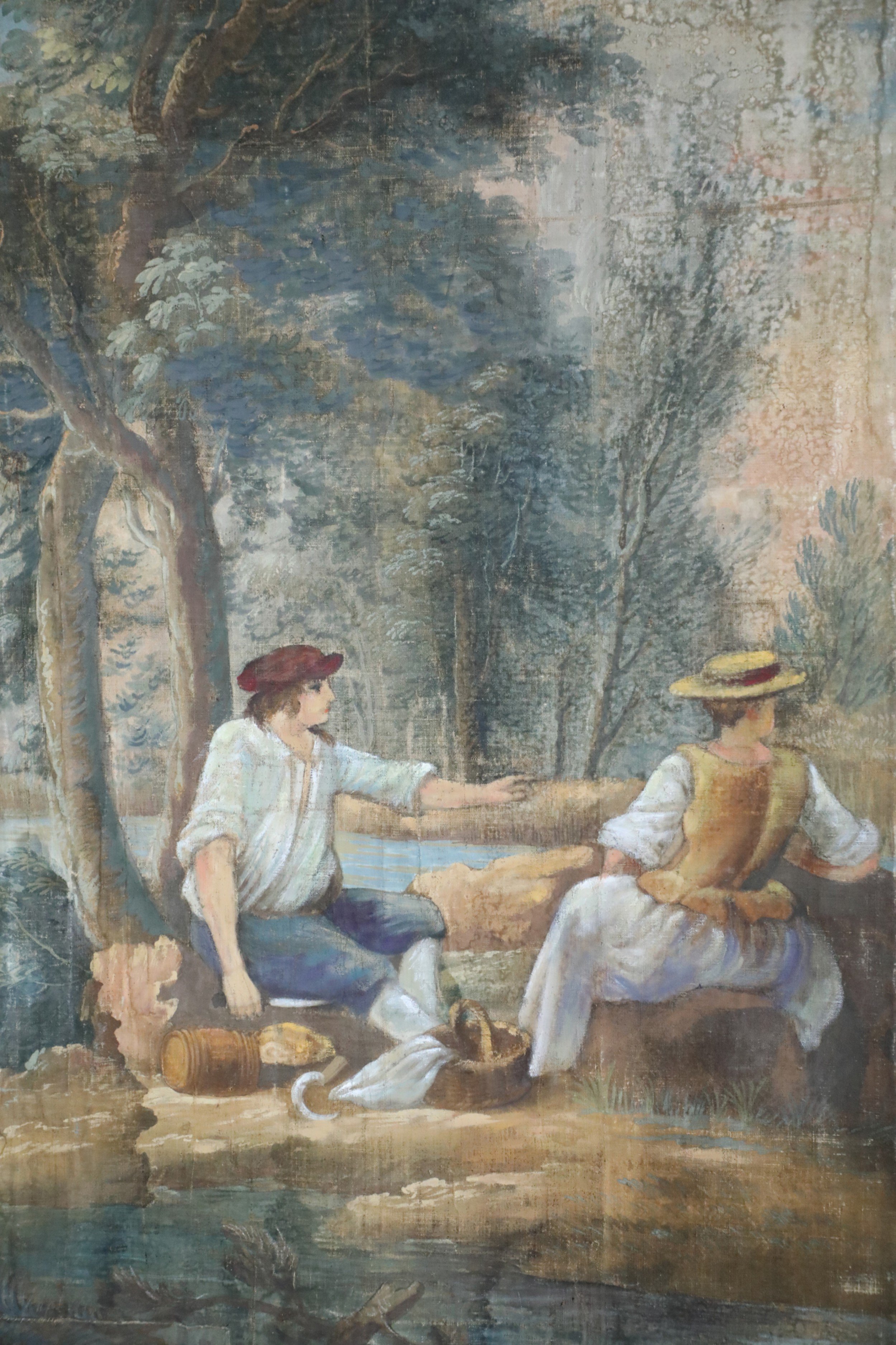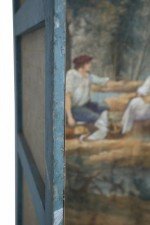 Antique Italian Neo-classical-style six-paneled canvas folding screen connected with brass hinges and painted with a vignette of figures at a river's edge surrounded by a painted, ornately-carved golden frame (Similar piece: NWL2464)..