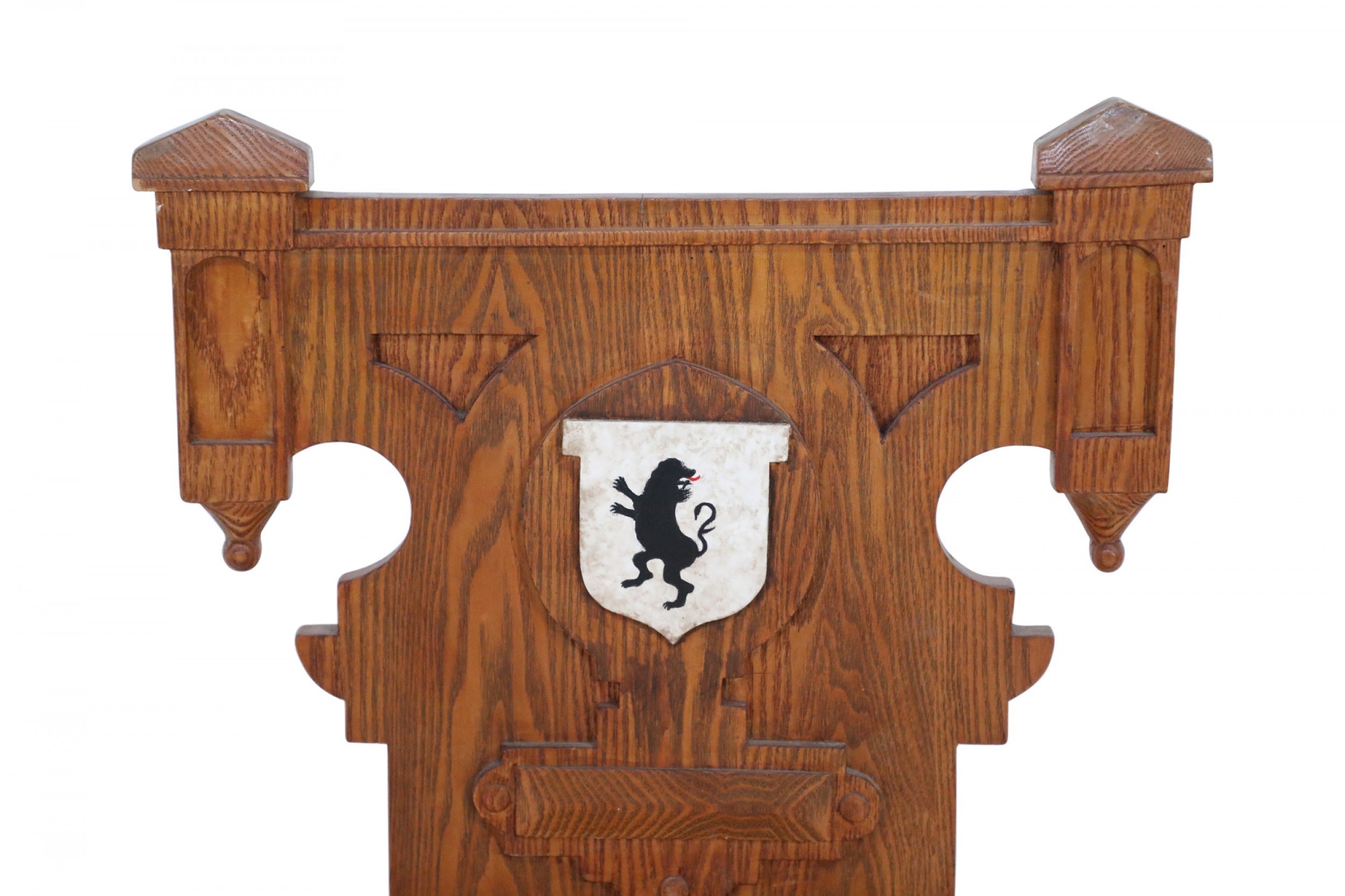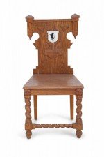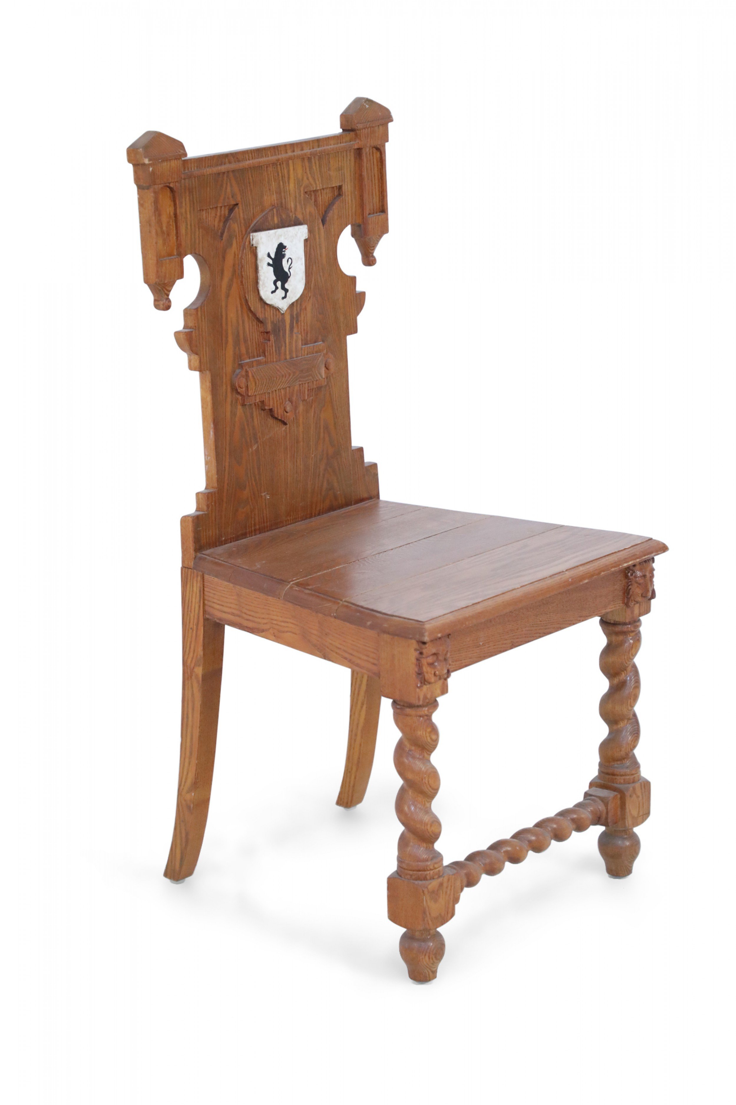 Italian Renaissance-style carved wooden chair with spiral turned front legs and stretcher, rear saber legs, and a back featuring a painted white crest with a central black lion.