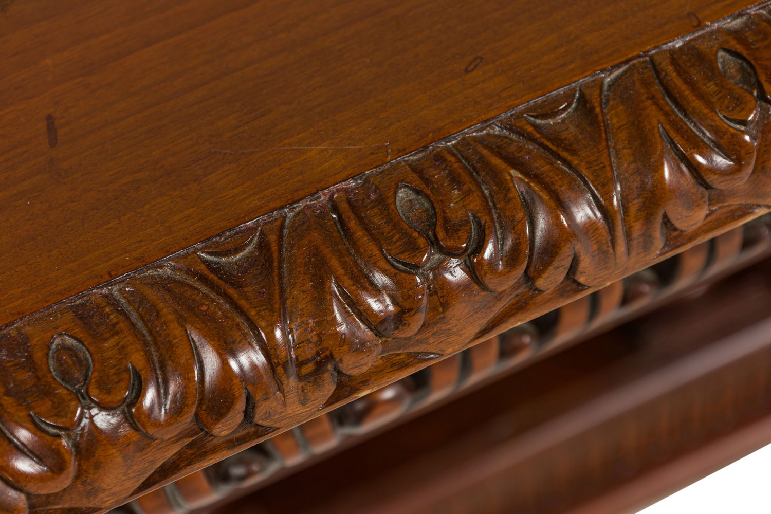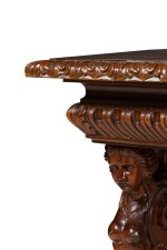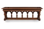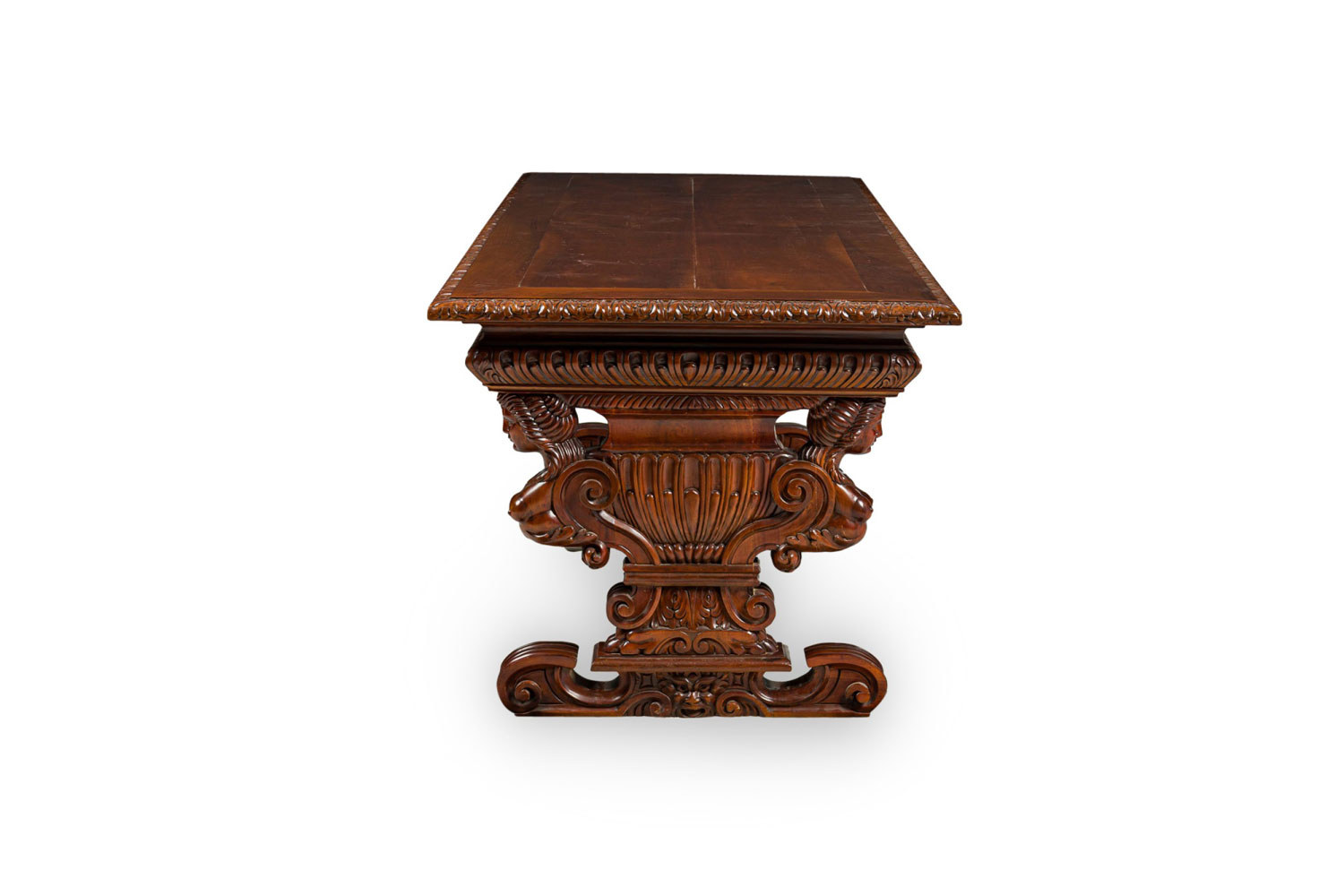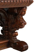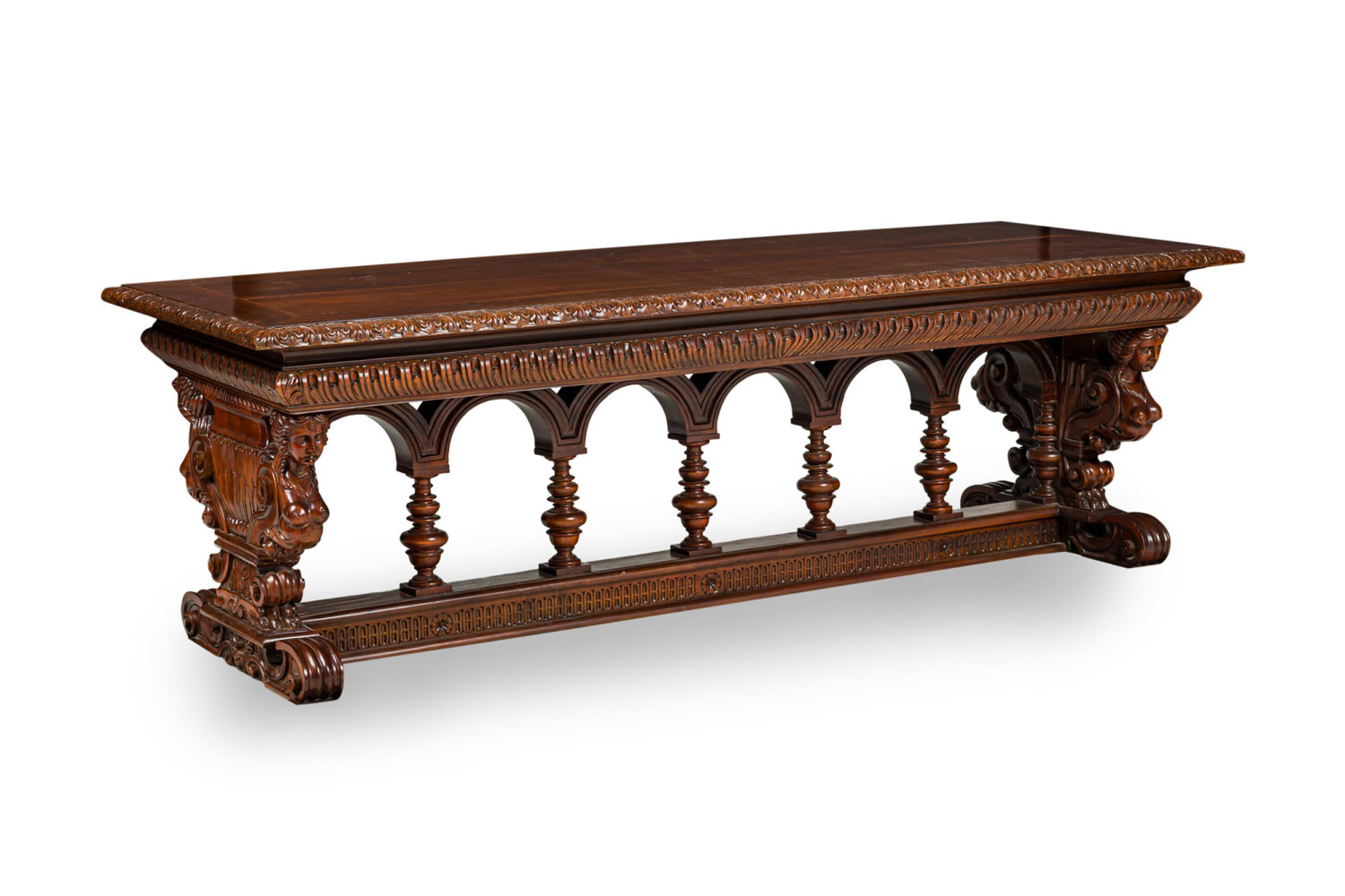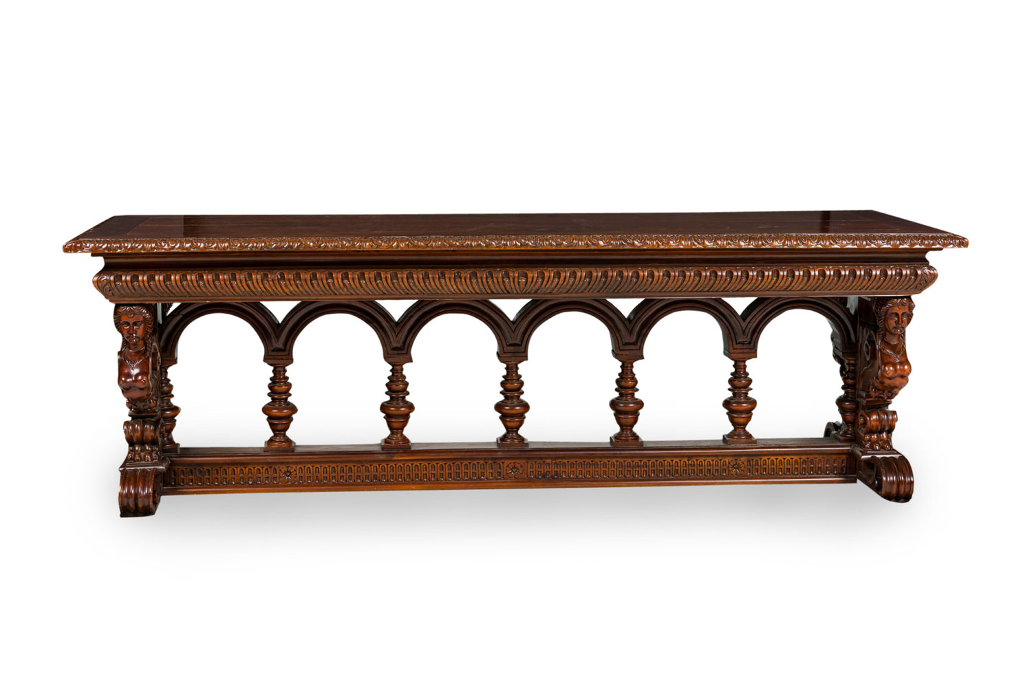 Italian Renaissance Revival (20th Century) long refectory table with deeply carved columnar end supports featuring female figures and ornate urns, connected by an arching balastrade center stretcher