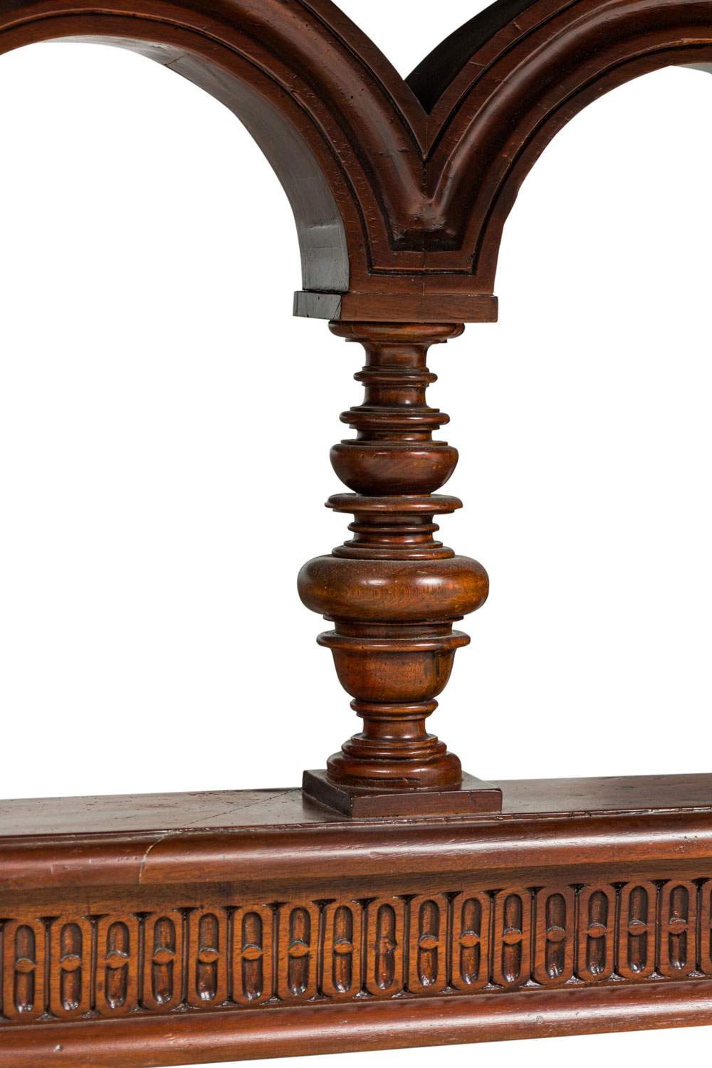 Italian Renaissance Revival (20th Century) long refectory table with deeply carved columnar end supports featuring female figures and ornate urns, connected by an arching balastrade center stretcher.