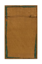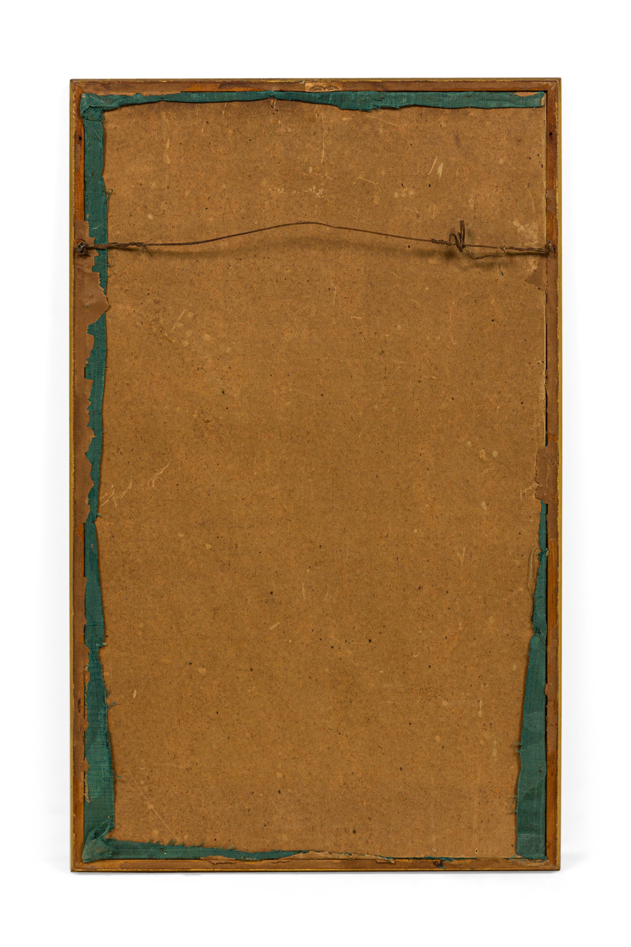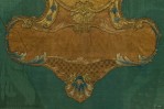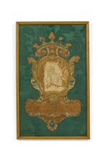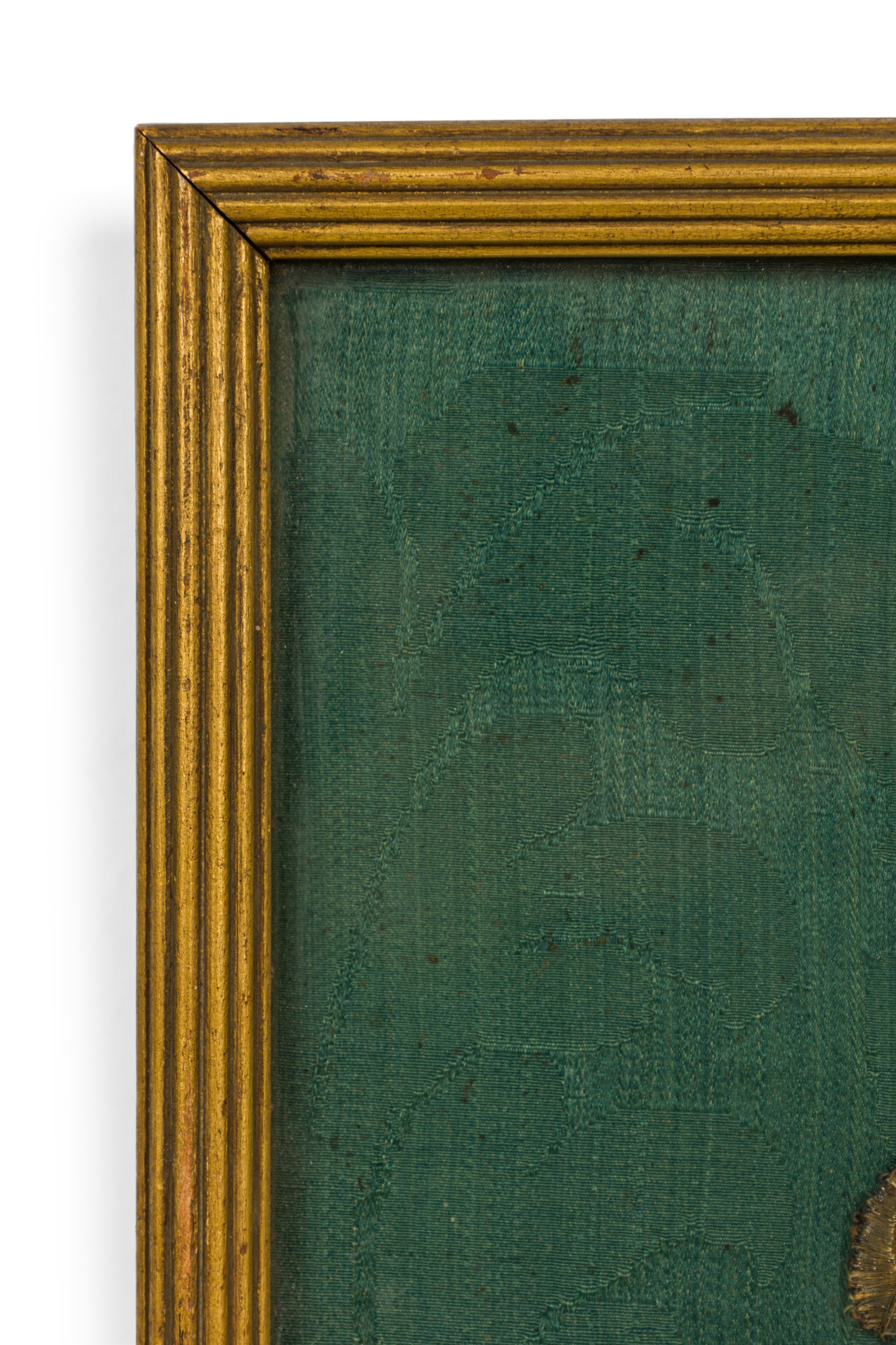 Italian Renaissance gold framed brown and gold embroidery with a green background having a crown like design with a vague print of a women (Similar embroidery-REG9016)