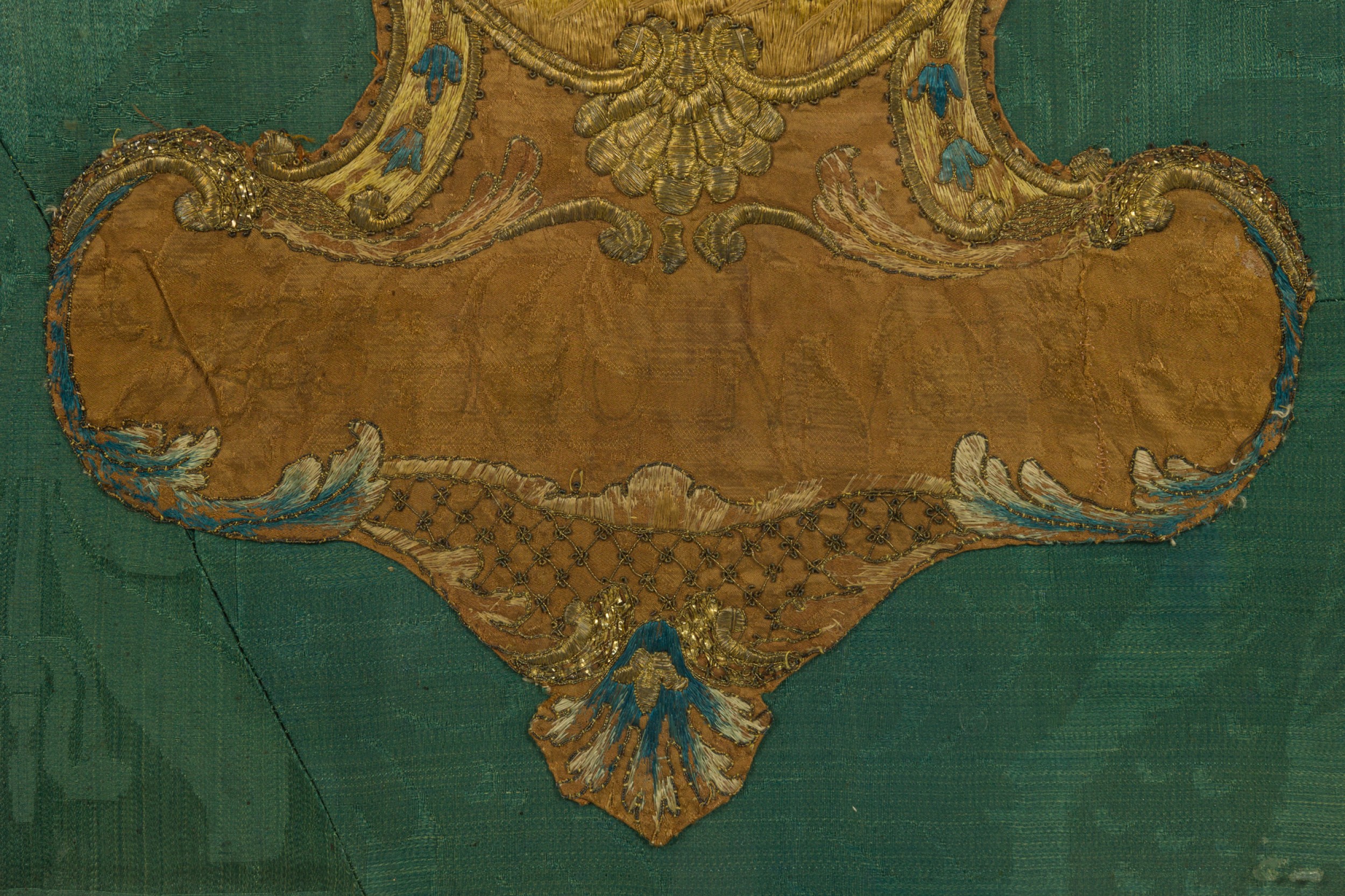 Italian Renaissance gold framed brown and gold embroidery with a green background having a crown like design with a vague print of a women (Similar embroidery-REG9016).