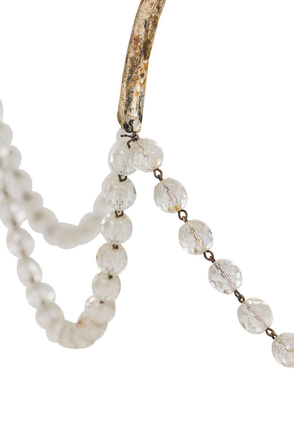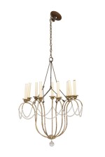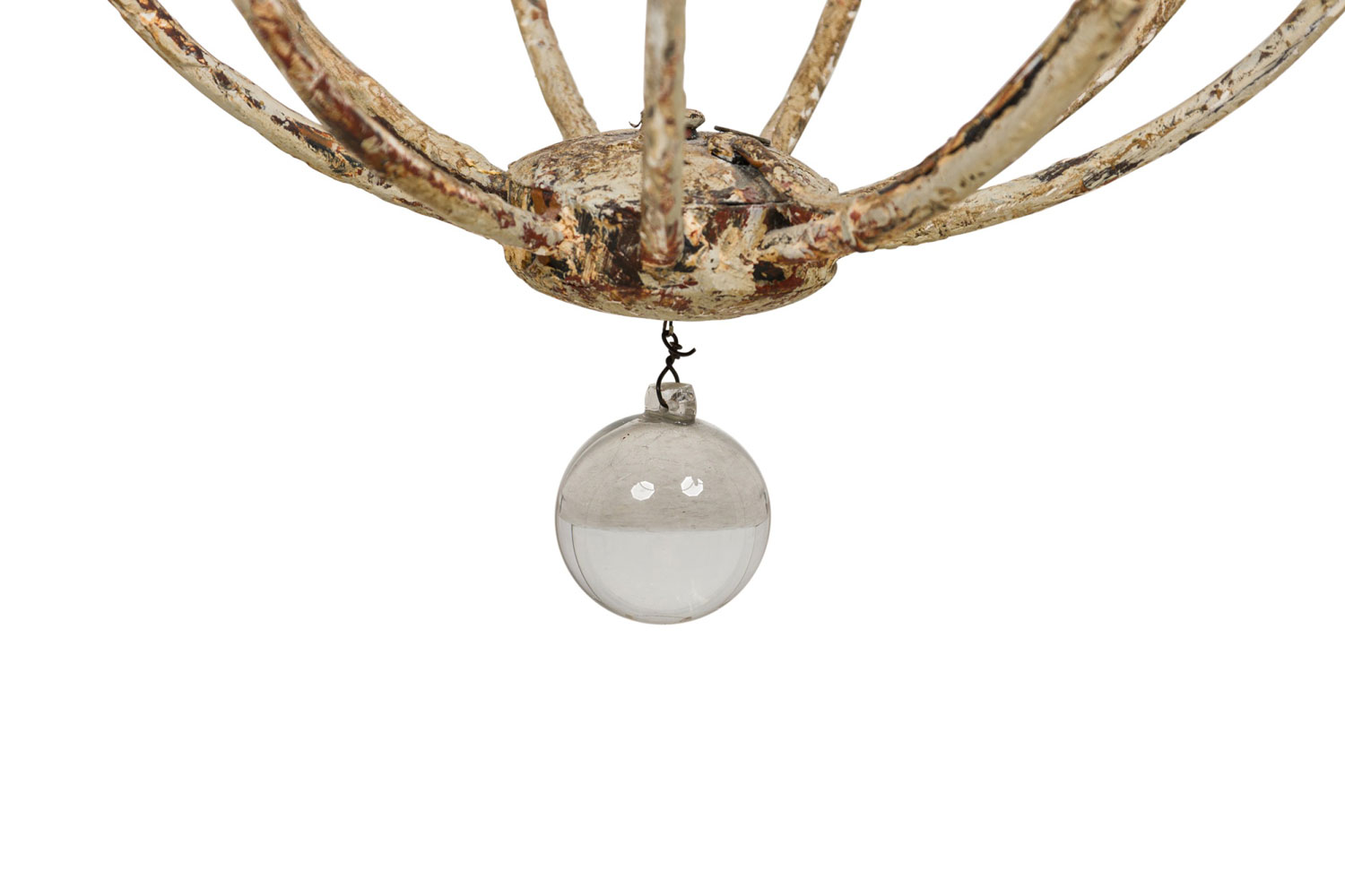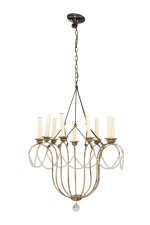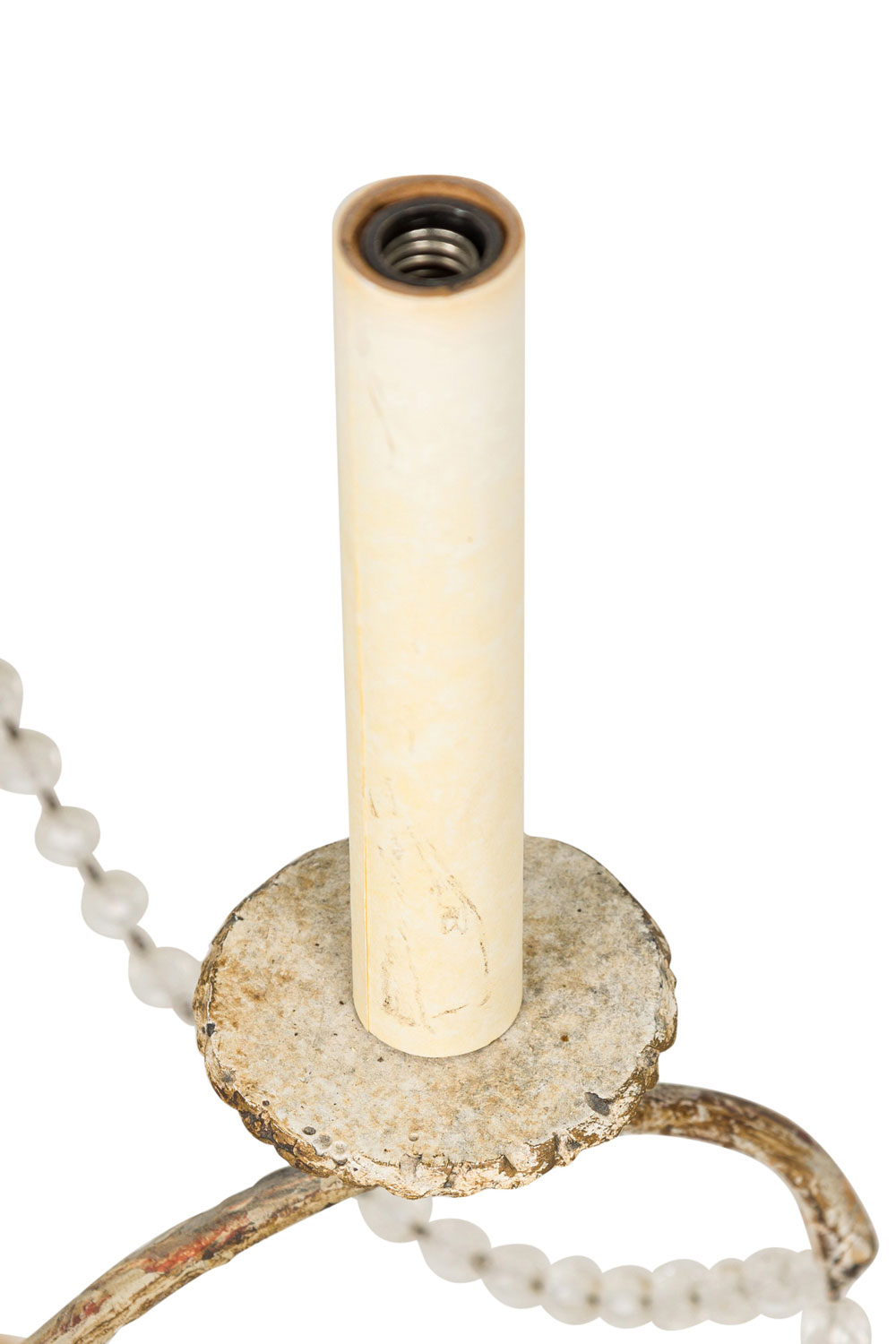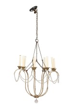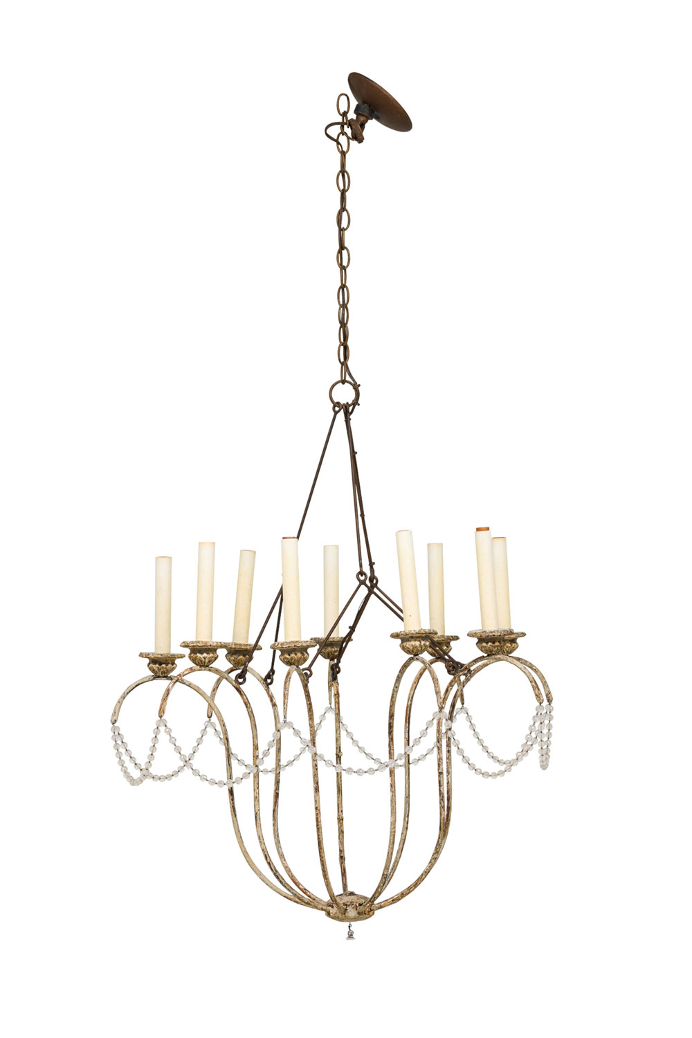 Italian Rococo style (20th Century) chandelier with 9 gilt scroll arm candlestands connected with a swag of glass beads and a bottom glass finial orb suspended by a chain (Marked: NIERMANN WEEKS)