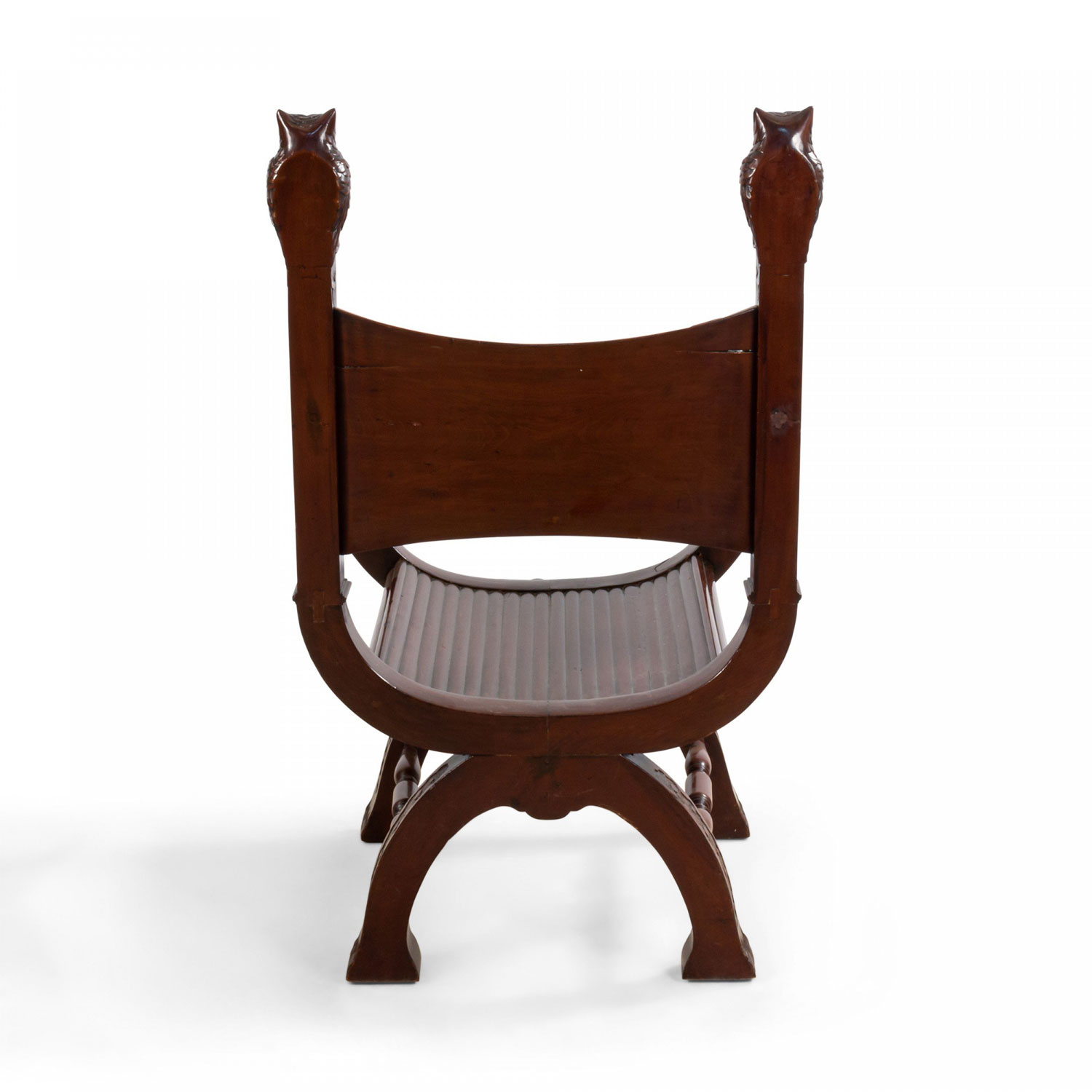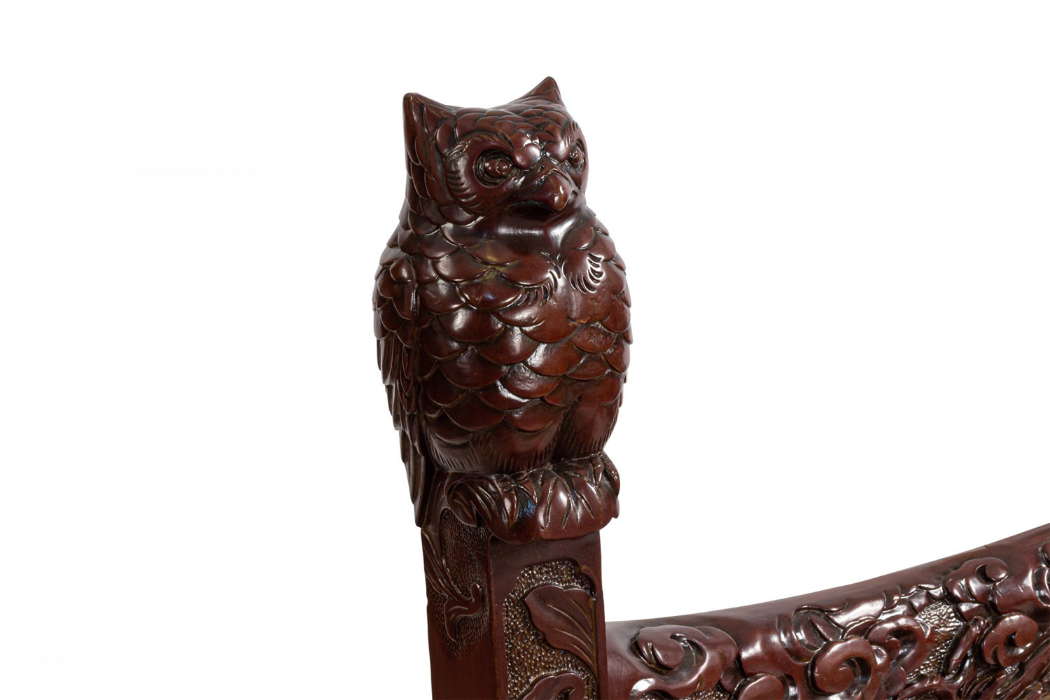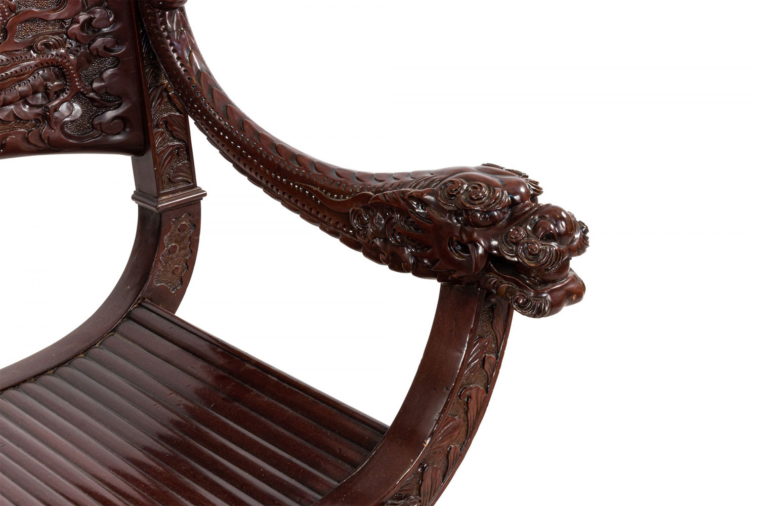 Asian Japanese style (1st quarter 20th Century) mahogany arm chair with a slat design saddle form seat and a carved back panel with owl finials and dragon arms.