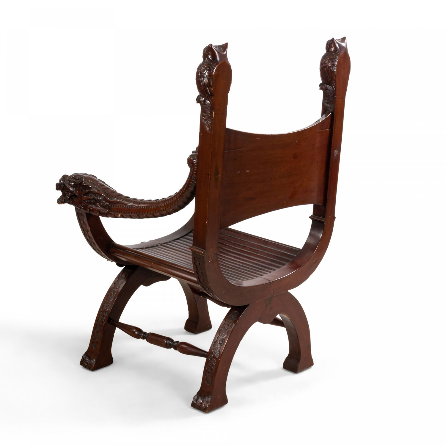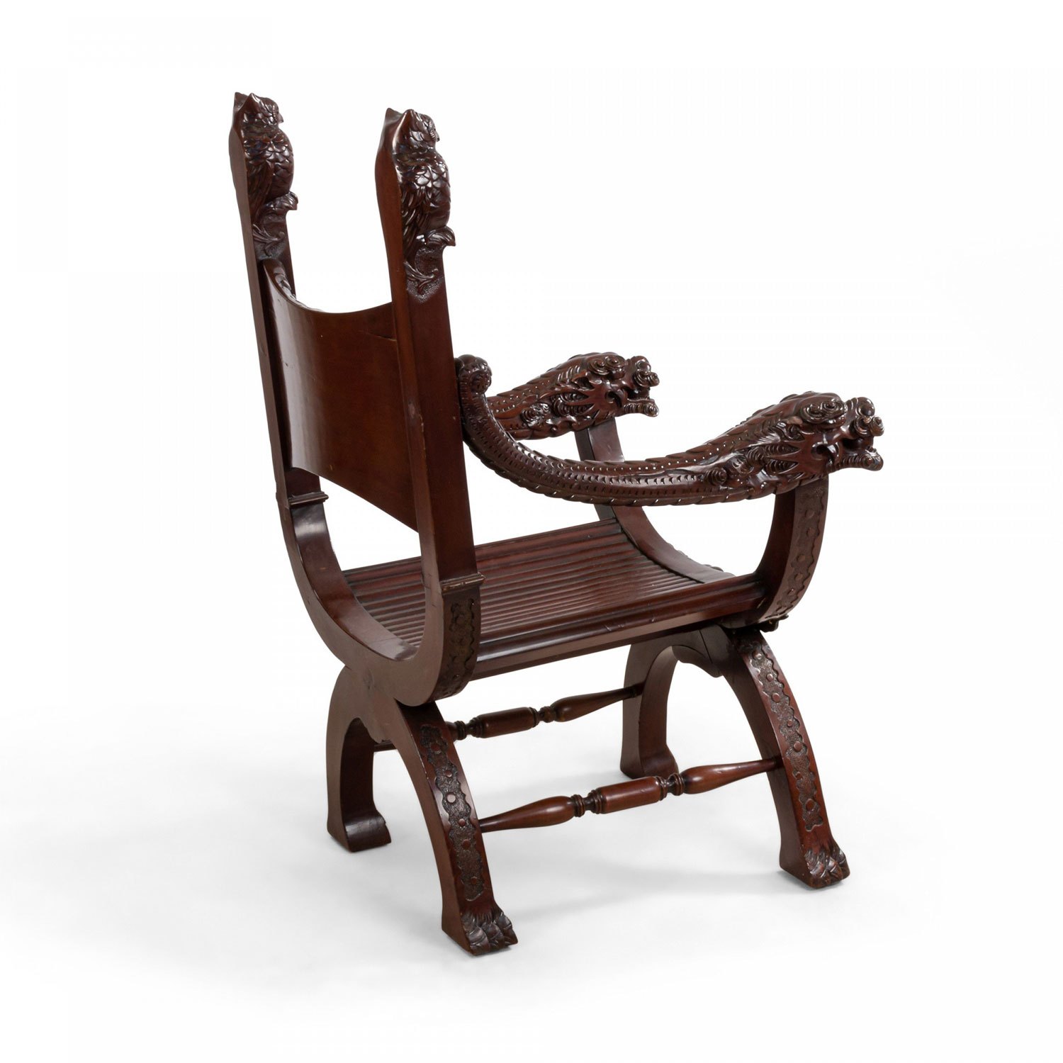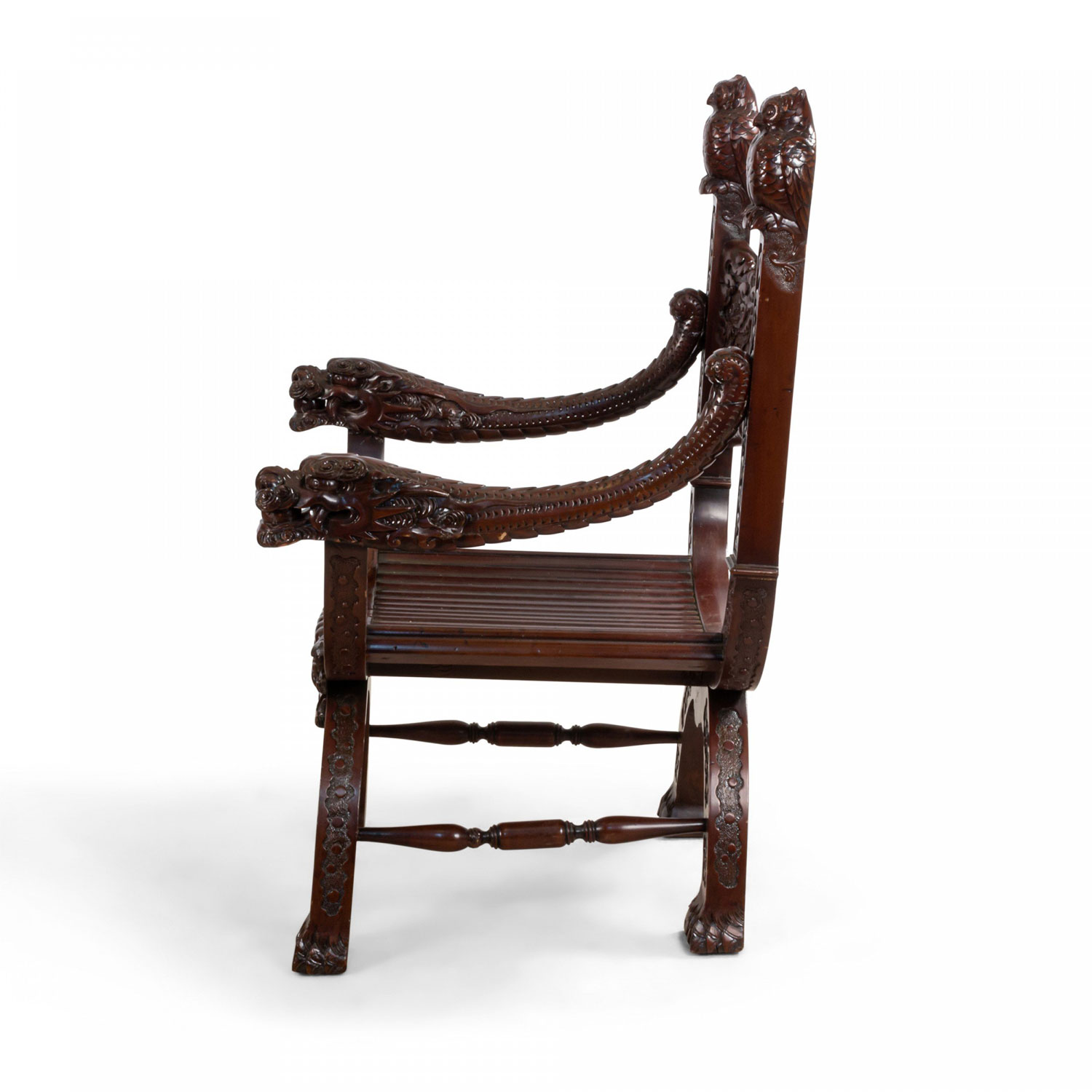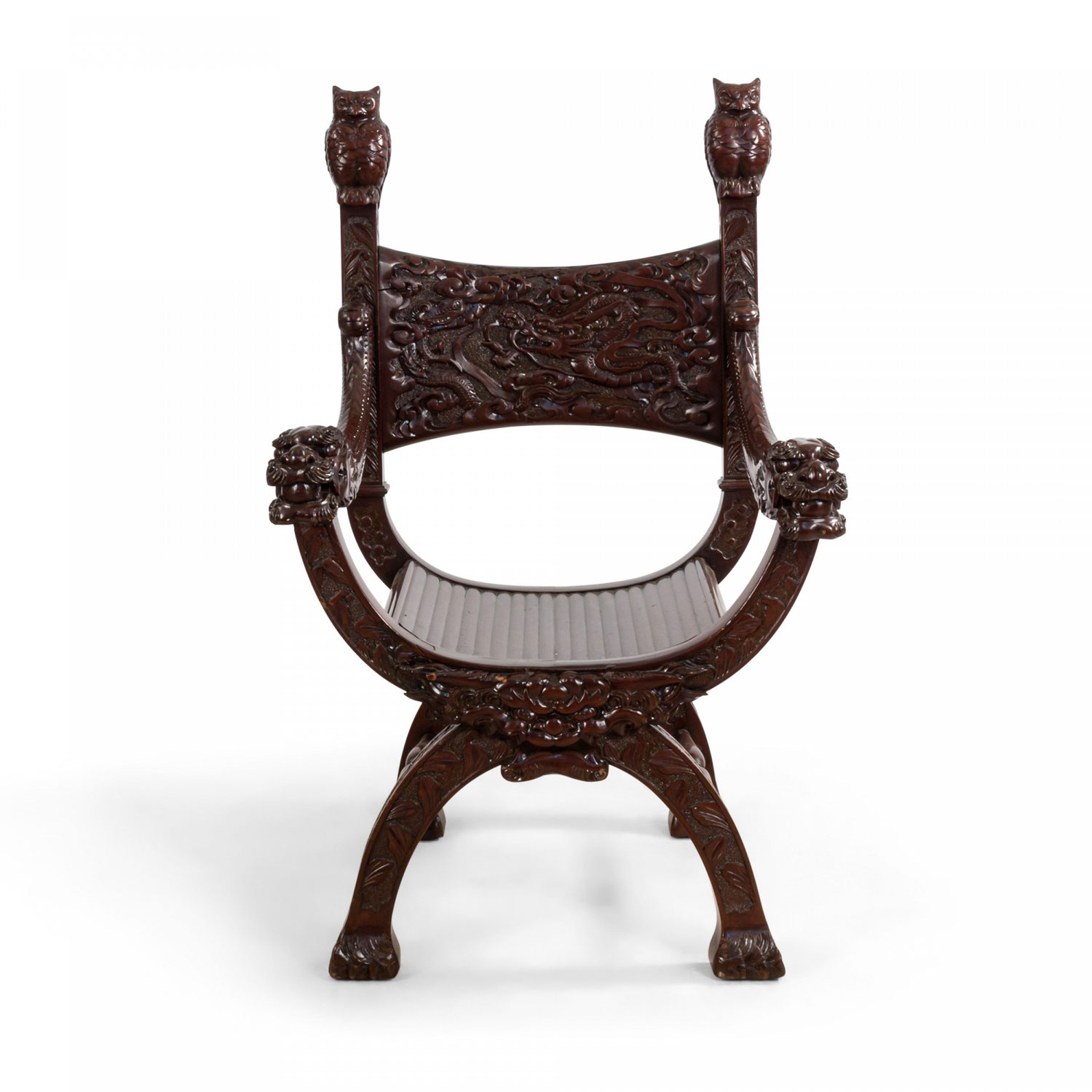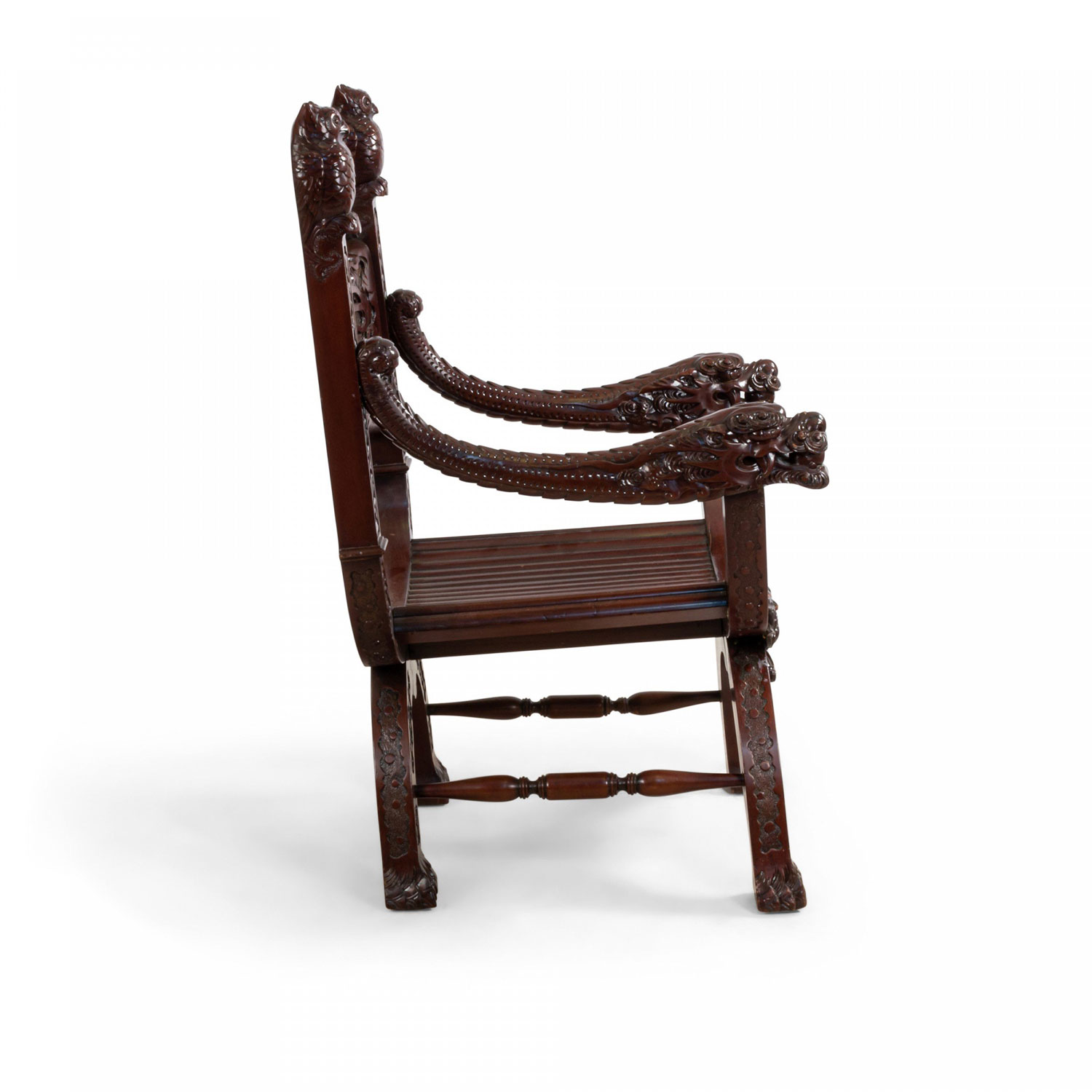 Asian Japanese style (1st quarter 20th Century) mahogany arm chair with a slat design saddle form seat and a carved back panel with owl finials and dragon arms..
