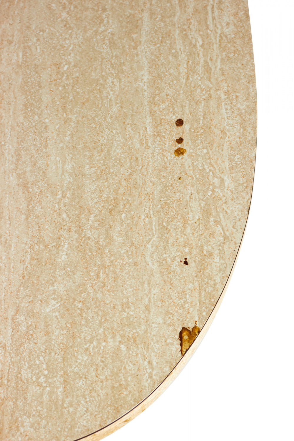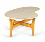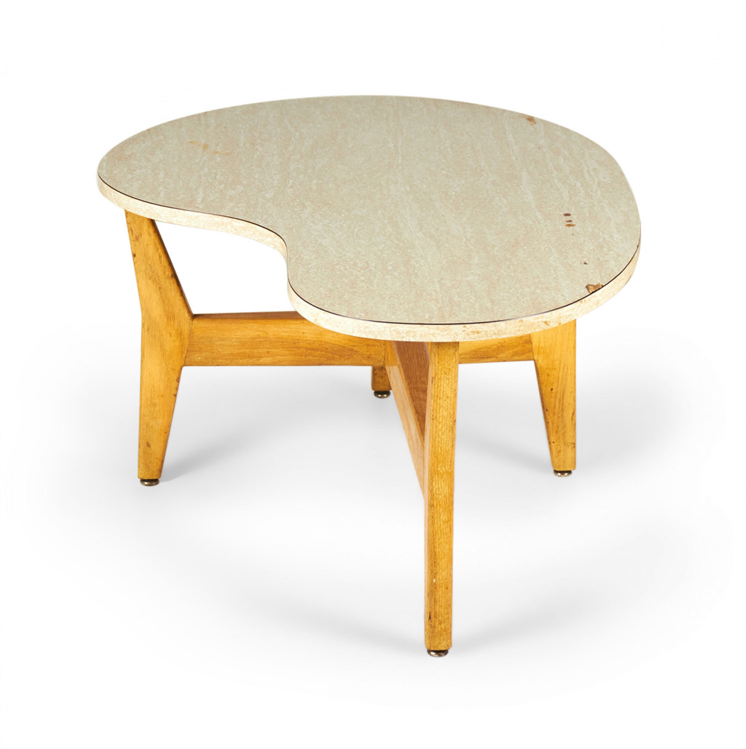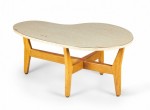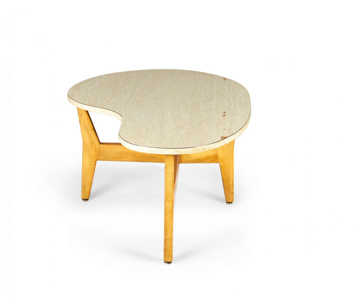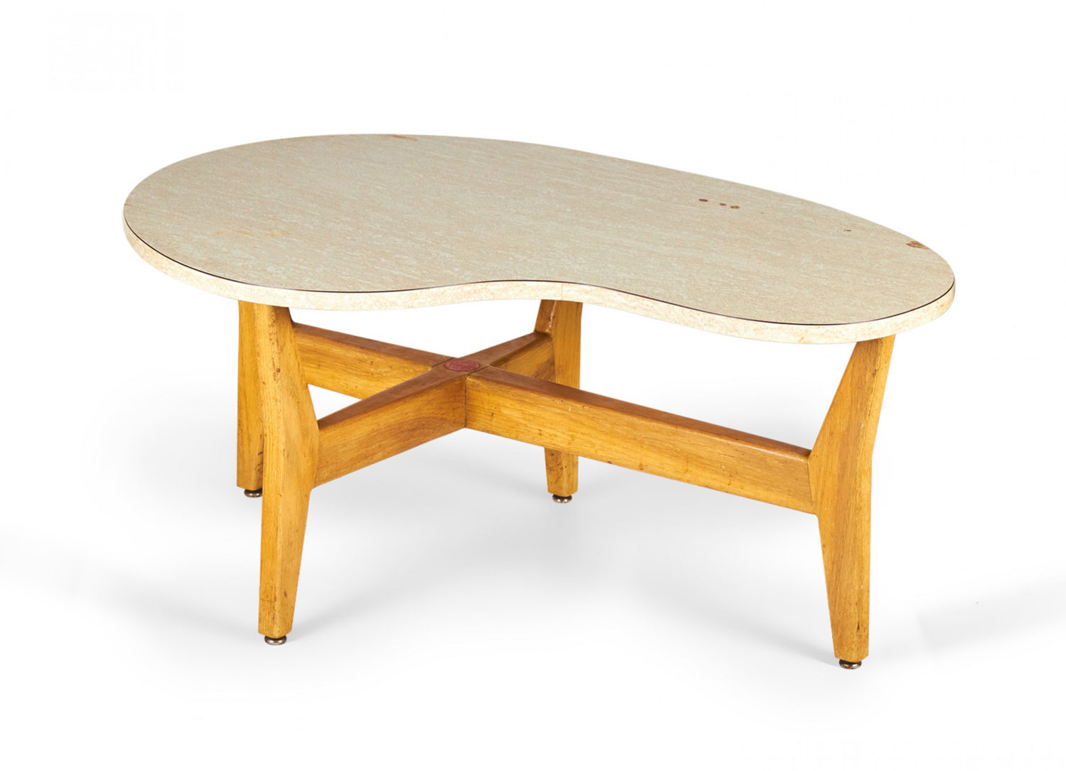 American Mid-Century coffee / cocktail table with a kidney-shaped table top with a beige marbled mica veneer resting on a walnut base with a cruciform stretcher and angled legs. (JENS RISOM)