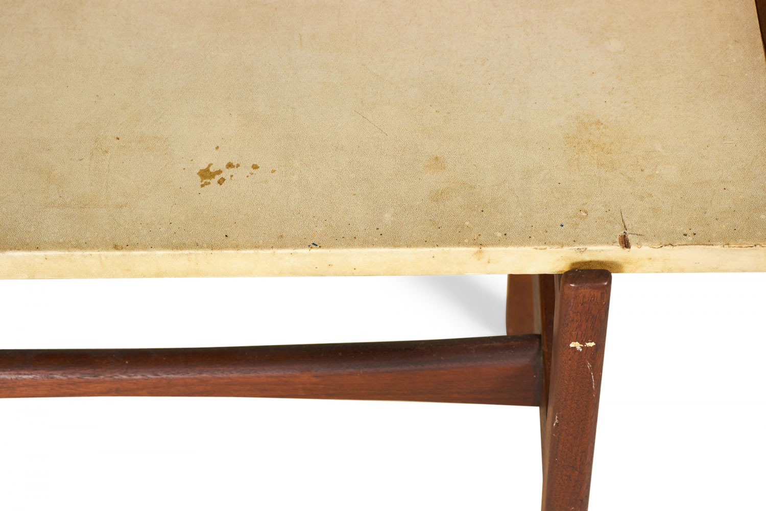 Style: Mid-Century Materials & Techniques: Leather, walnut, wood Category: Tables, Dining Room Condition: Leather needs cleaning and is separating from table top around the corners.