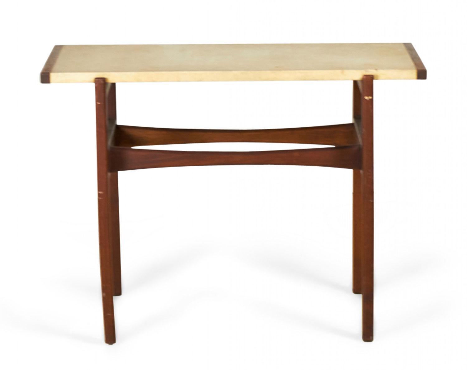 Danish Mid-Century console table with a walnut frame and rectangular table top with a beige leather wrap. (JENS RISOM)