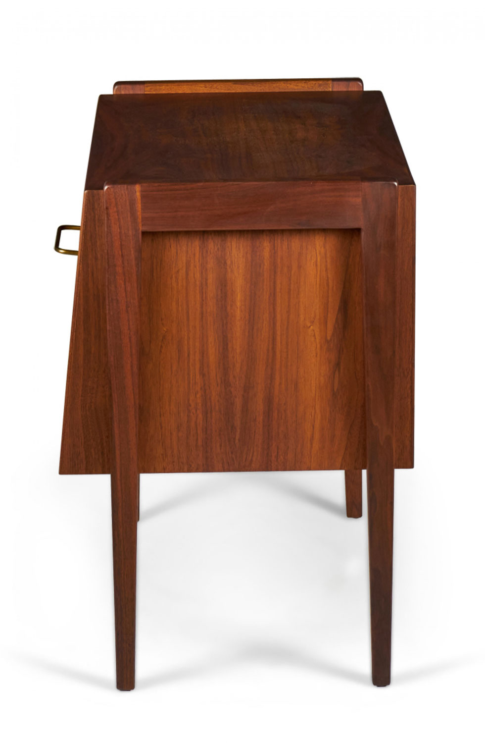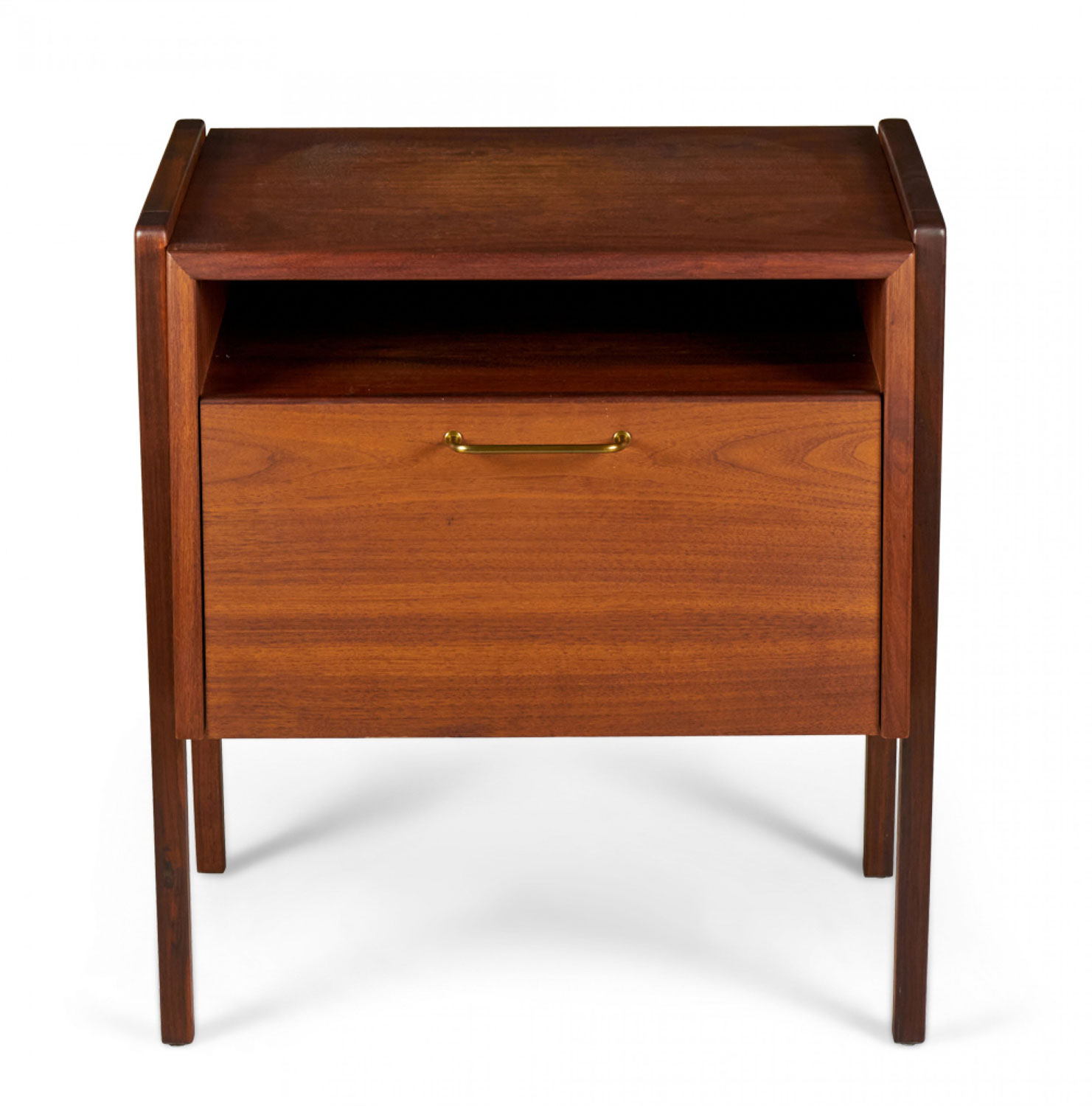 Danish Mid-Century walnut bedside table / commode with a bottom cabinet with a fall-front drawer and brass drawer pull with an open compartment above with four dowel legs. (JENS RISOM)