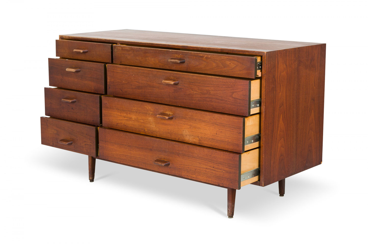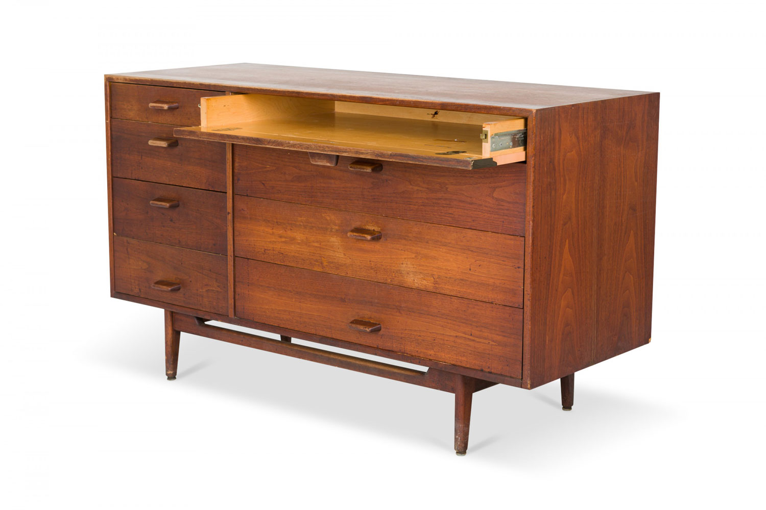 Danish Mid-Century walnut 8-drawer dresser with four narrow drawers on the left and four wider drawers on the right, the top of which folds down to create a writing desk, all with rounded rectangular wooden drawer pulls in a walnut cabinet, resting on four square legs with a stretcher base. (JENS RISOM)(Similar pieces: DUF0285A-D)
