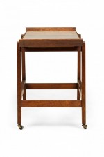 Danish Mid-Century two-tier serving trolley with a walnut frame, light gray laminate shelf surfaces, and a removable tray top, resting on four small casters. (JENS RISOM)