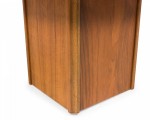 PAIR of American Mid-Century square end / side tables with reverse painted glass tops mounted in a walnut frame, supported by a smaller square walnut pedestal base. (JOHN KEAL FOR BROWN SALTMAN)(PRICED AS PAIR).