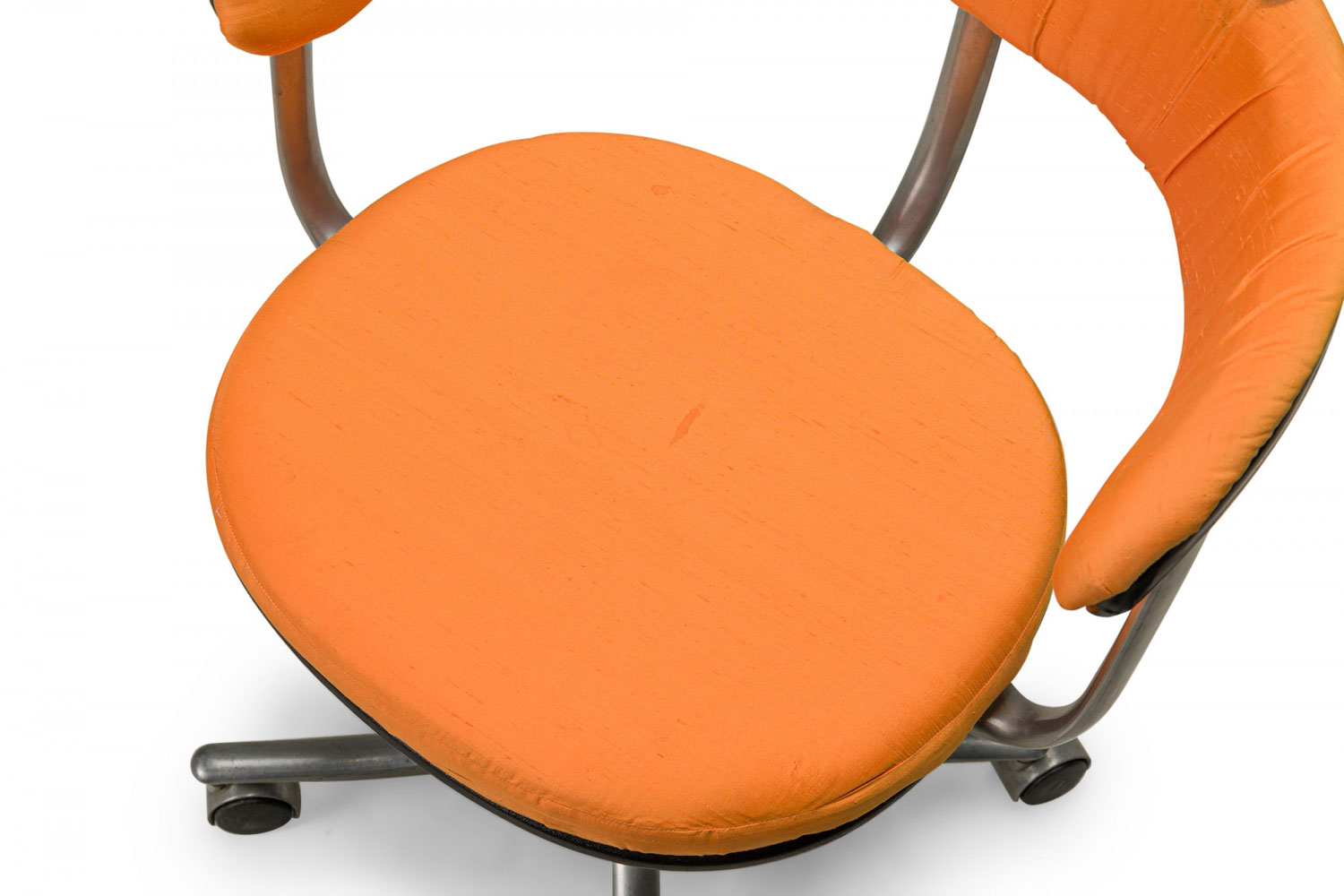 Danish Mid-Century rolling / swivel office chair with a U-shaped back and orange fabric seat and back upholstery, supported by a matte silver metal frame and pedestal base with four legs and four casters. (JØRGEN RASMUSSEN).