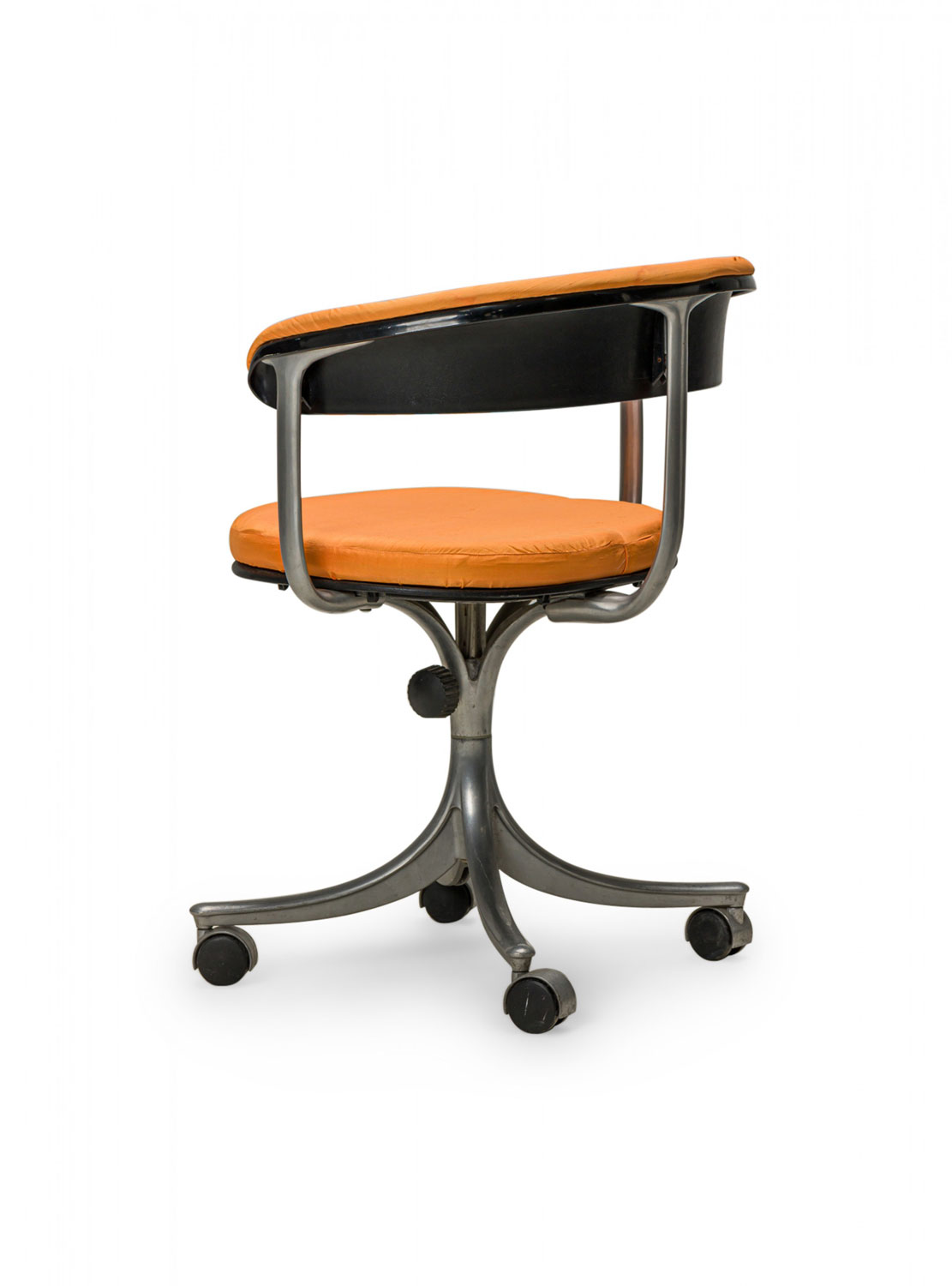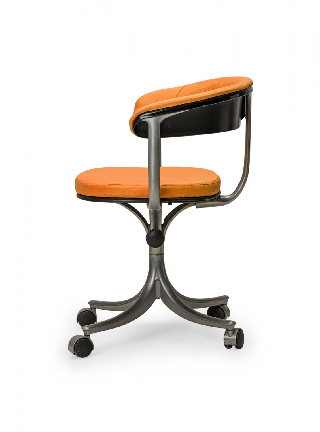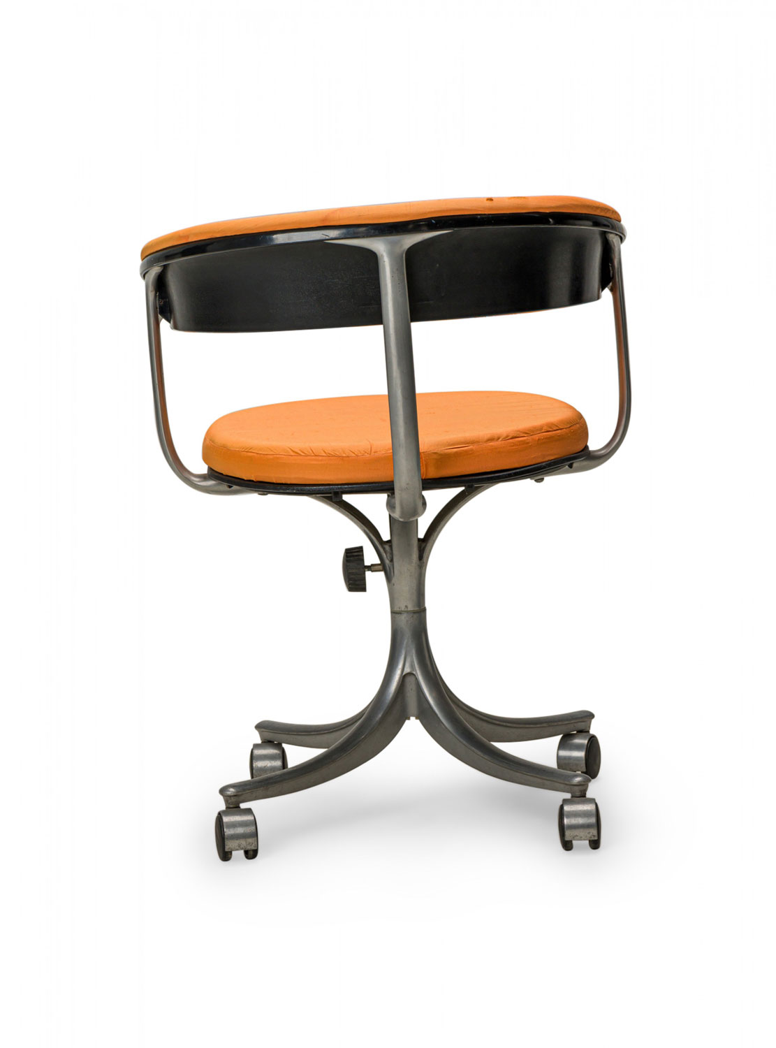 Danish Mid-Century rolling / swivel office chair with a U-shaped back and orange fabric seat and back upholstery, supported by a matte silver metal frame and pedestal base with four legs and four casters. (JØRGEN RASMUSSEN)