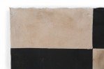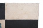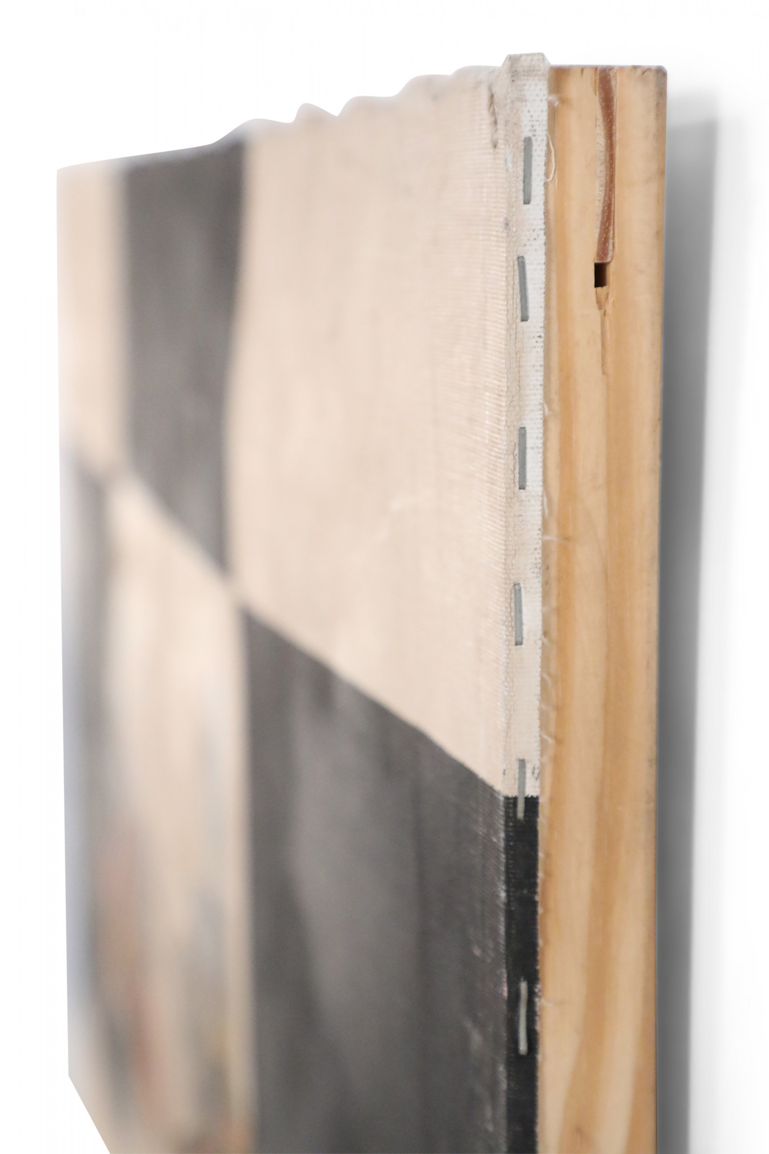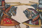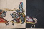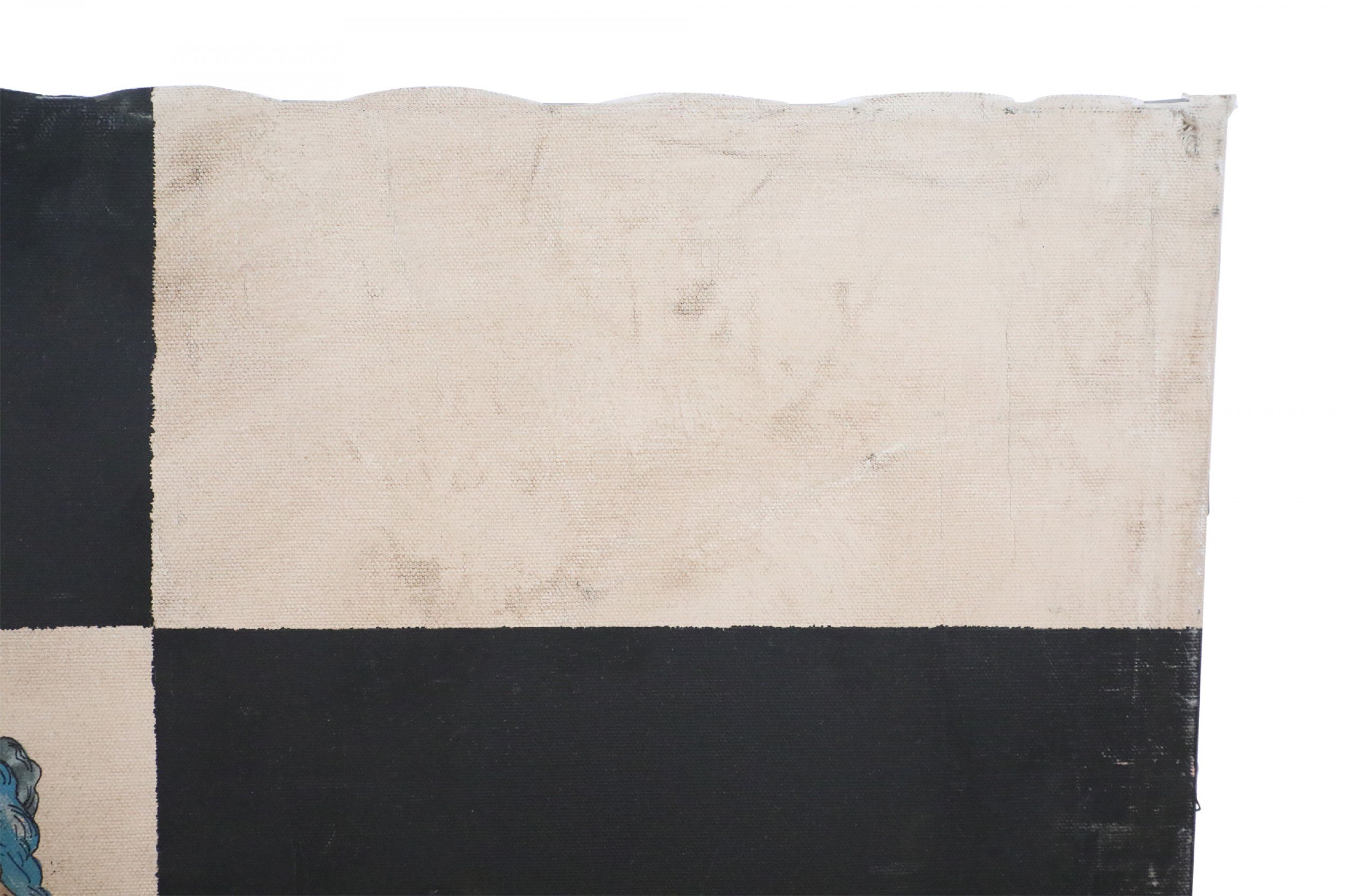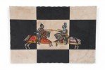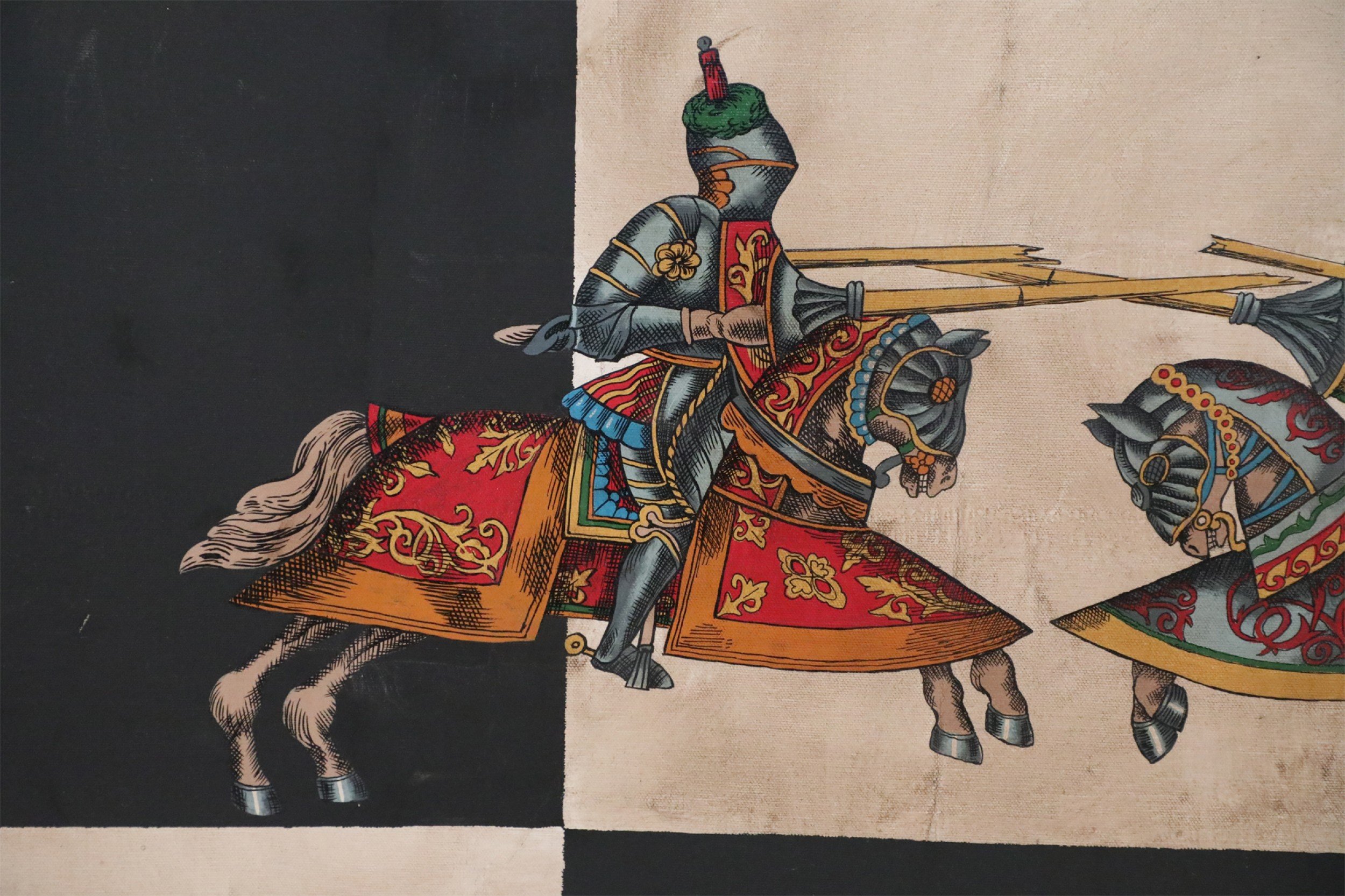 Italian Renaissance style (20th Century) painting of two knights on horseback engaged in jousting against a black and beige chequered ground, on unframed canvas with scalloped edges at the top and bottom.
