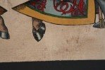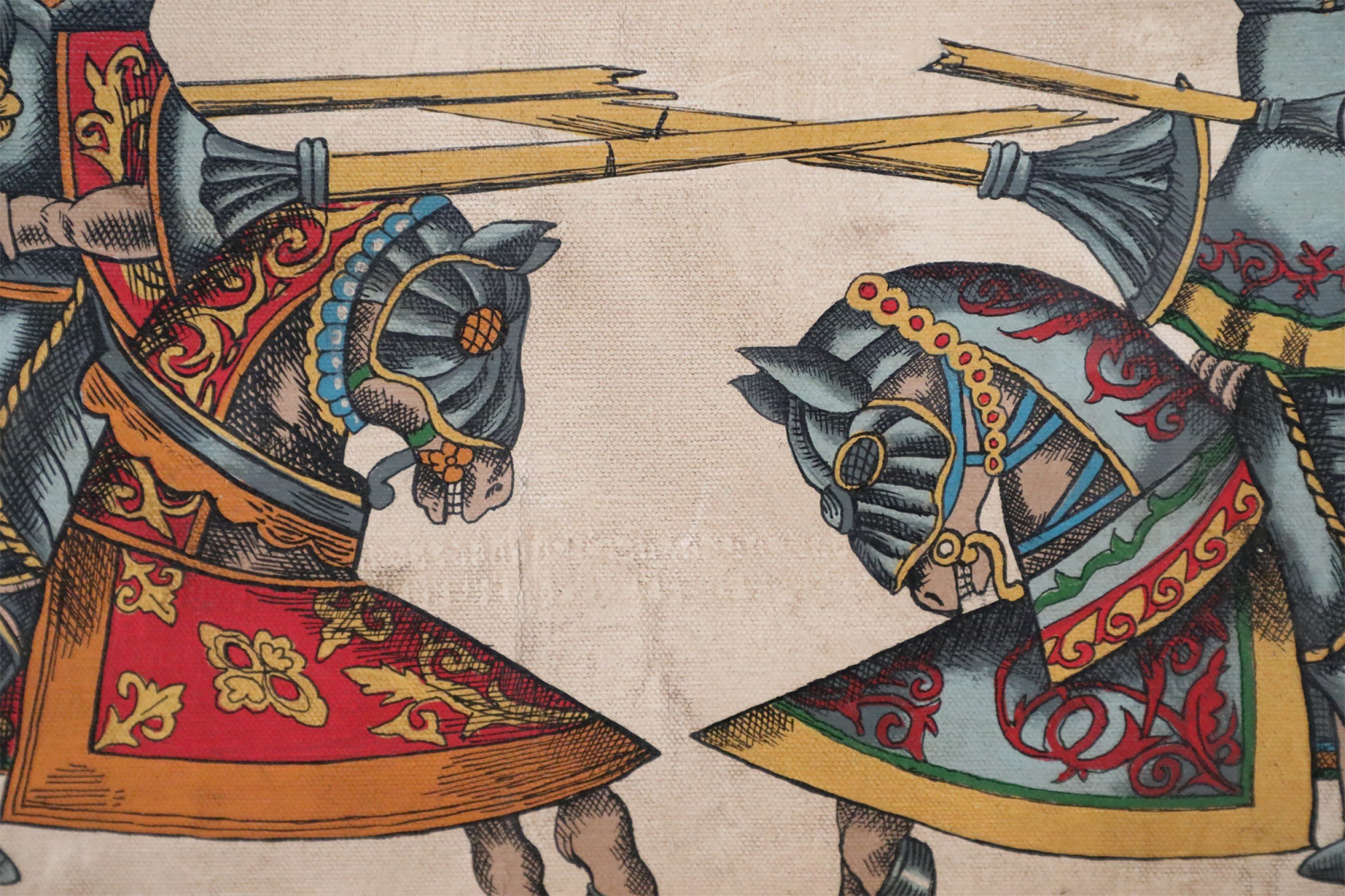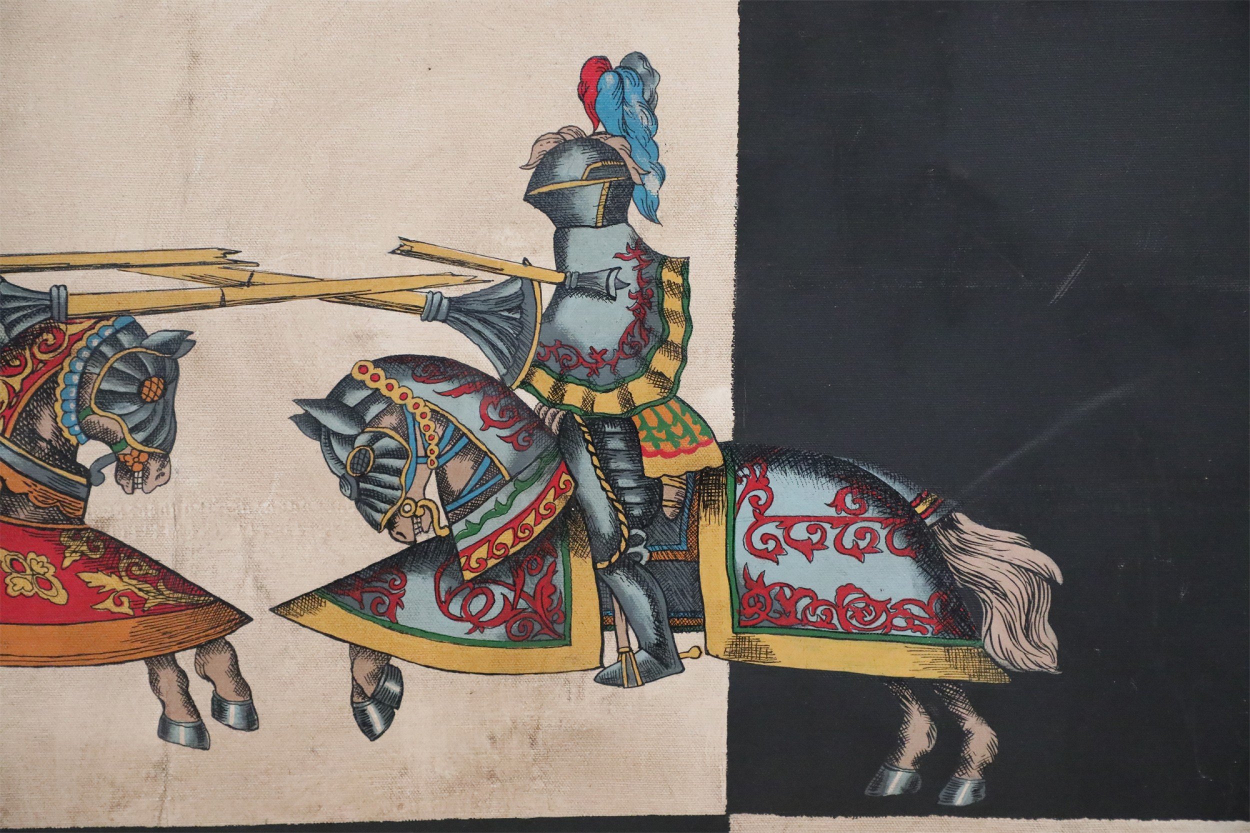 Italian Renaissance style (20th Century) painting of two knights on horseback engaged in jousting against a black and beige chequered ground, on unframed canvas with scalloped edges at the top and bottom..
