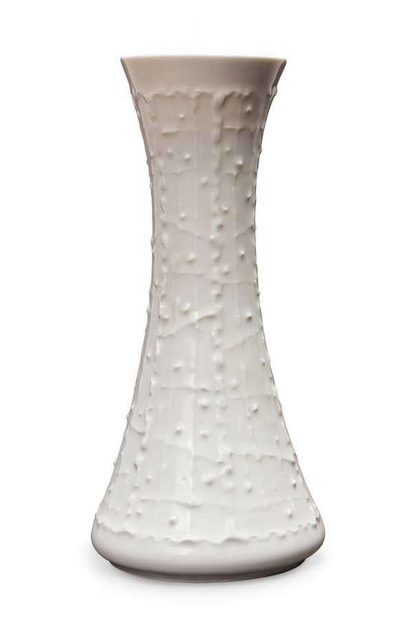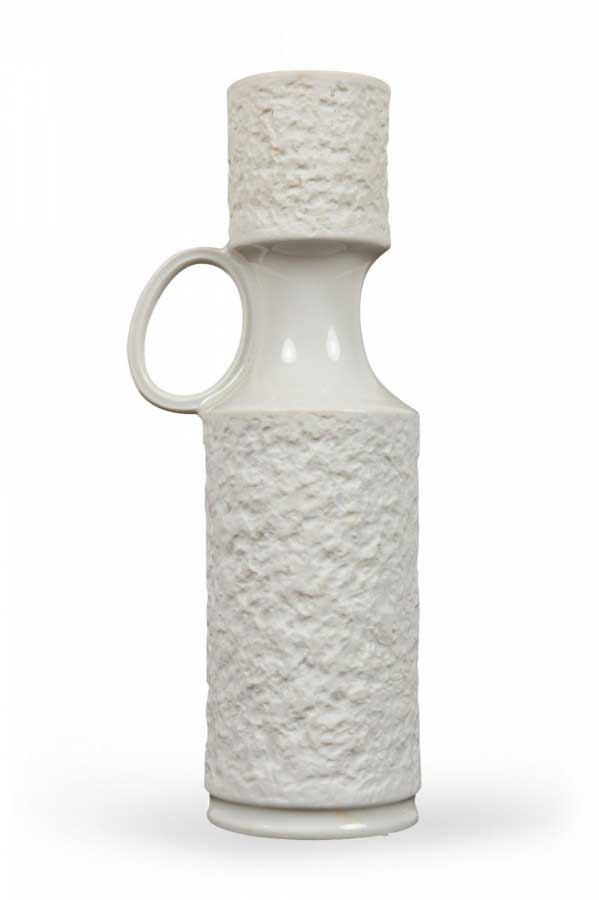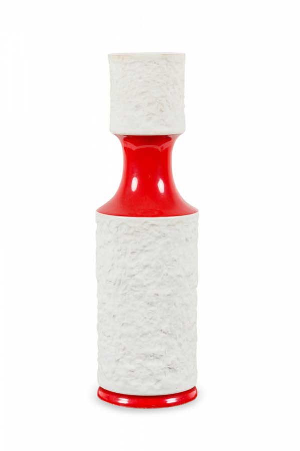 West German Mid-Century porcelain vase with a red textured cylindrical mouth and body, connected by a narrow white glazed porcelain neck with a small handle. (mark on bottom, ROYAL PORZELLAN BAVARIA, KPM GERMANY, HANDARBEIT)(Similar pieces: 063023, 063039).