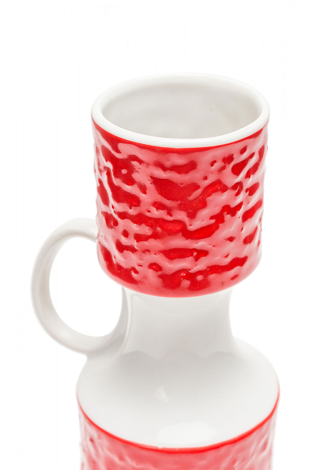 West German Mid-Century porcelain vase with a red textured cylindrical mouth and body, connected by a narrow white glazed porcelain neck with a small handle. (mark on bottom, ROYAL PORZELLAN BAVARIA, KPM GERMANY, HANDARBEIT)(Similar pieces: 063023, 063039)