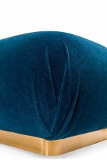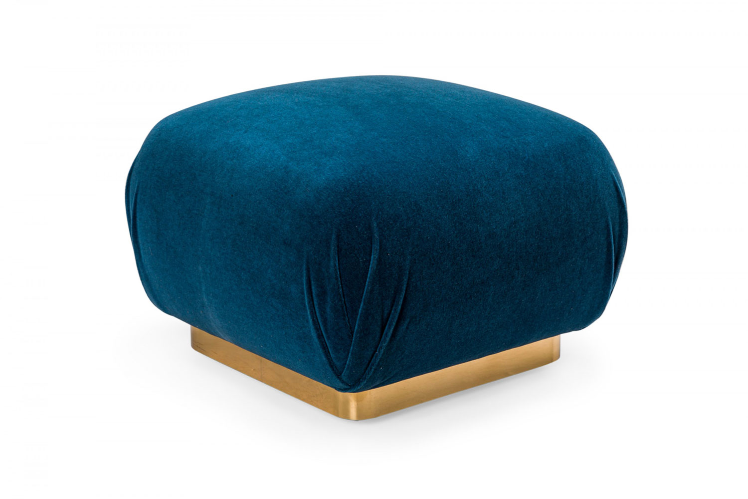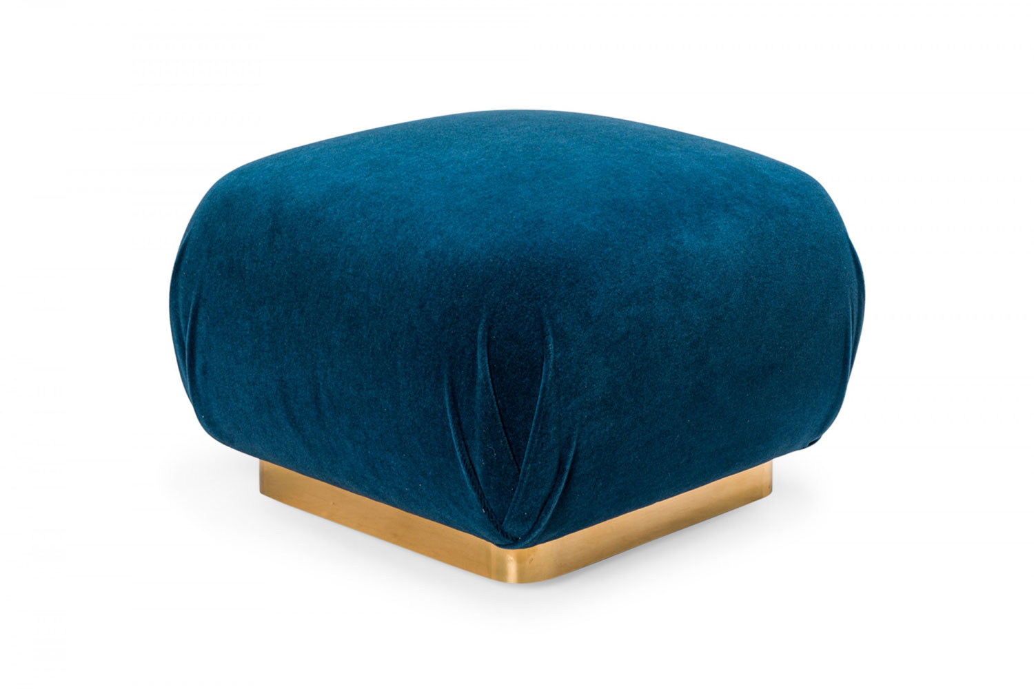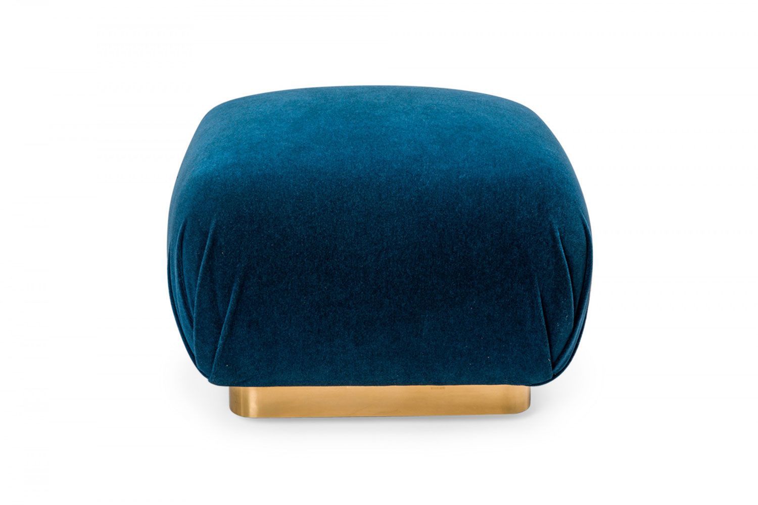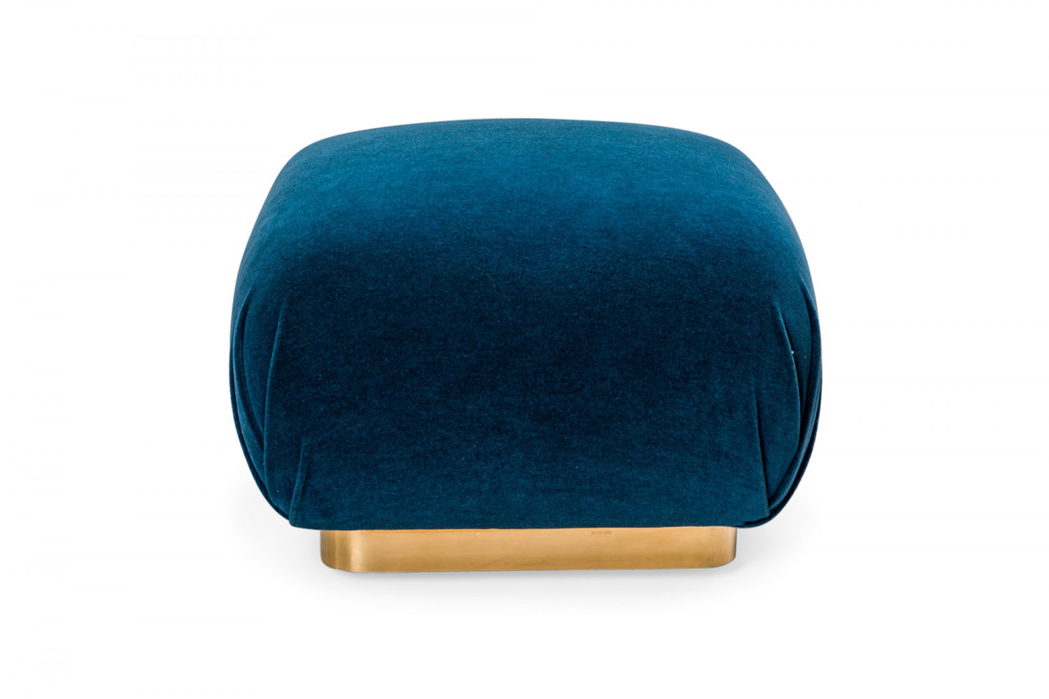 American Mid-Century 'Souffle' ottoman with blue velvet upholstery with a square gilt steel base. (KARL SPRINGER).