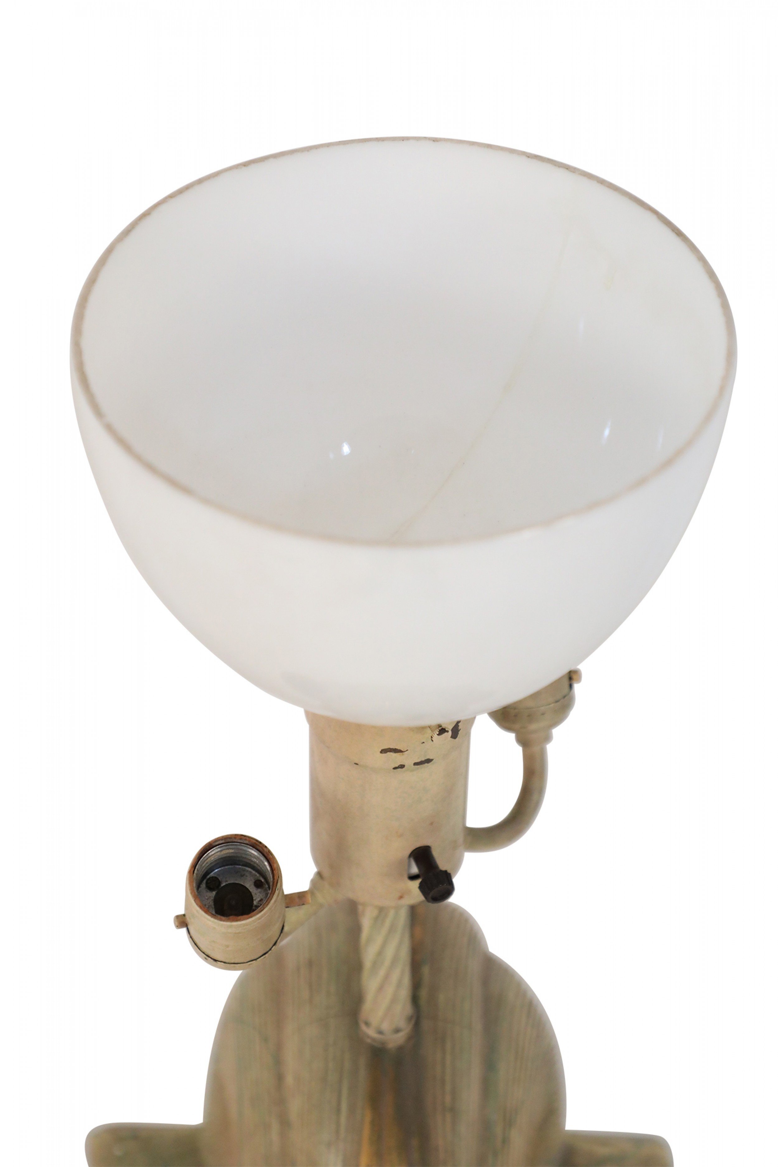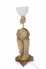Chinese carved bleached wood table lamp with Buddha head on a square giltwood base with a giltwood head piece under a three light top with central white glass shade..