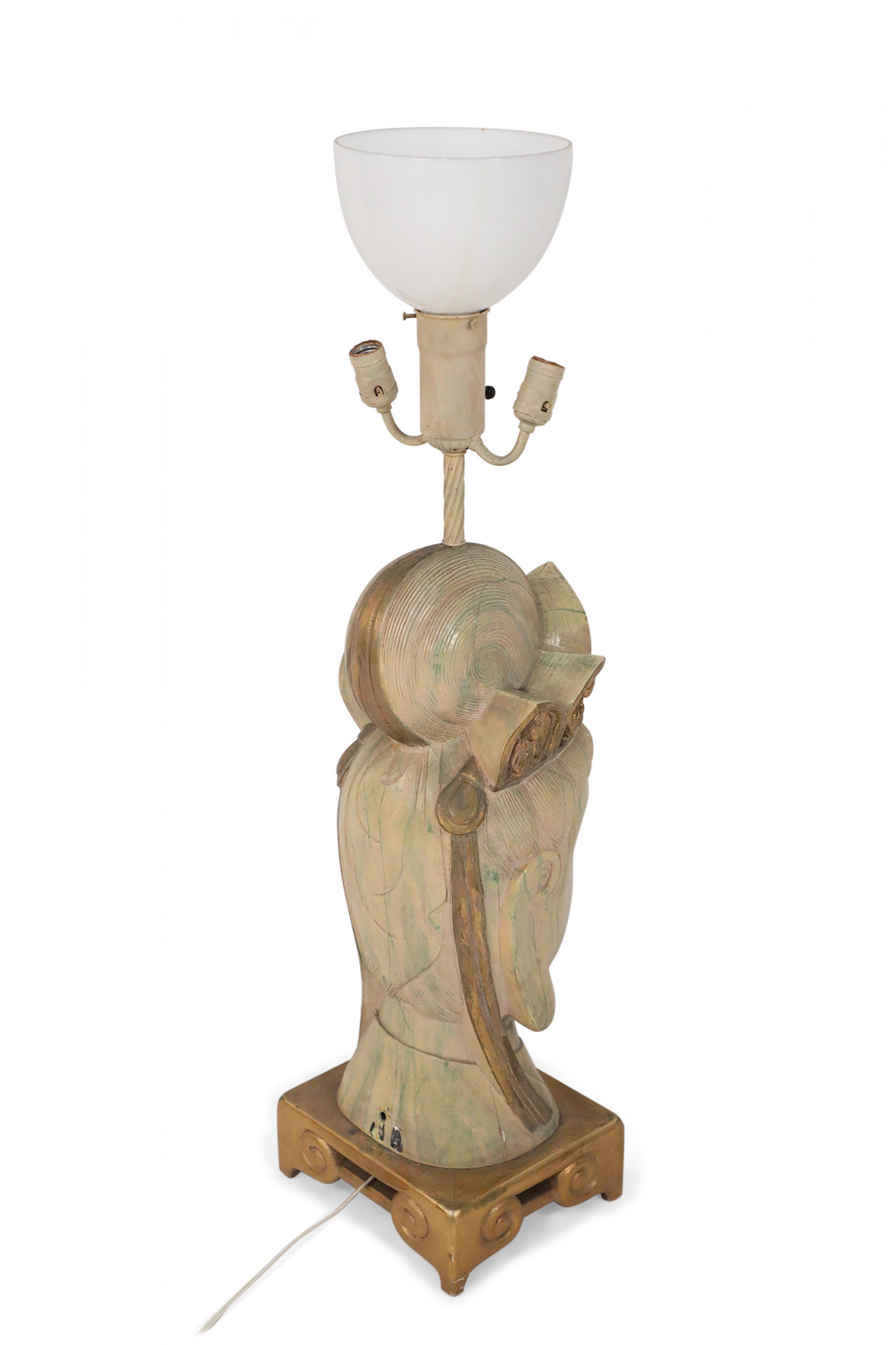 Chinese carved bleached wood table lamp with Buddha head on a square giltwood base with a giltwood head piece under a three light top with central white glass shade.