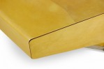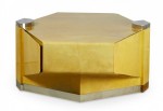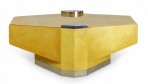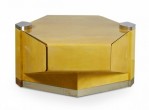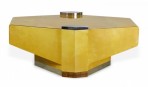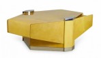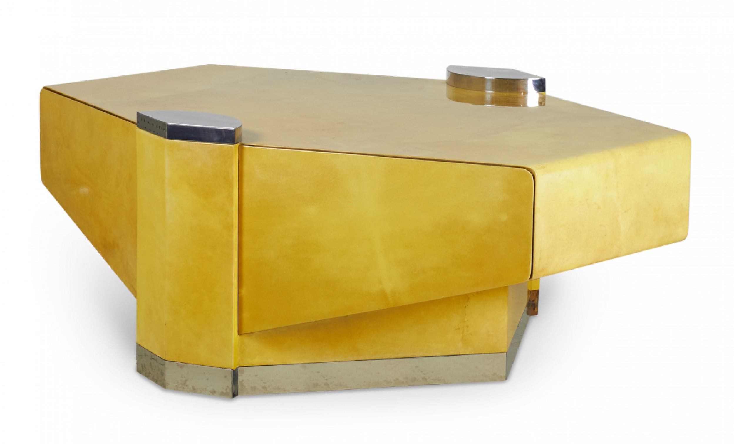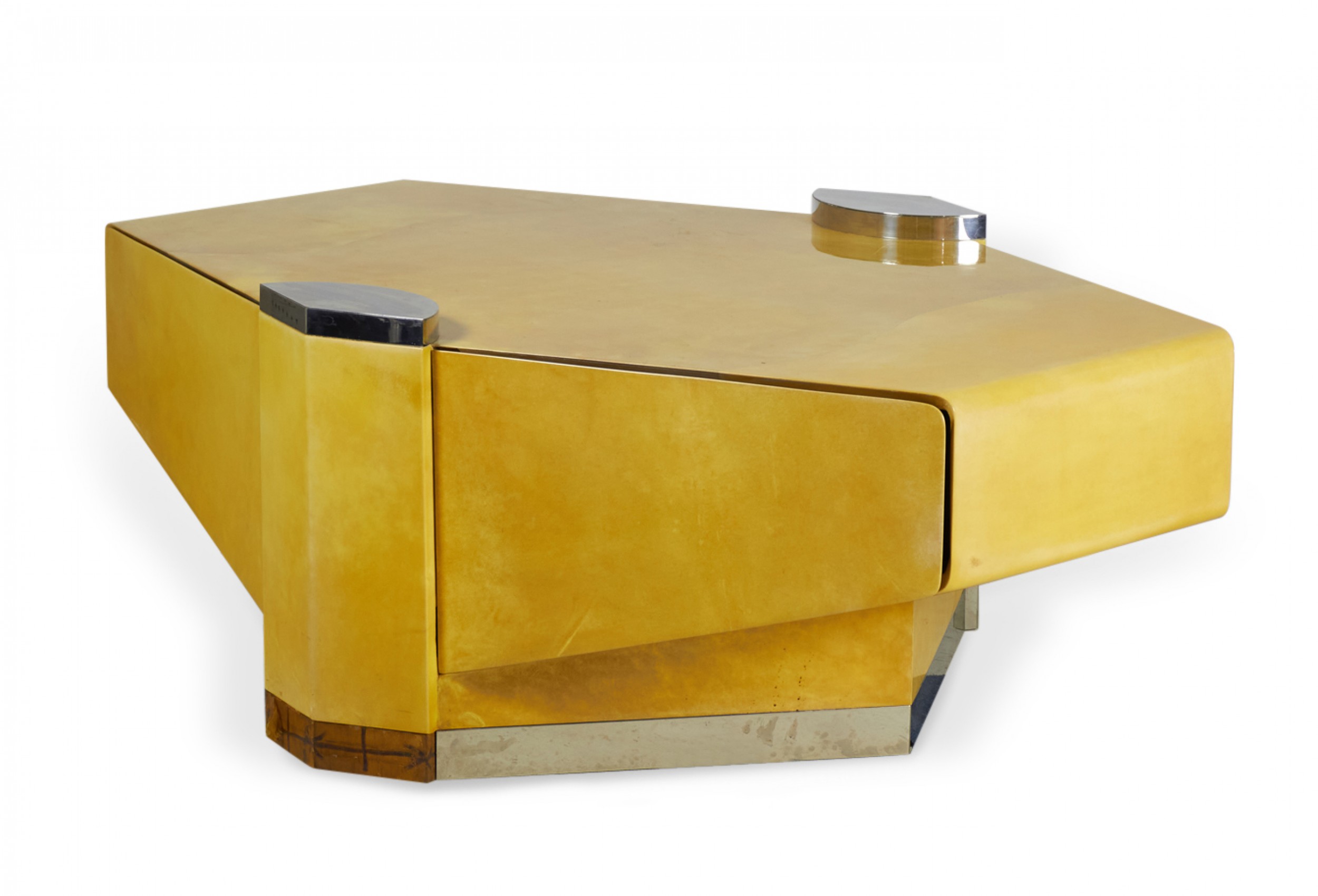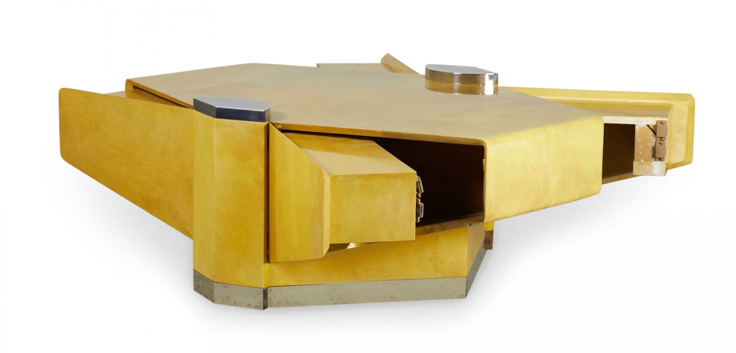 American High Style (circa 1980) articulating coffee / cocktail table with hidden articulating extensions that expand from the sides, with a parchment veneer finish and chrome accents and base. (LORIN MARSH)
