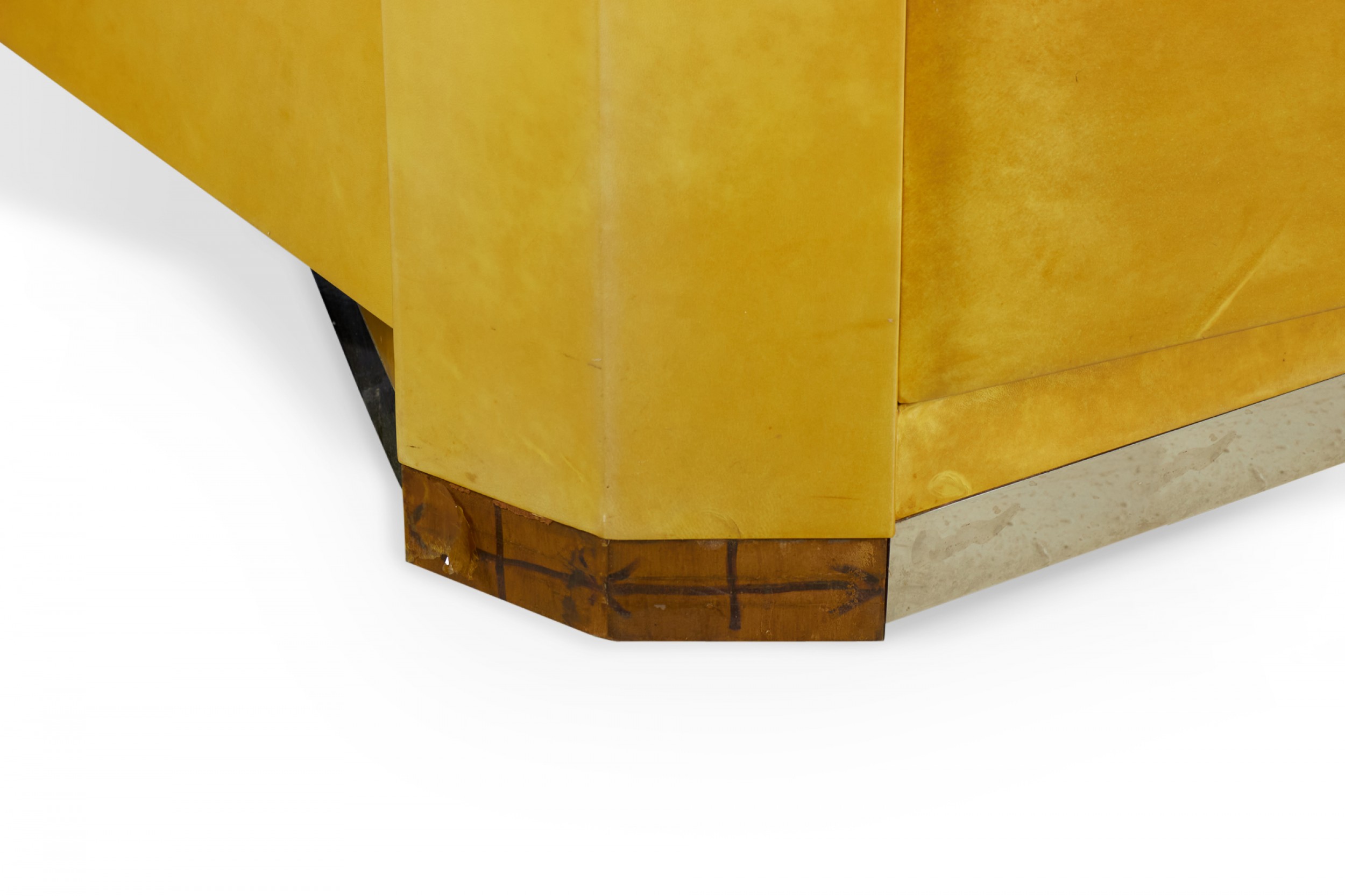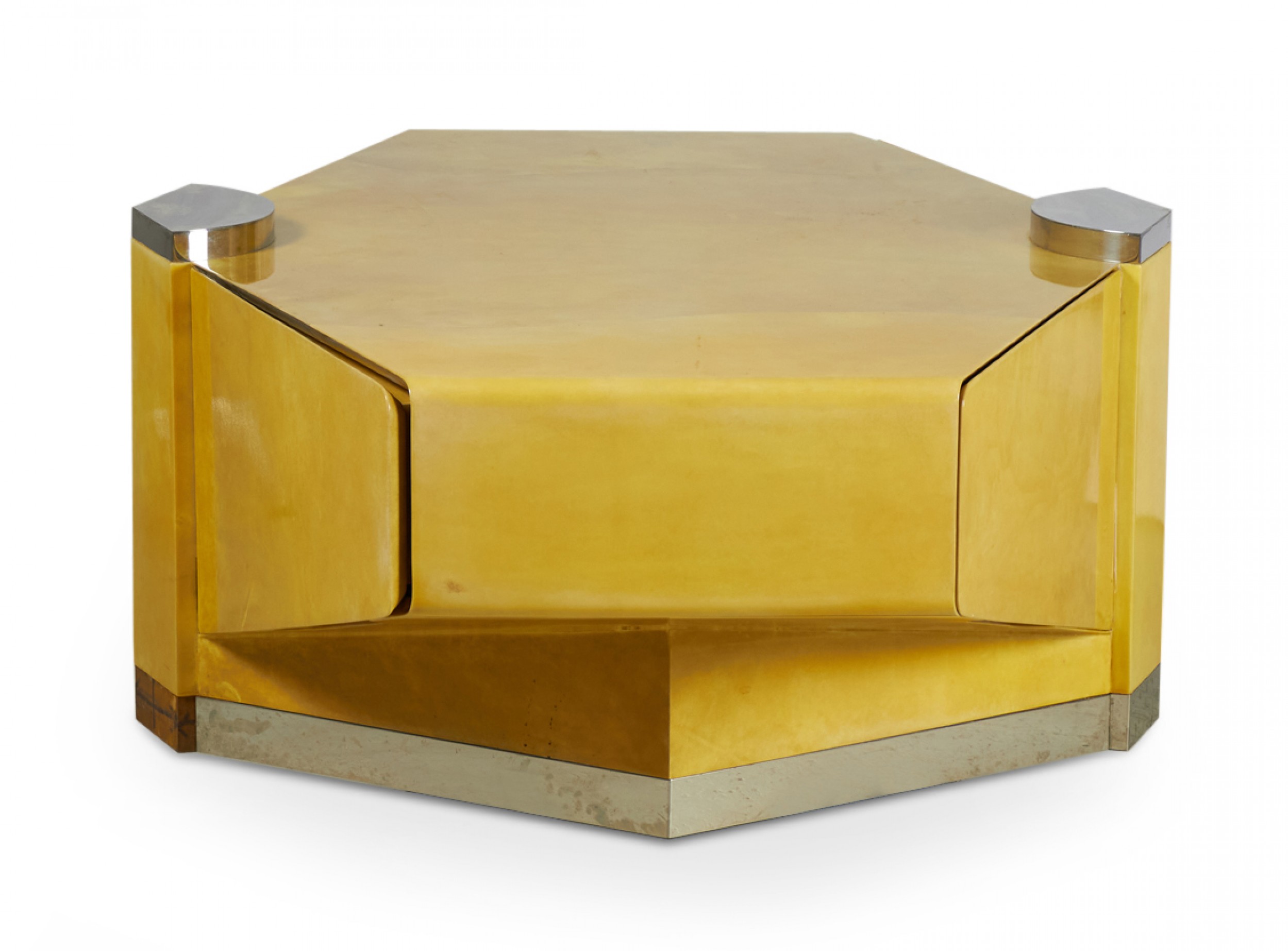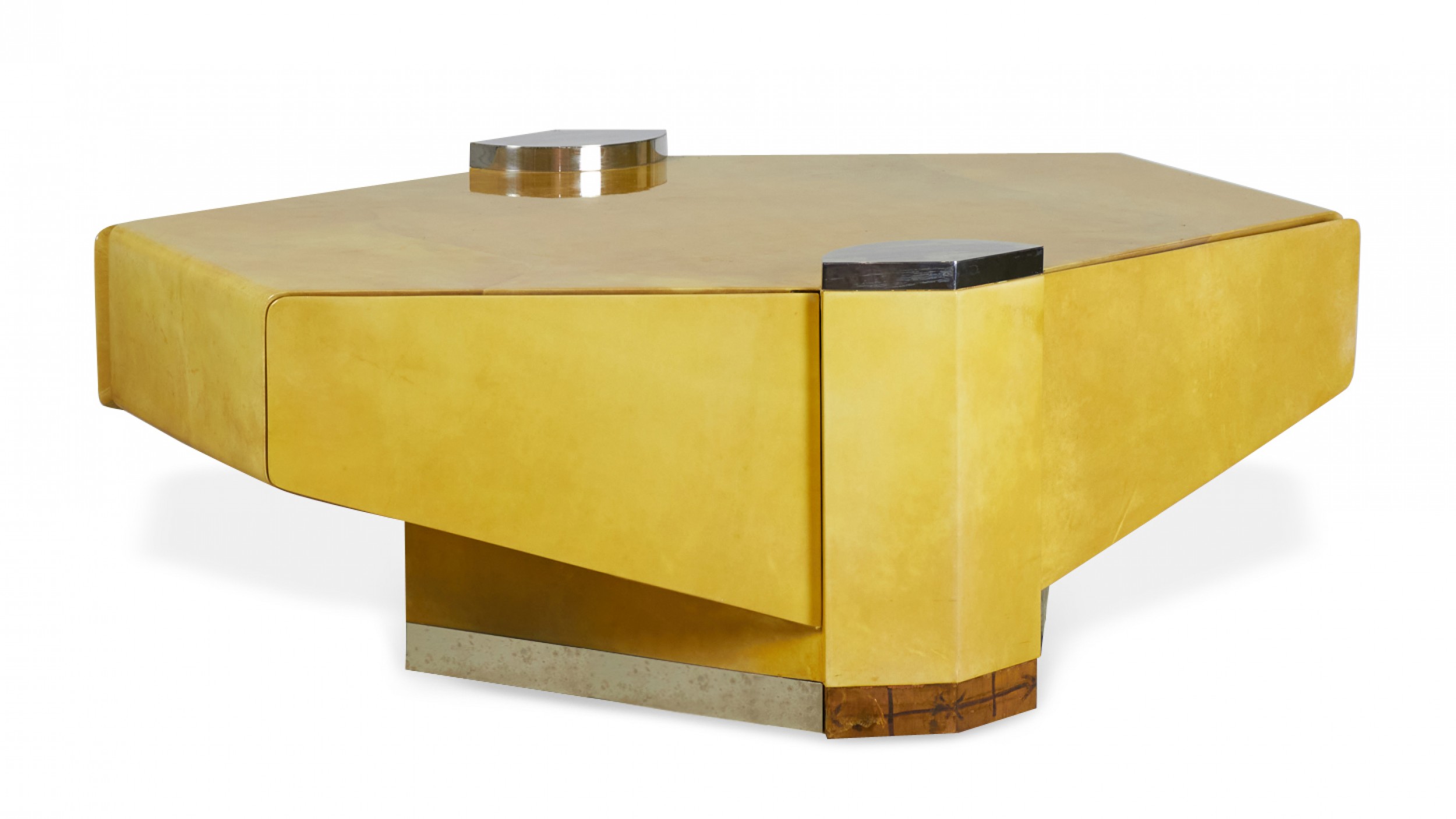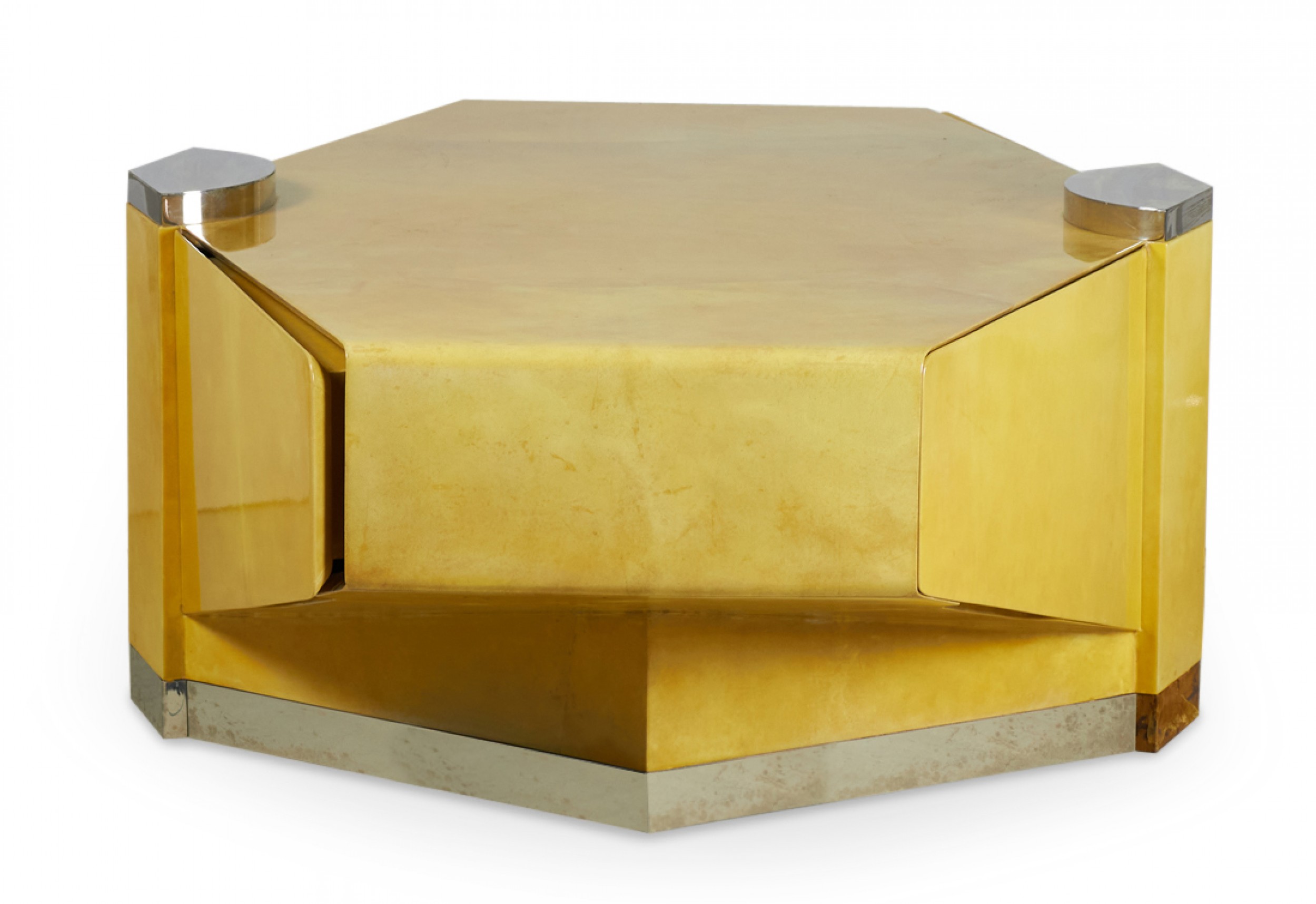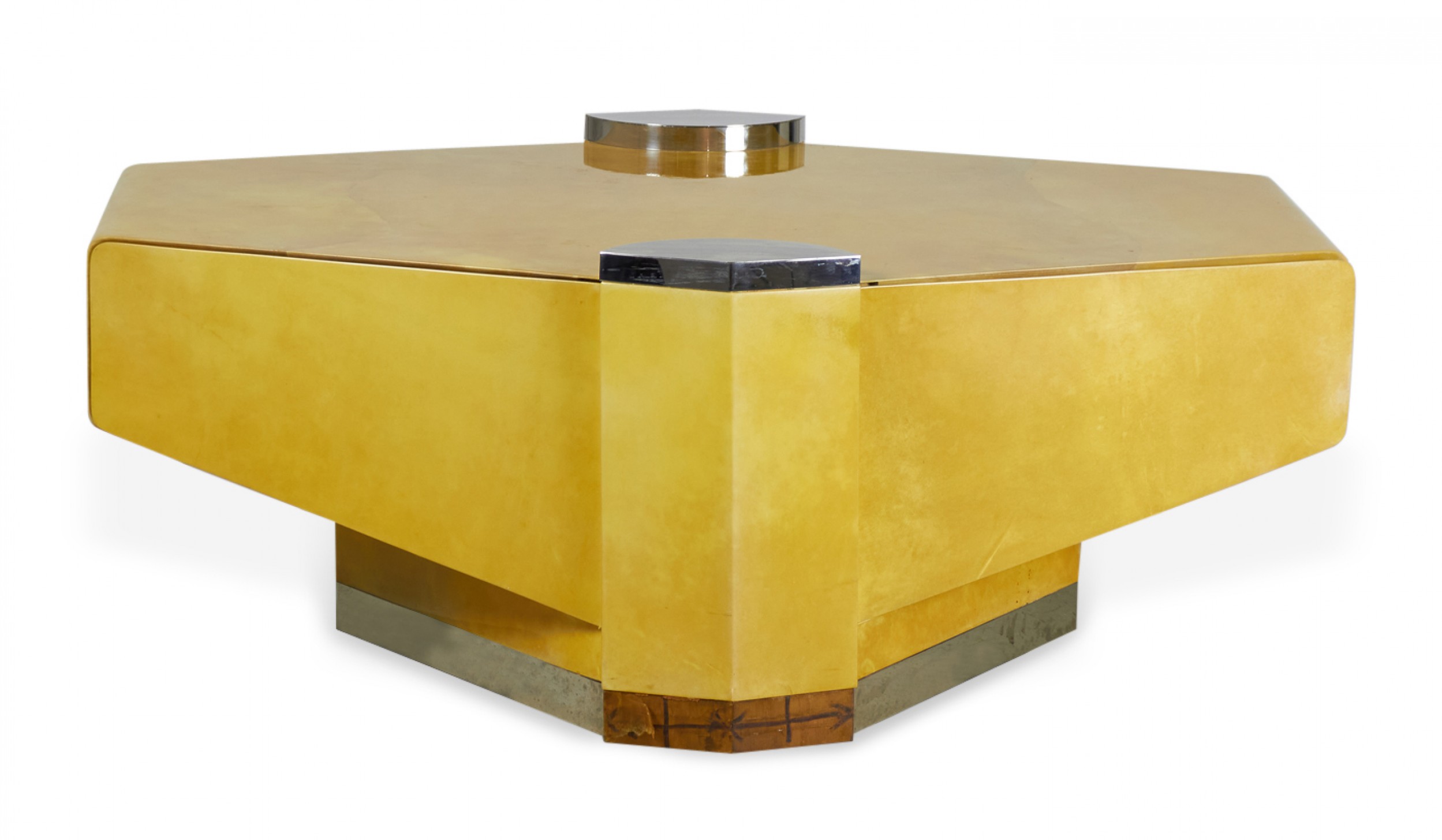Style: Mid-Century Materials & Techniques: Chrome, metal, parchment, wood Category: Tables Condition: Missing a small piece of trim on the bottom. Good; Wear consistent with age and use