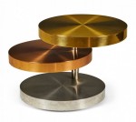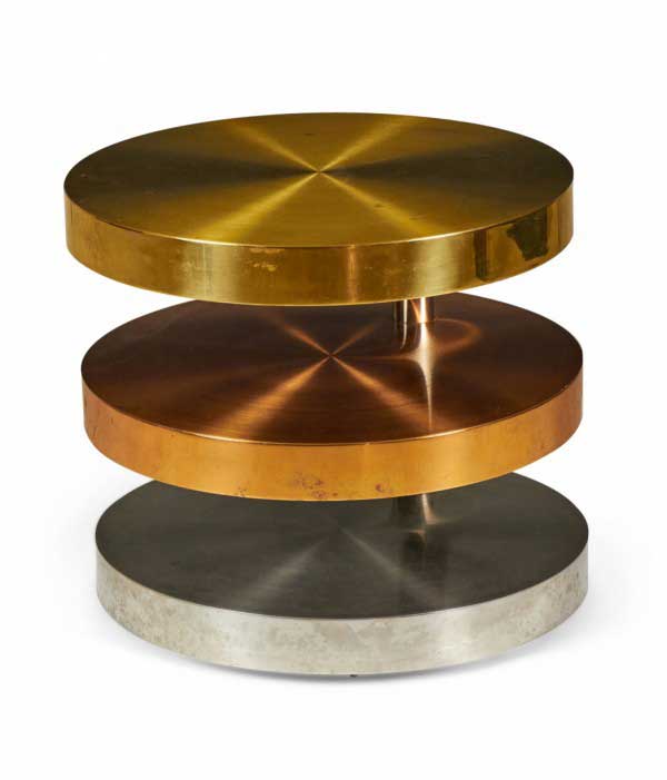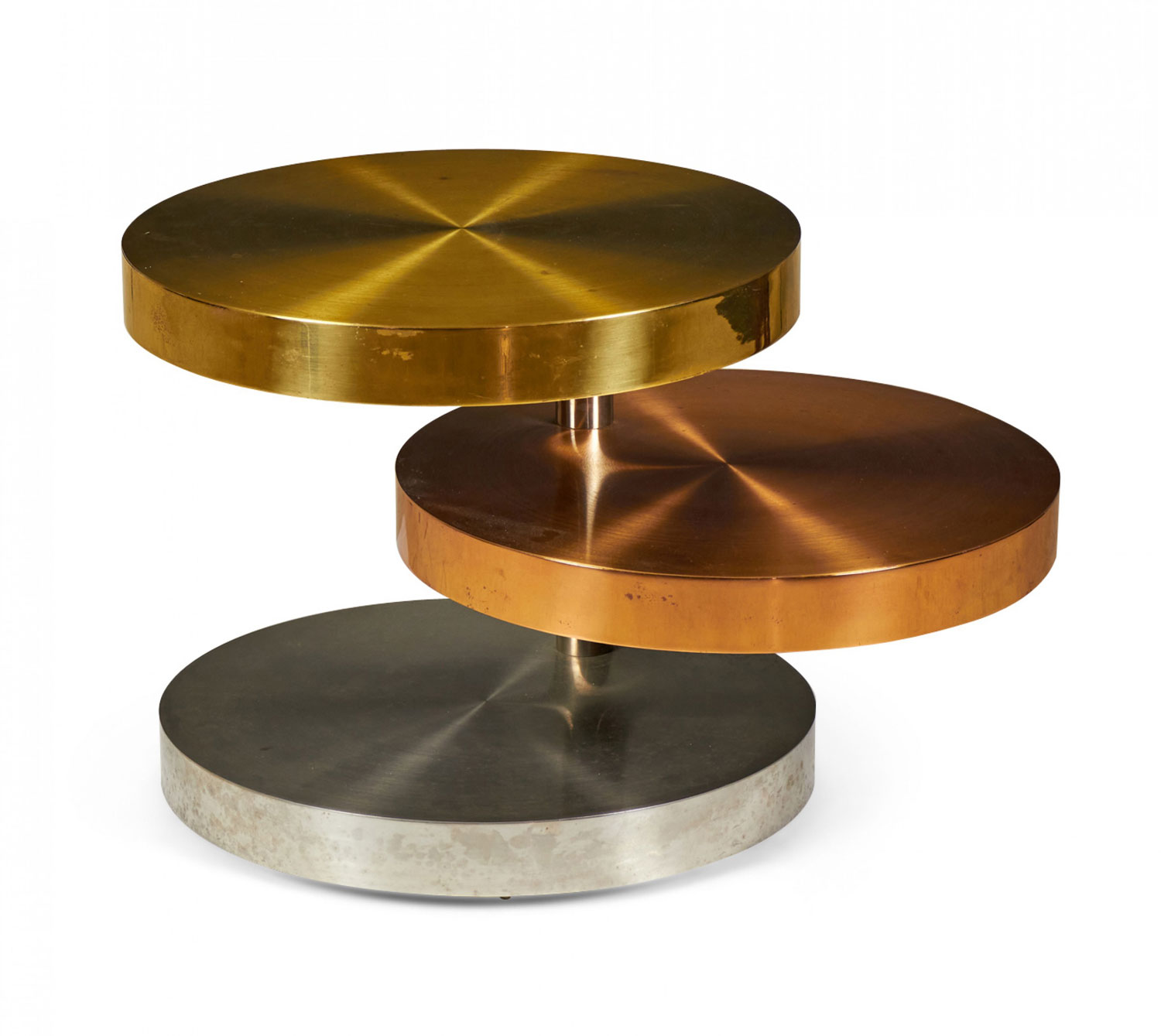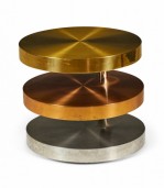 American High Style (circa 1980) coffee / cocktail table comprised of three swiveling circular tiers made from polished and satin brass, copper and chrome plated steel resting on rolling casters. (LORIN MARSH)