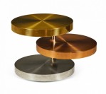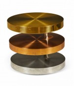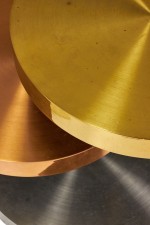American High Style (circa 1980) coffee / cocktail table comprised of three swiveling circular tiers made from polished and satin brass, copper and chrome plated steel resting on rolling casters. (LORIN MARSH).