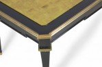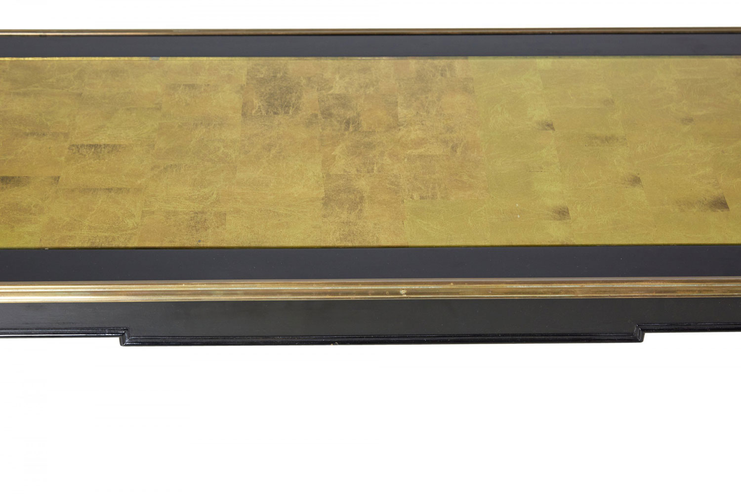 French Mid-Century (1940s) ebonized wooden coffee table with gilt painted trim, an inset gold glass top with geometric pattern, and four tapered square legs ending in brass sabots. (MAISON JANSEN)