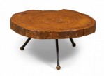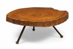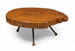Mexican Modern coffee table with a sabino wood top with natural free edge supported on three angled wrought iron legs ending in bronze ball feet..