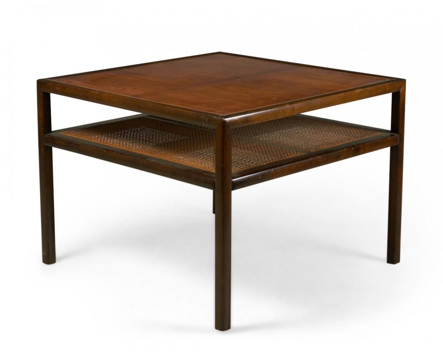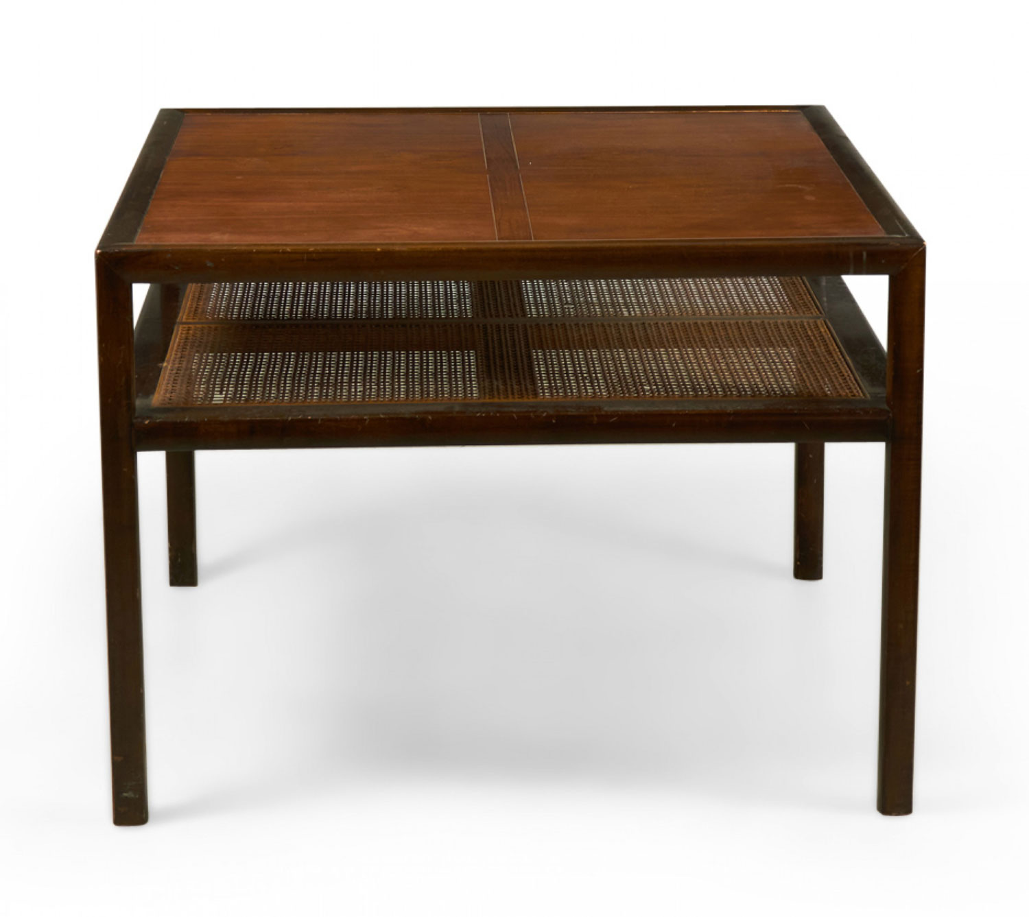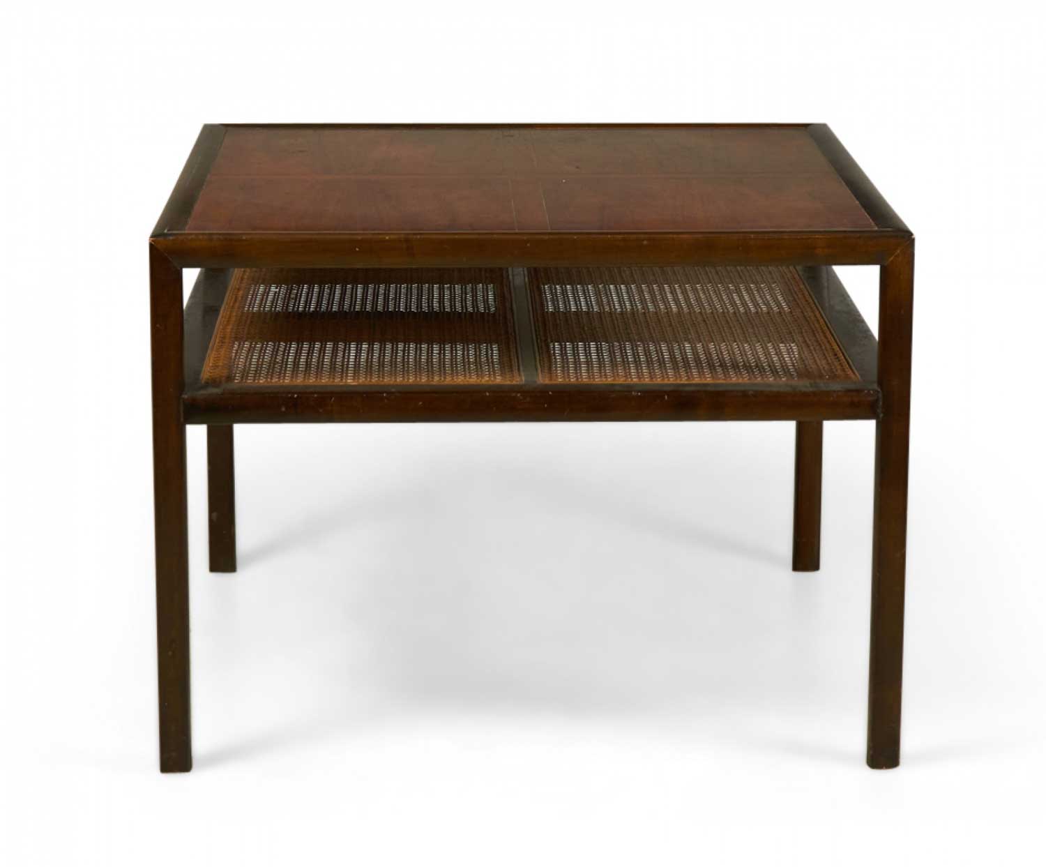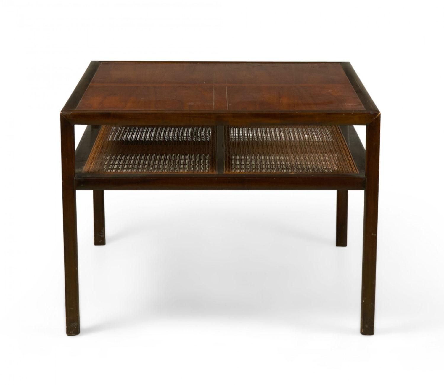 American Mid-Century 'New World' square lamp / end table with a walnut frame, a teak top, and a caned stretcher shelf. (MICHAEL TAYLOR FOR BAKER FURNITURE COMPANY)