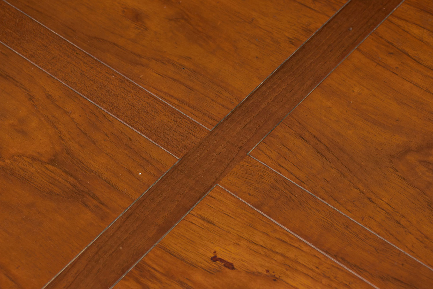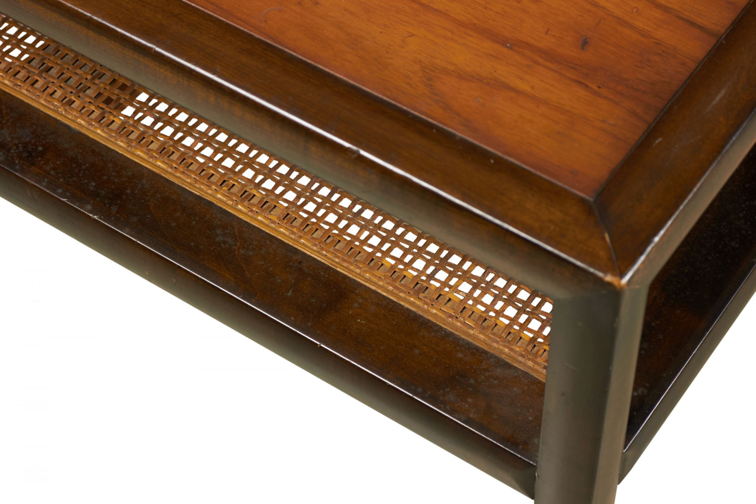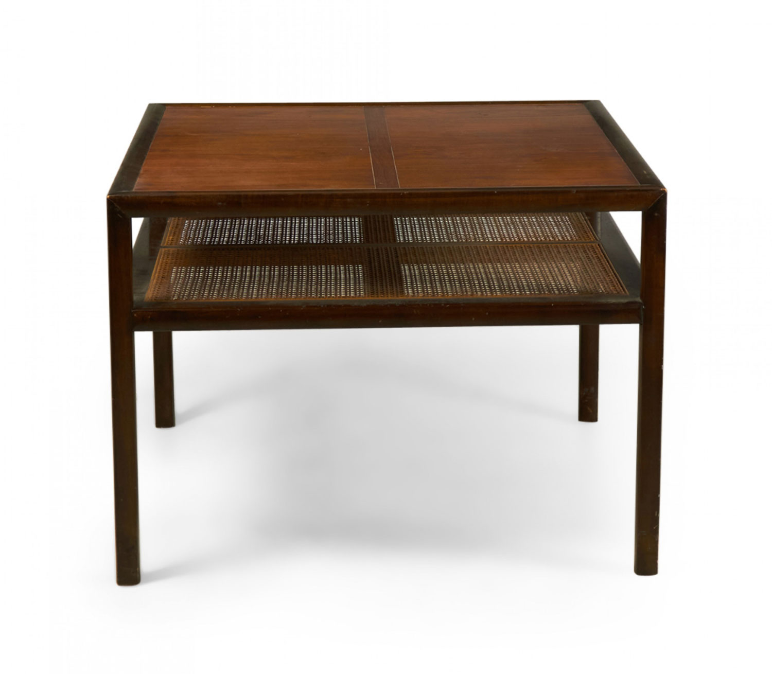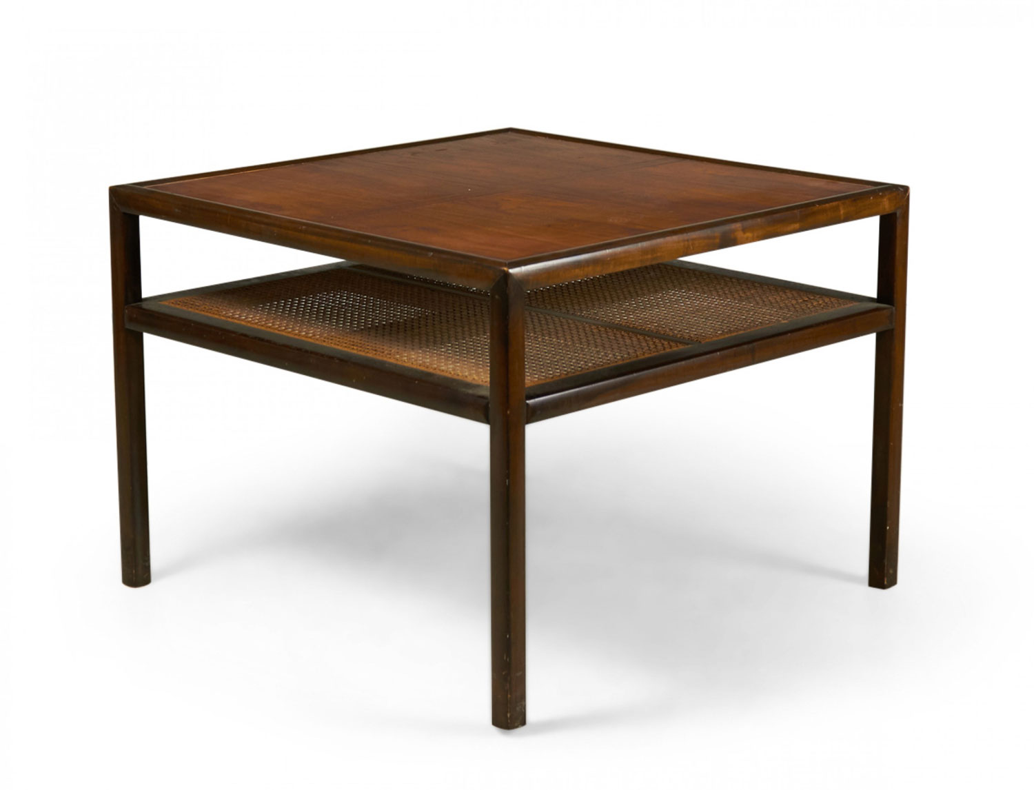 American Mid-Century 'New World' square lamp / end table with a walnut frame, a teak top, and a caned stretcher shelf. (MICHAEL TAYLOR FOR BAKER FURNITURE COMPANY)