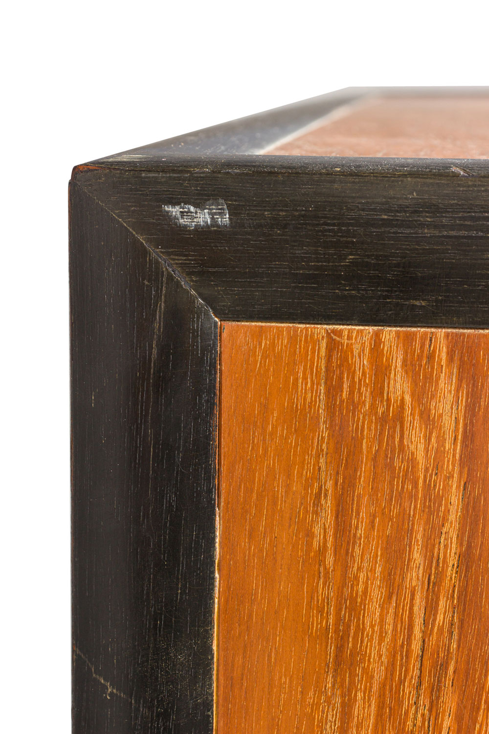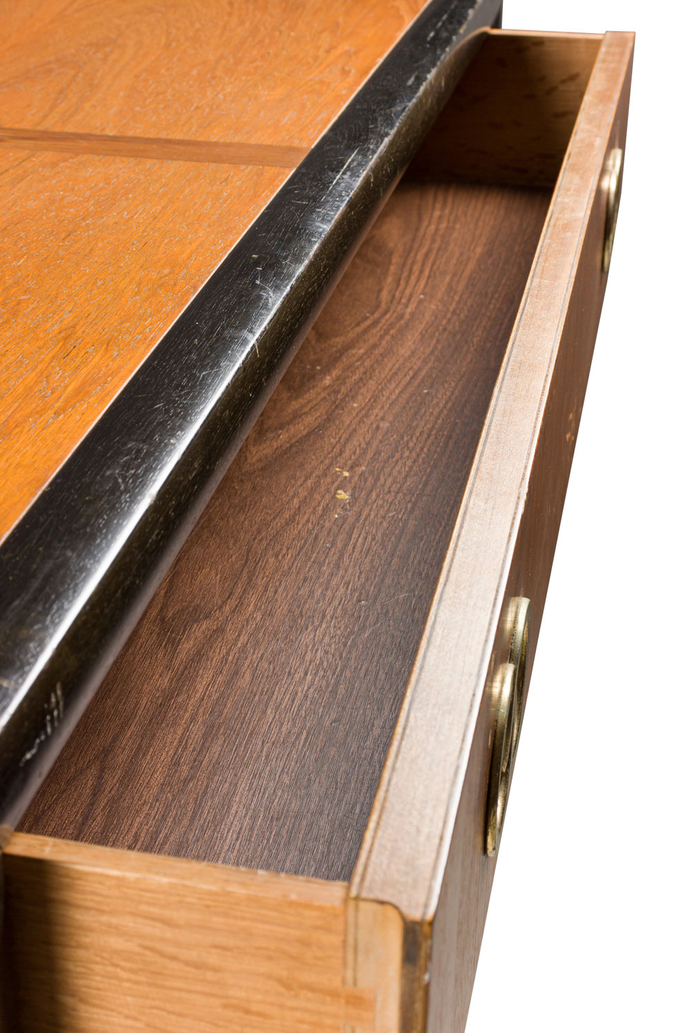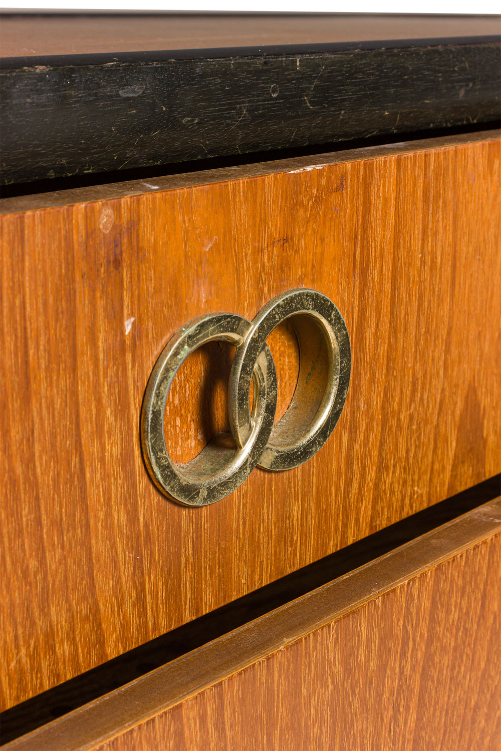 Style: Mid-Century Materials & Techniques: Brass, metal, walnut, wood Category: Cabinets & Case Goods, Bedroom Condition: Water damage to legs. Good; Wear consistent with age and use