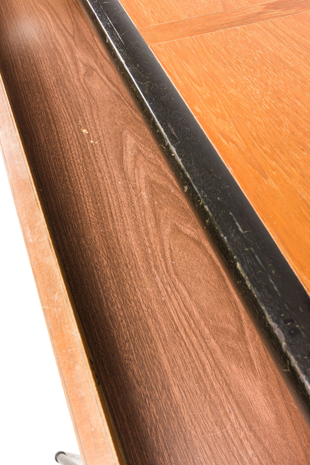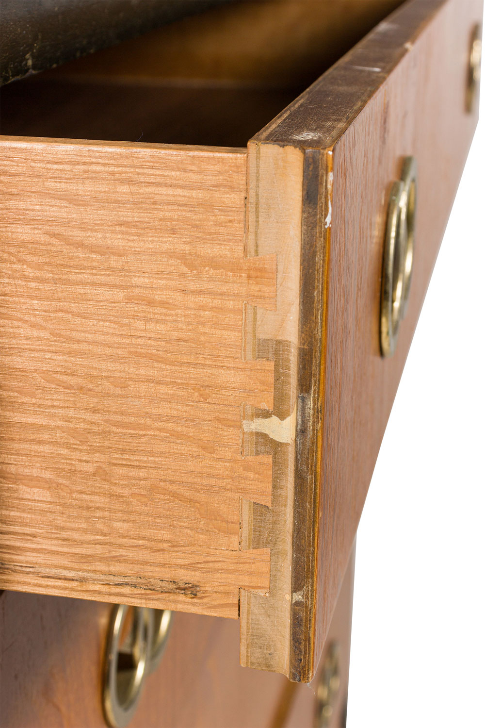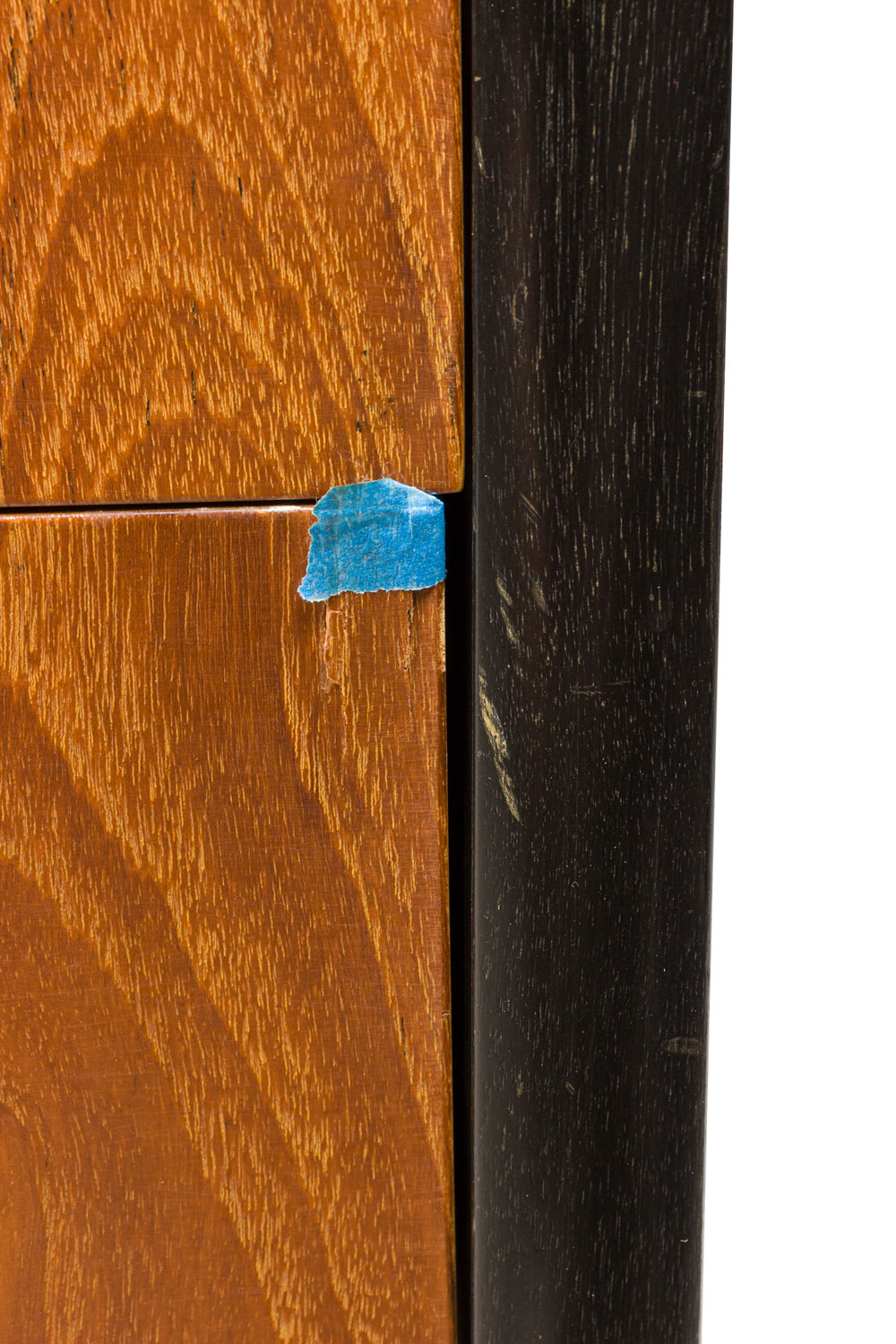 Style: Mid-Century Materials & Techniques: Brass, metal, walnut, wood Category: Cabinets & Case Goods, Bedroom Condition: Water damage to legs. Good; Wear consistent with age and use