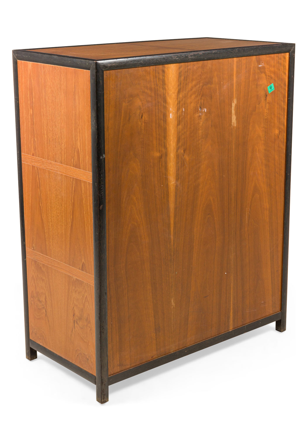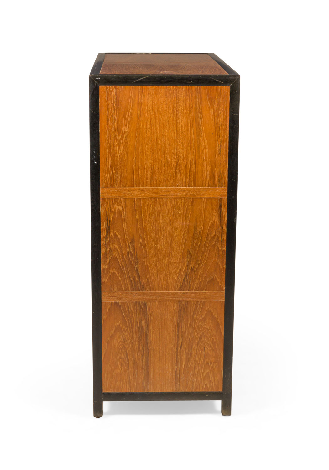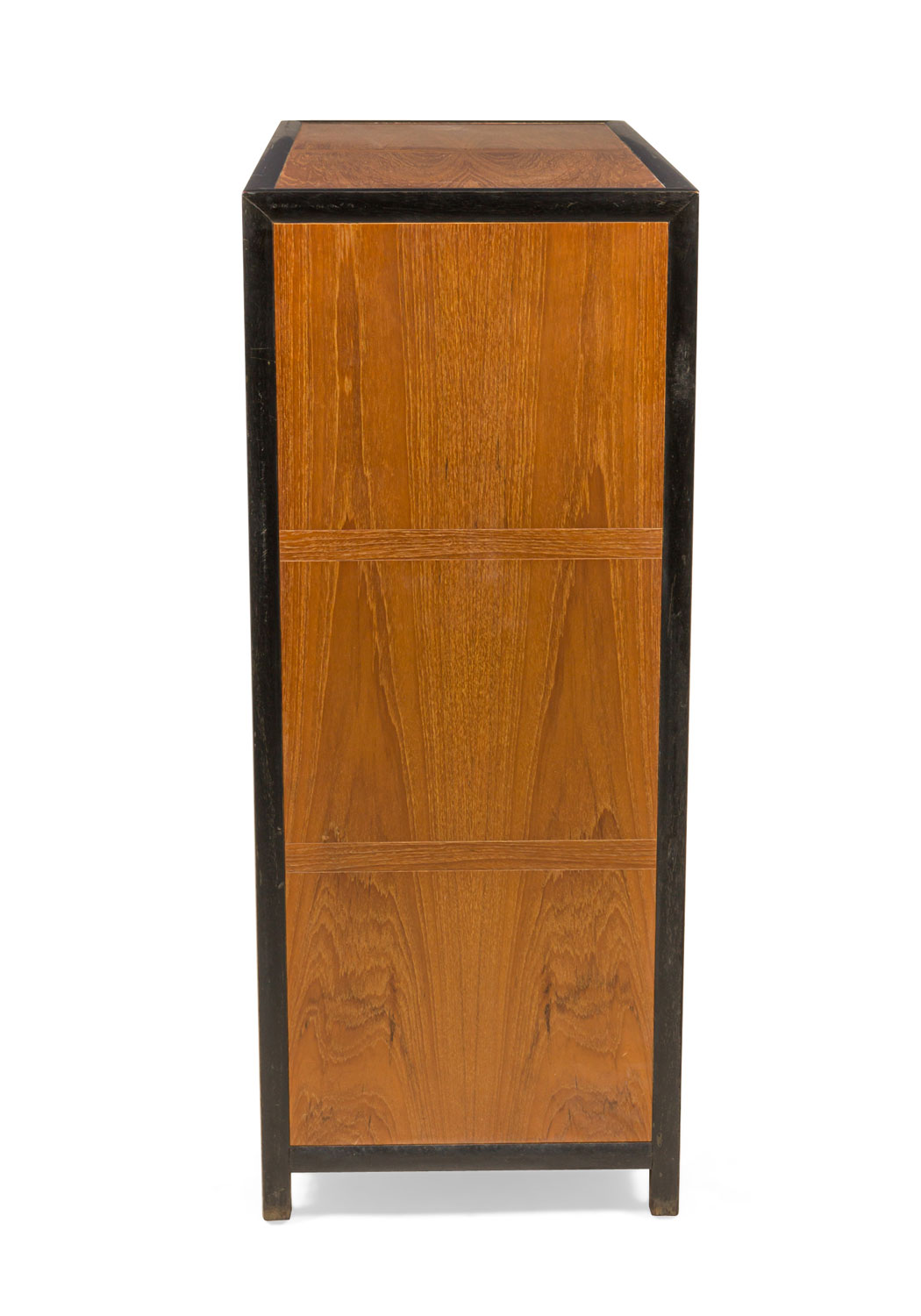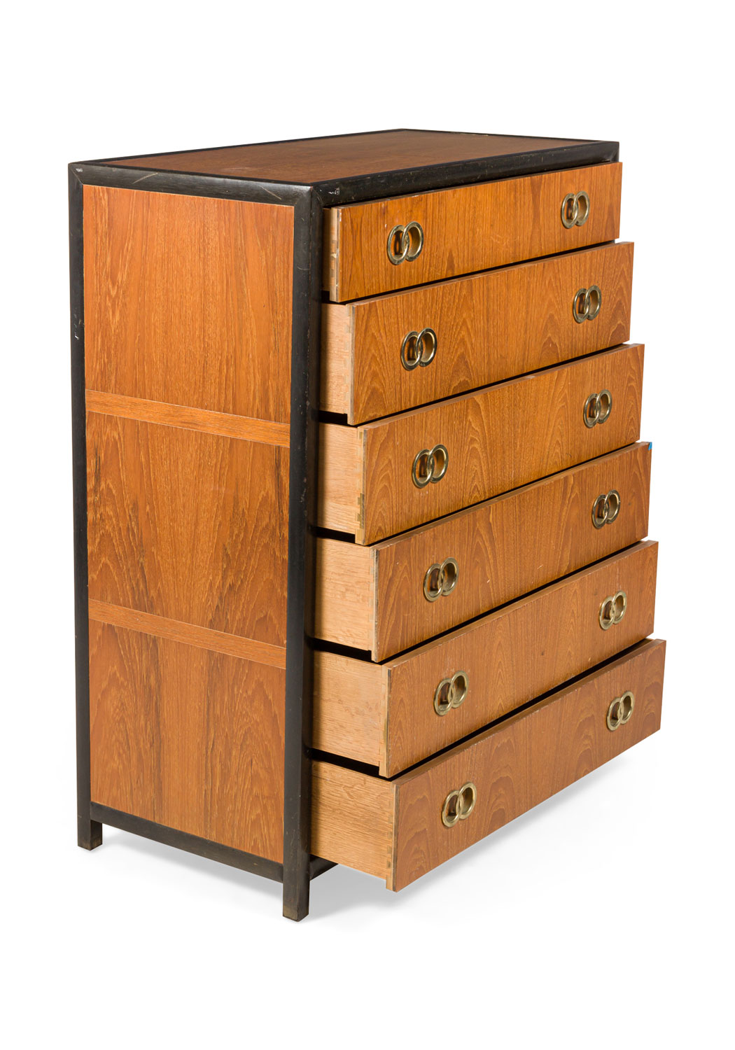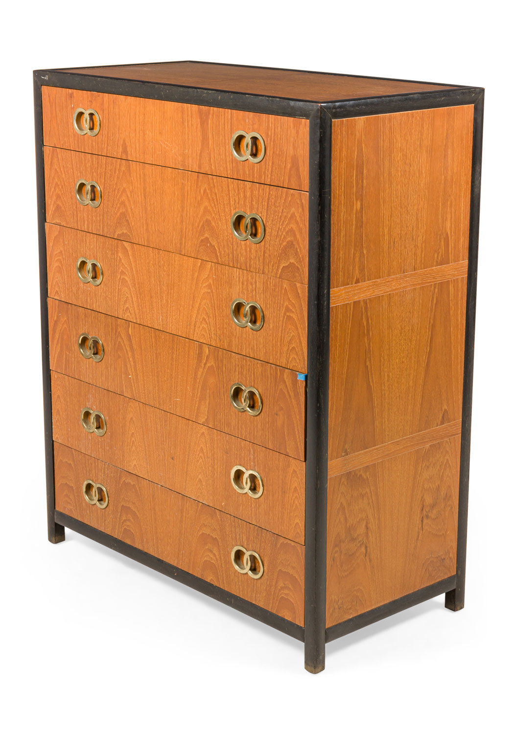 American Mid-Century 6-drawer high chest with a dark stained frame and walnut drawer fronts and body with brass interlocking ring inset drawer pulls. (MICHAEL TAYLOR FOR BAKER FURNITURE CO)