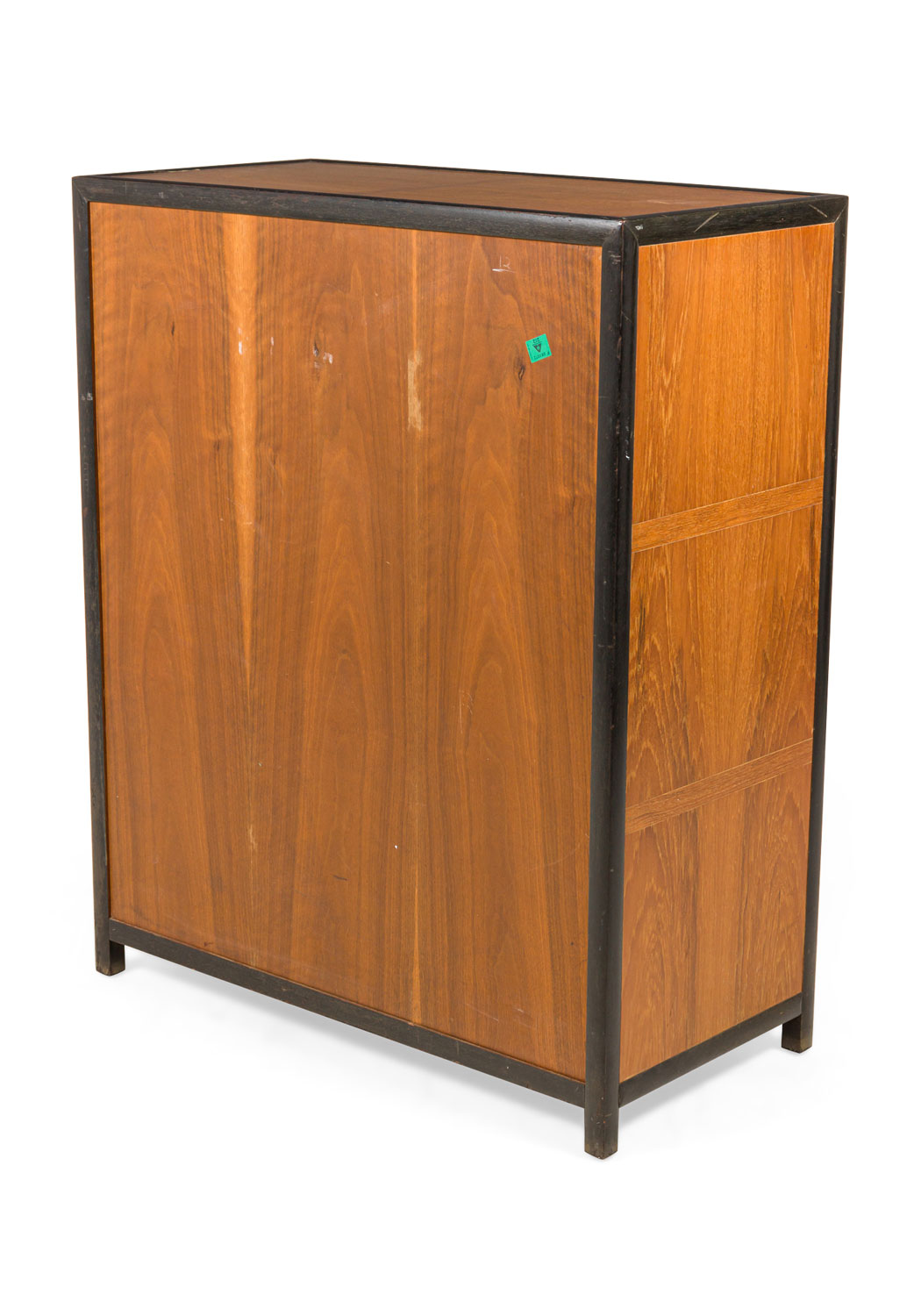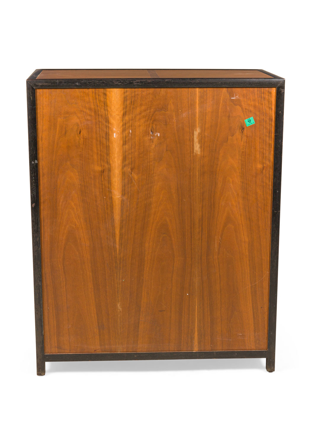American Mid-Century 6-drawer high chest with a dark stained frame and walnut drawer fronts and body with brass interlocking ring inset drawer pulls. (MICHAEL TAYLOR FOR BAKER FURNITURE CO).