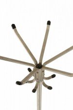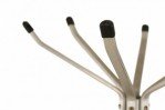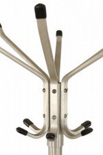 Mid-Century aluminum hat rack / coat tree with an iron circular base and two sets of metal hooks with black rubber tips.
