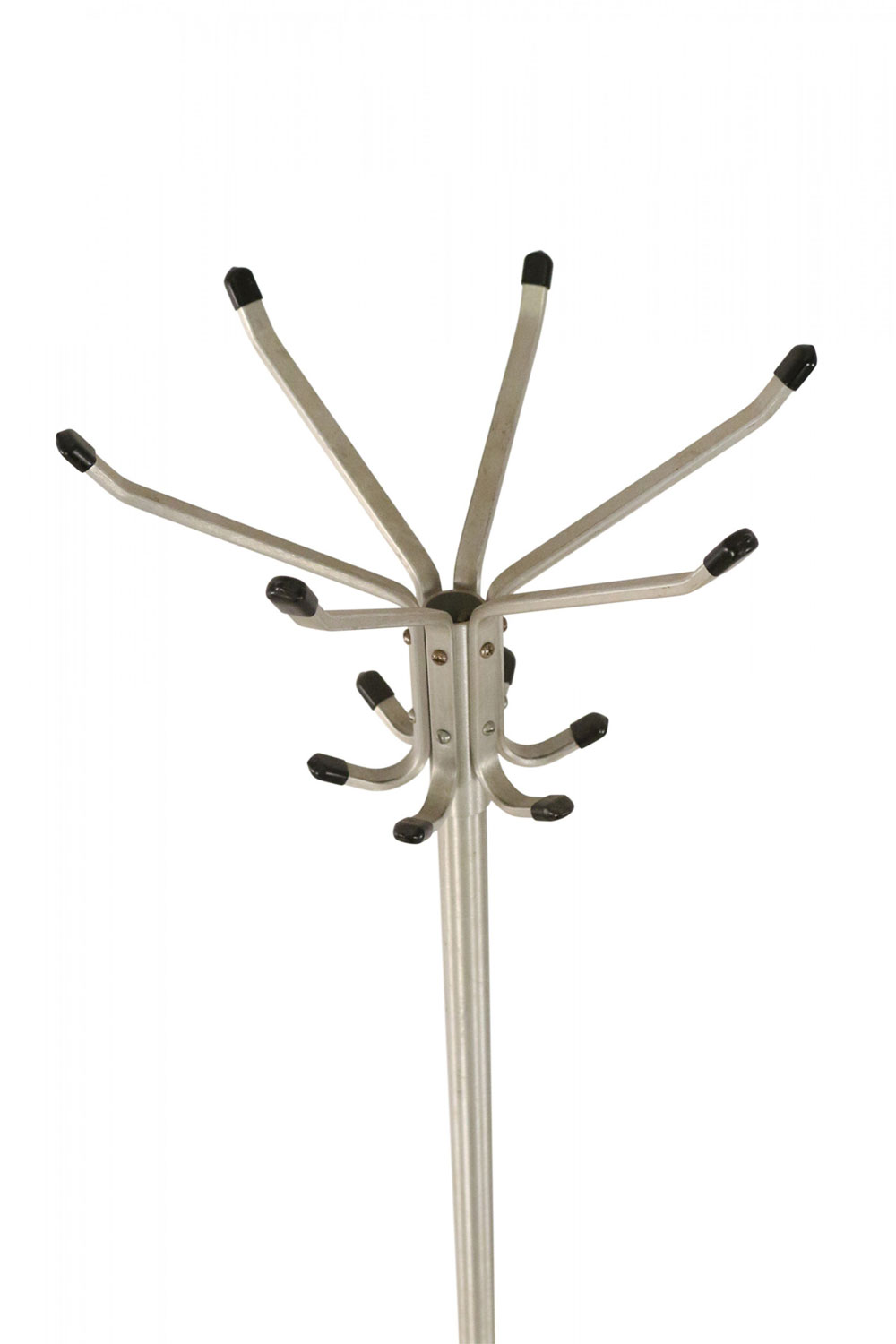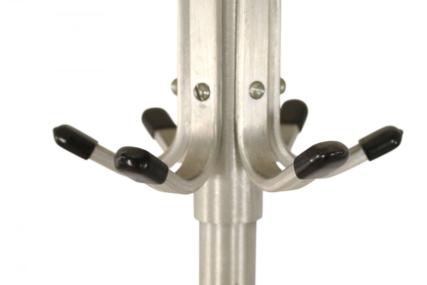 Mid-Century aluminum hat rack / coat tree with an iron circular base and two sets of metal hooks with black rubber tips..