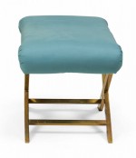 Mid-Century x-bench with a brass frame topped with a teal cotton upholstered seat. (Same benches with different upholstery: DUF0056-DUF0060).