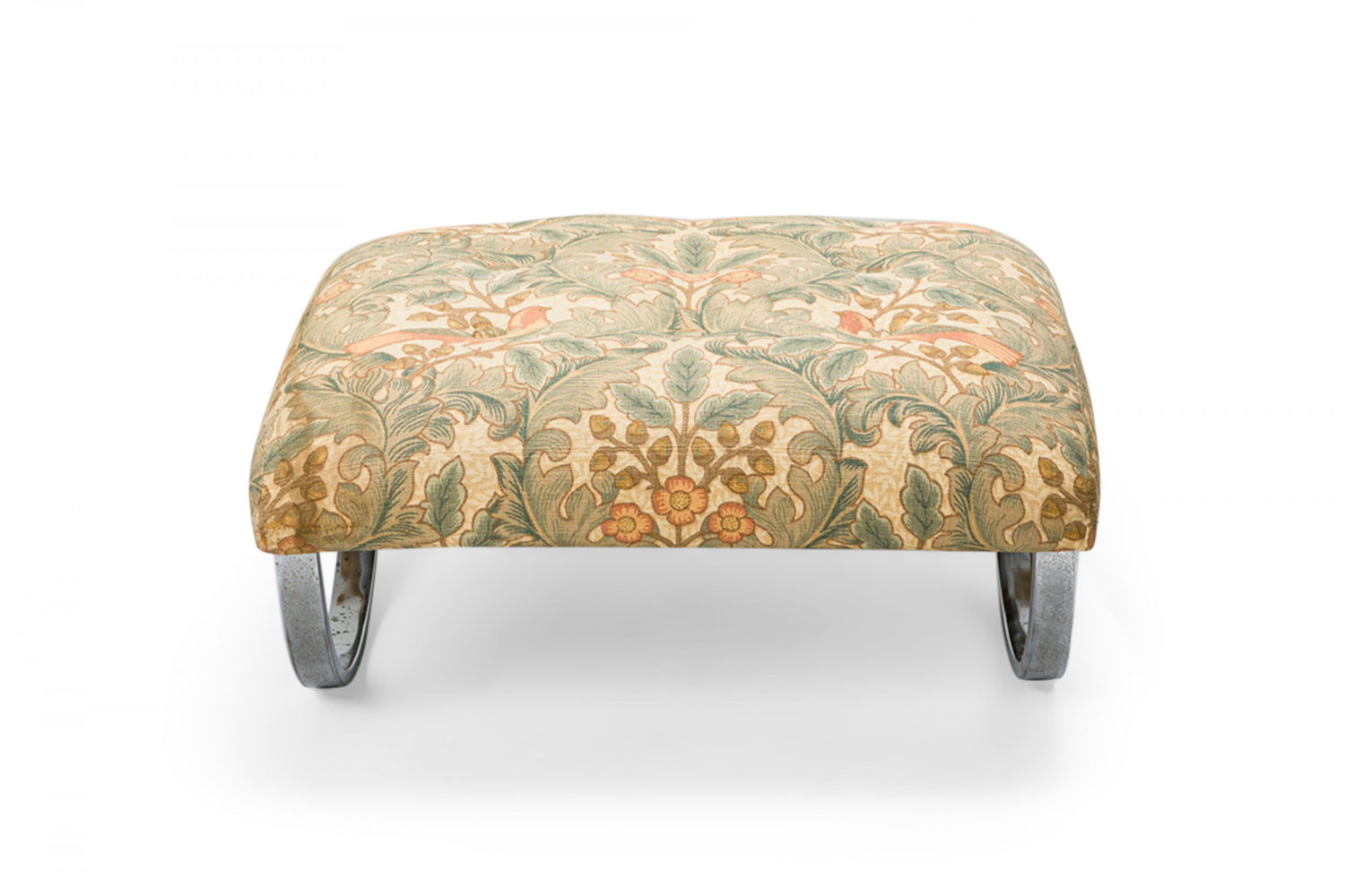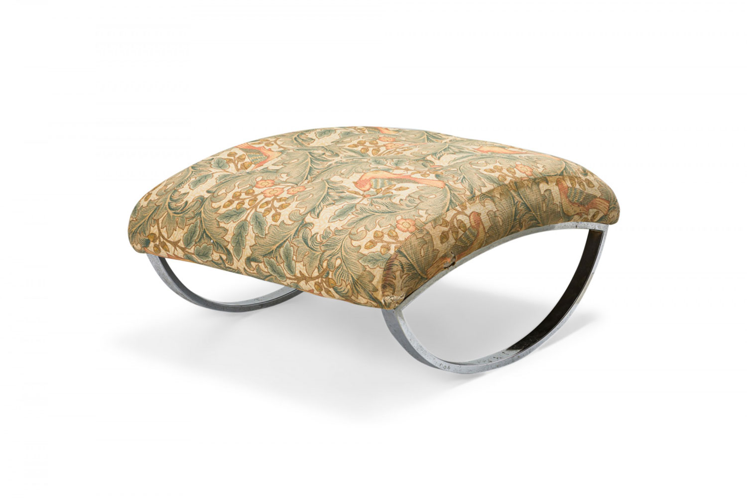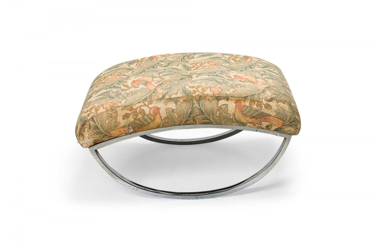 Mid-Century American rocking ottoman with a rounded square beige, blue, and pink, bird and foliage upholsterd seat over 2 curved chrome frame supports.
