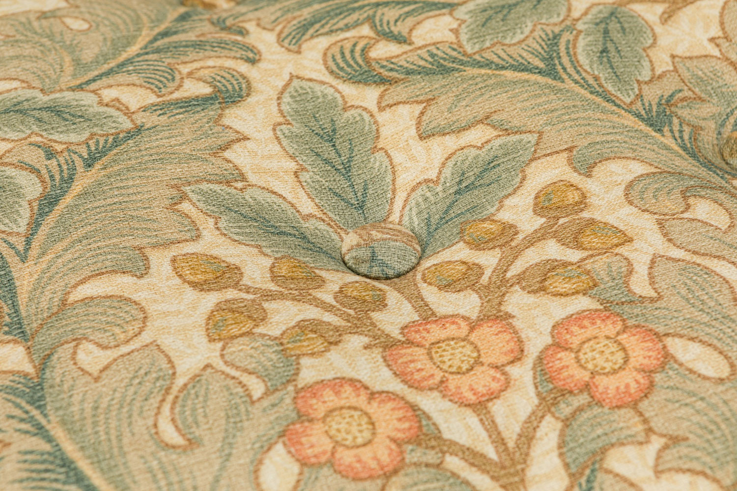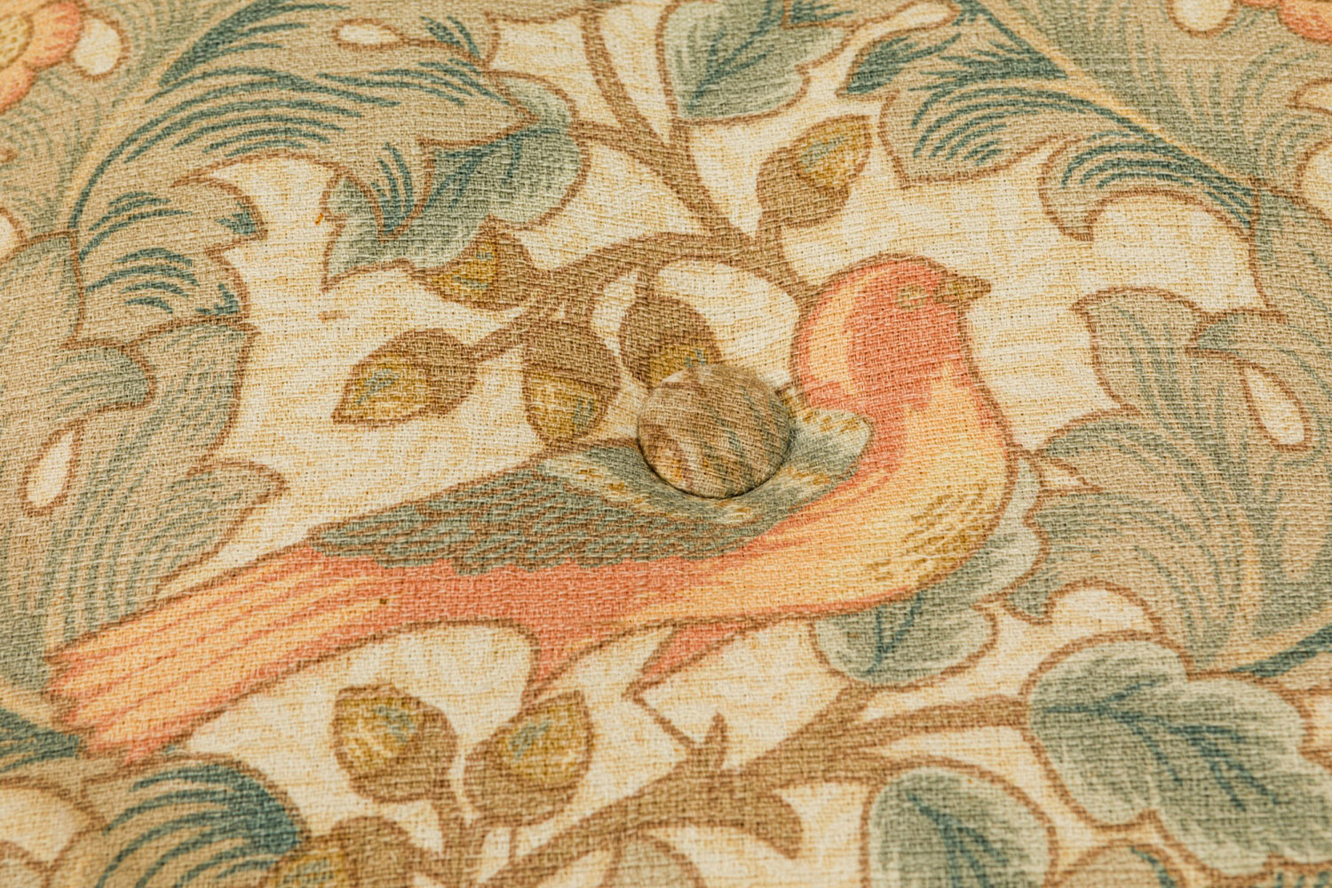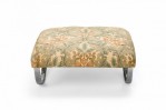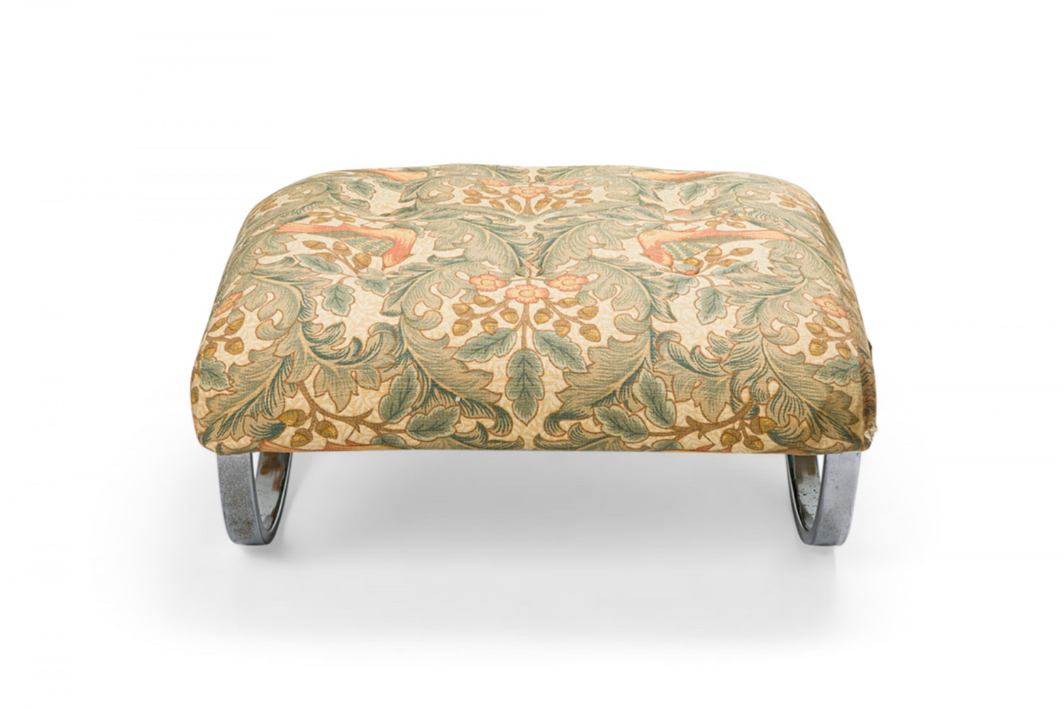 Mid-Century American rocking ottoman with a rounded square beige, blue, and pink, bird and foliage upholsterd seat over 2 curved chrome frame supports.